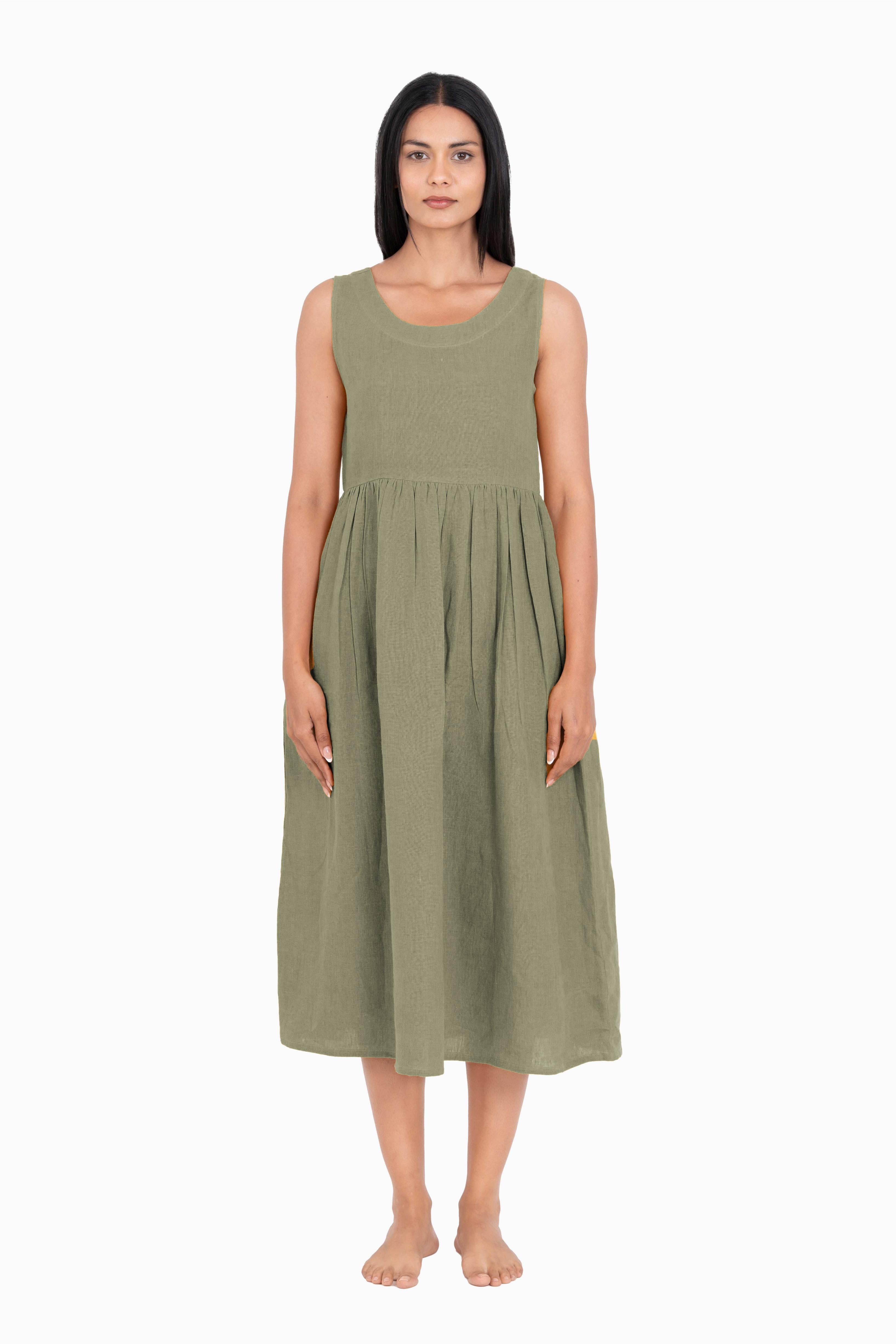 Our Linen Achill Dress is a gorgeous sleeveless dress with the round neckline. The waistline creased with subtle pleats brings volume to the entire look. This easy-to-slip dress is harmonizing and perfect for any weather. Explore our European Linen collection today!