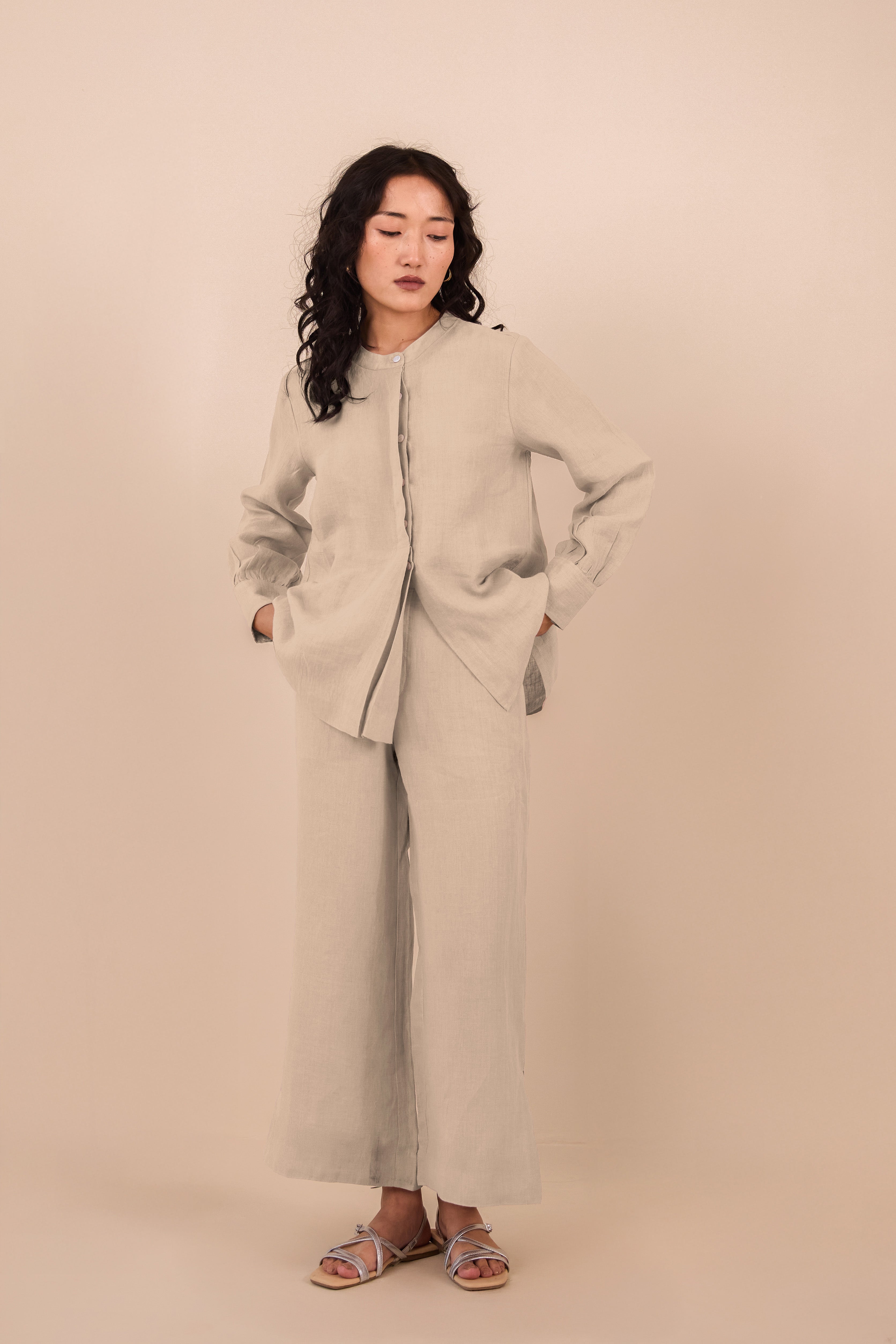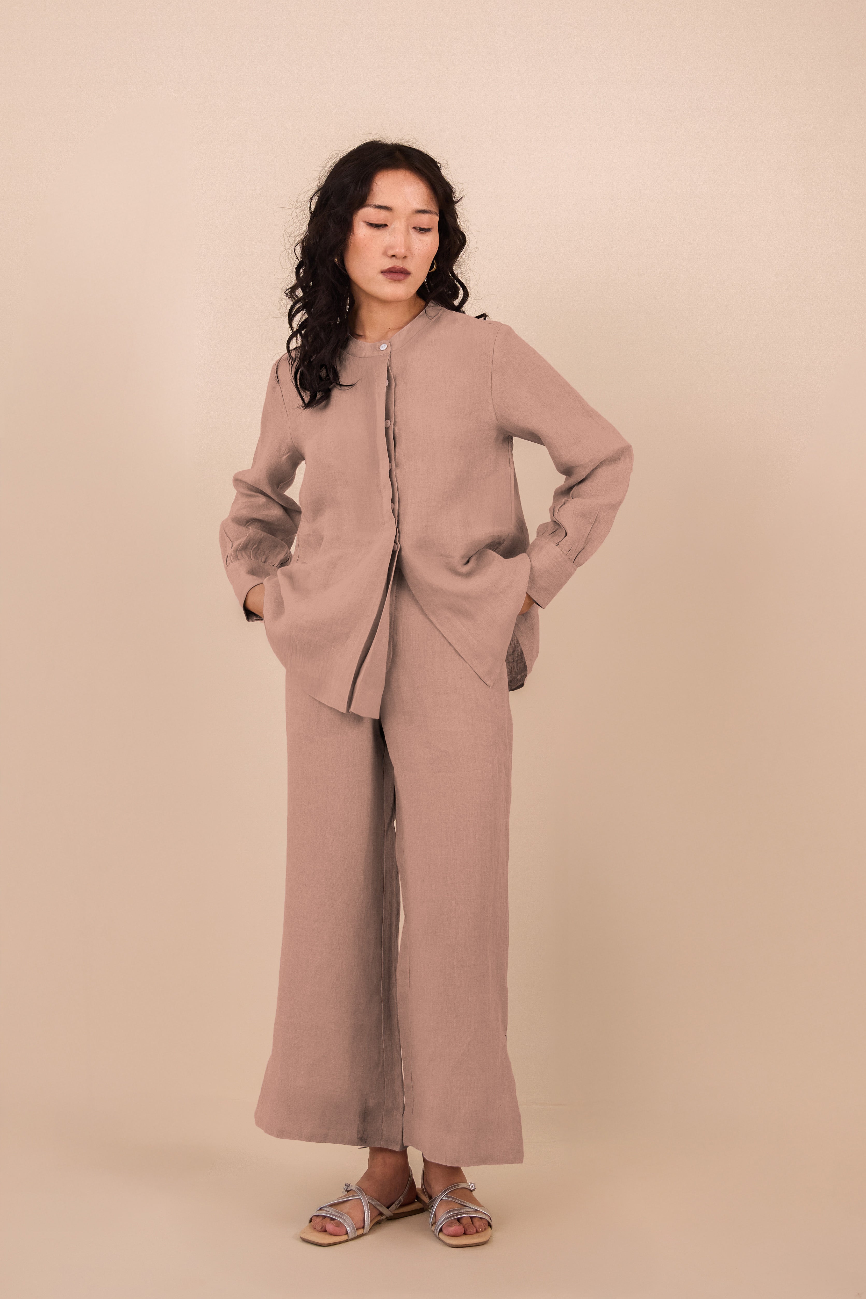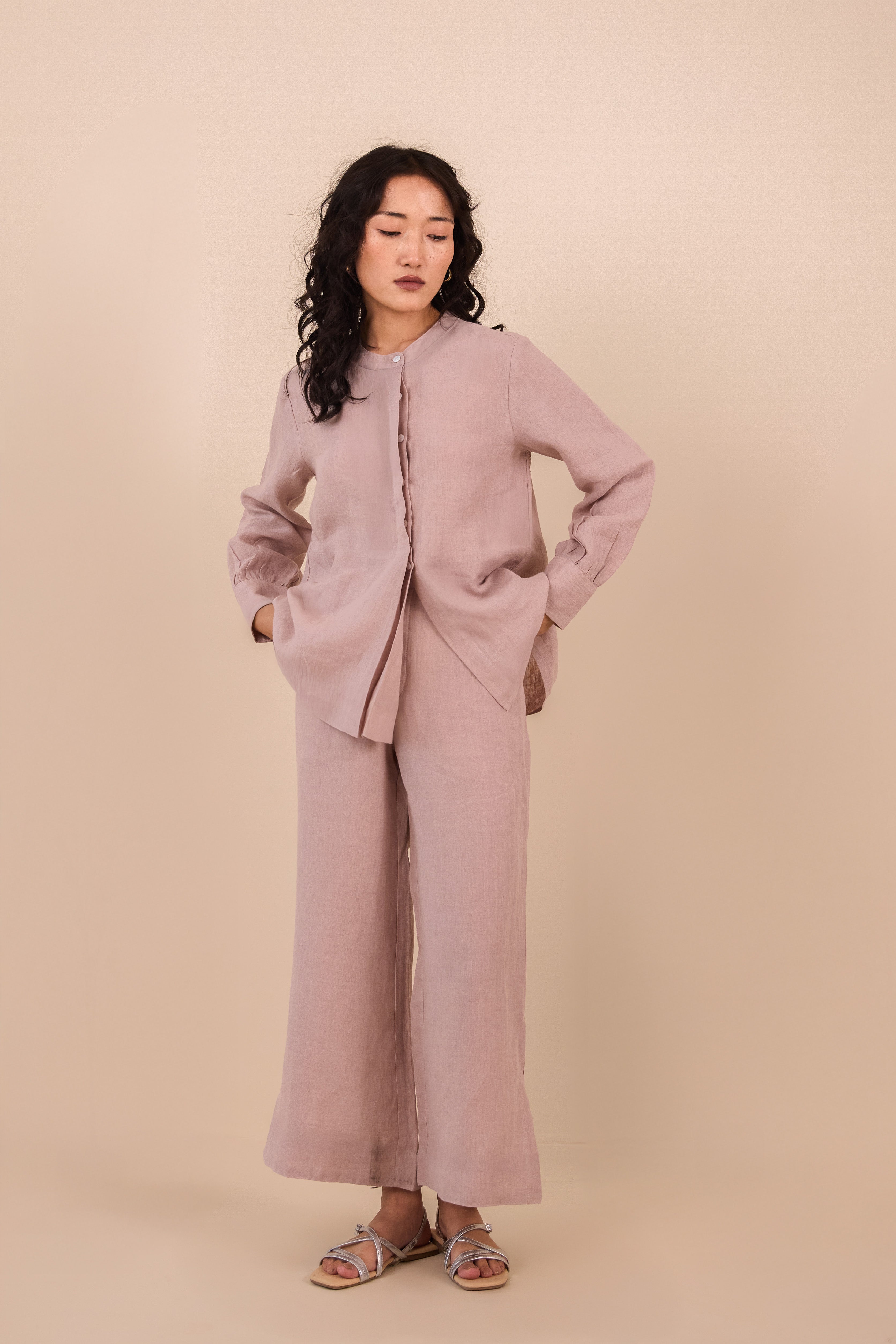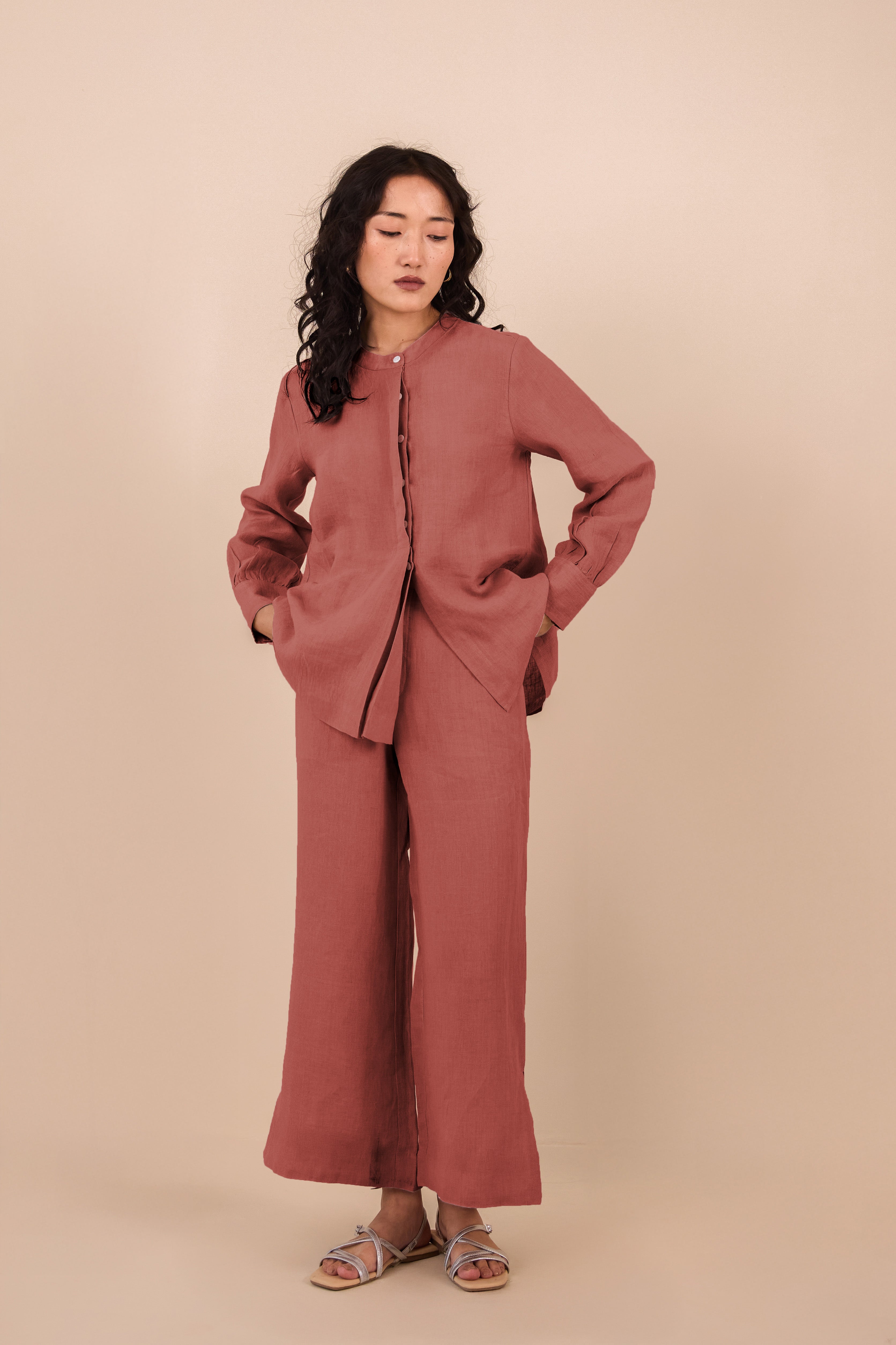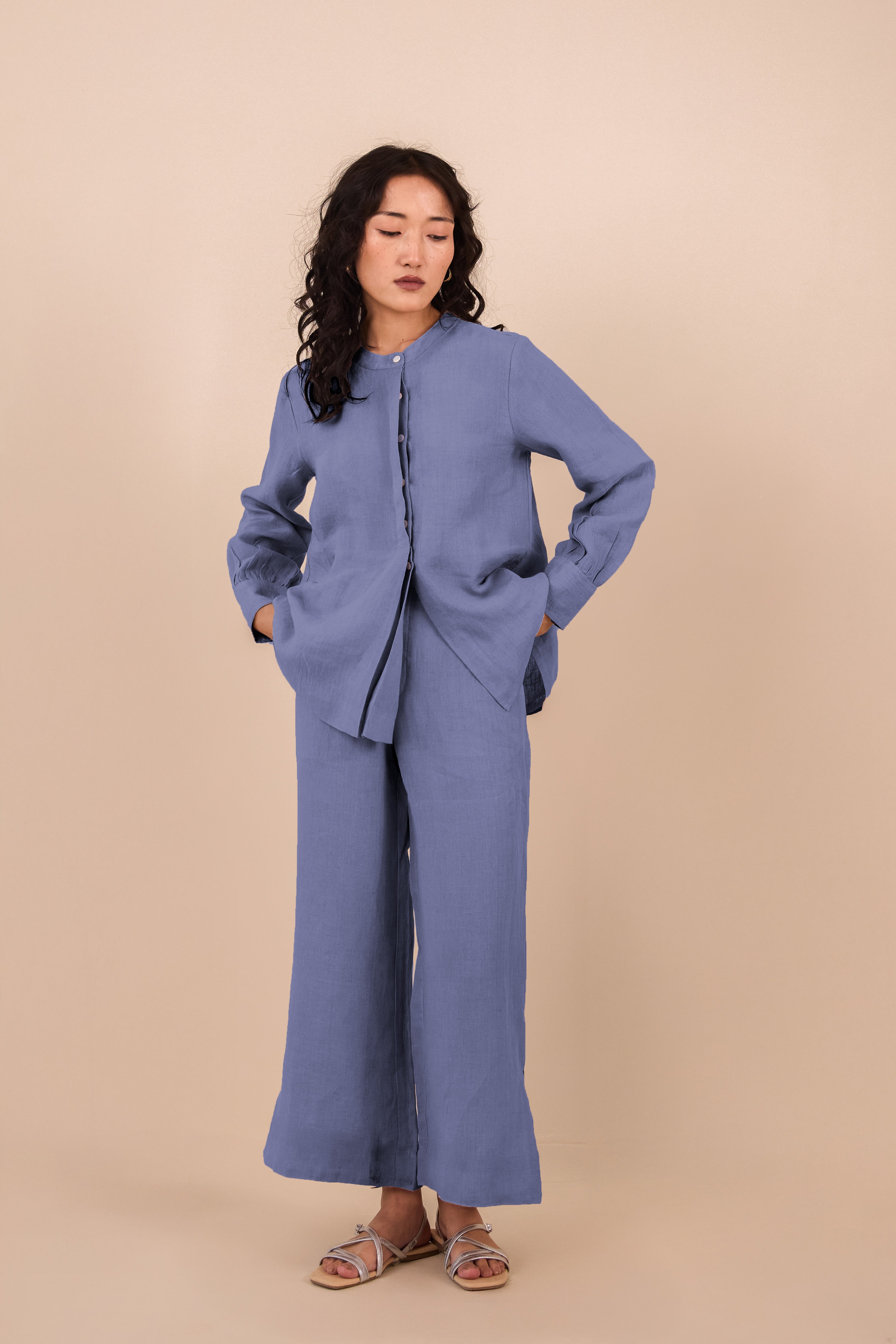Explore our Linen Annie Co-ord with a band collar and unique hidden placket of shell buttons. The pants come with a tiny slit, and the shirt has cuffs with gathered pleats. Add this adorable co-ord set to your daily dose of fashion.