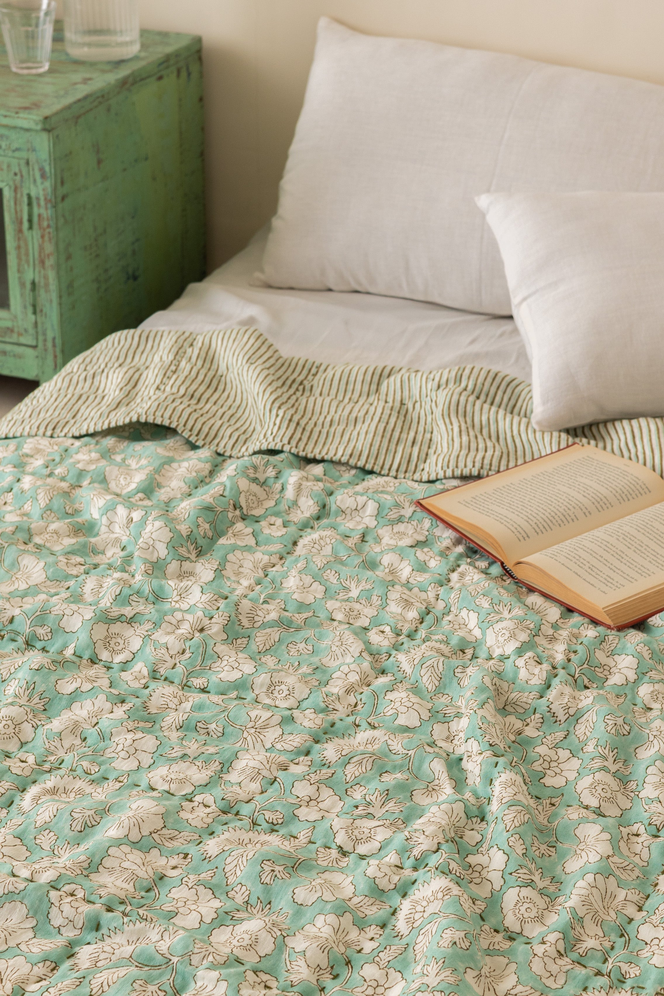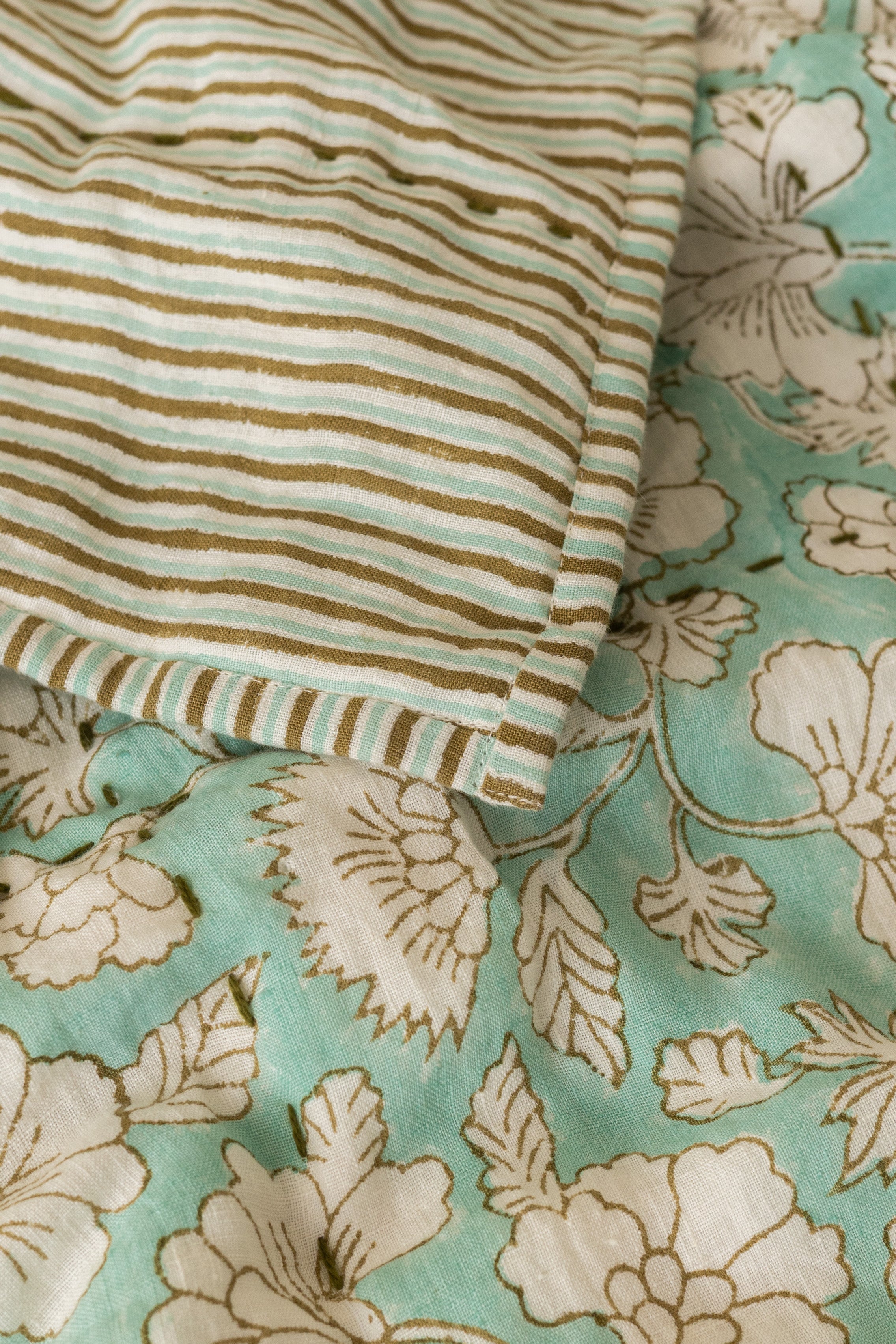 Experience the perfect blend of comfort and Luxury with Live Linen Quilted Linen Athena Quilt. Our Linen Athena Quilt offers a luxurious feel that will elevate your bedroom into a timeless luxury.The Linen-rich fabric provides a soft and breathable touch. Designed to be hand block floral print on one and stripes pattern on the other side, which offers the versatility to switch up your bedroom’s look, allowing you to enjoy two distinct styles from the same set. Whether you’re looking to unwind in comfort or refresh your room’s aesthetic, this bedspread Linen Athena Quilt promises to transform your bedroom into a stylish haven you'll love coming home to.