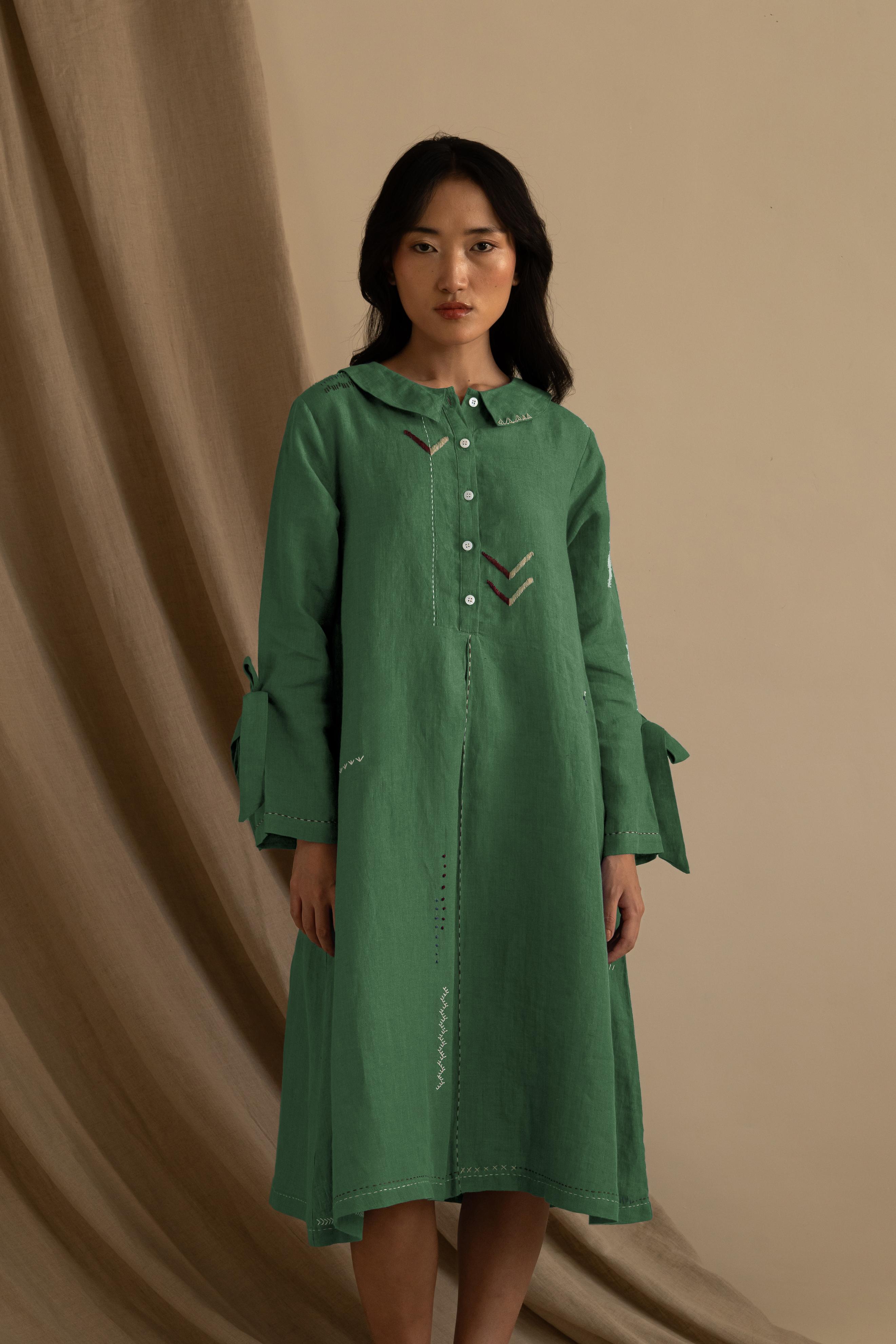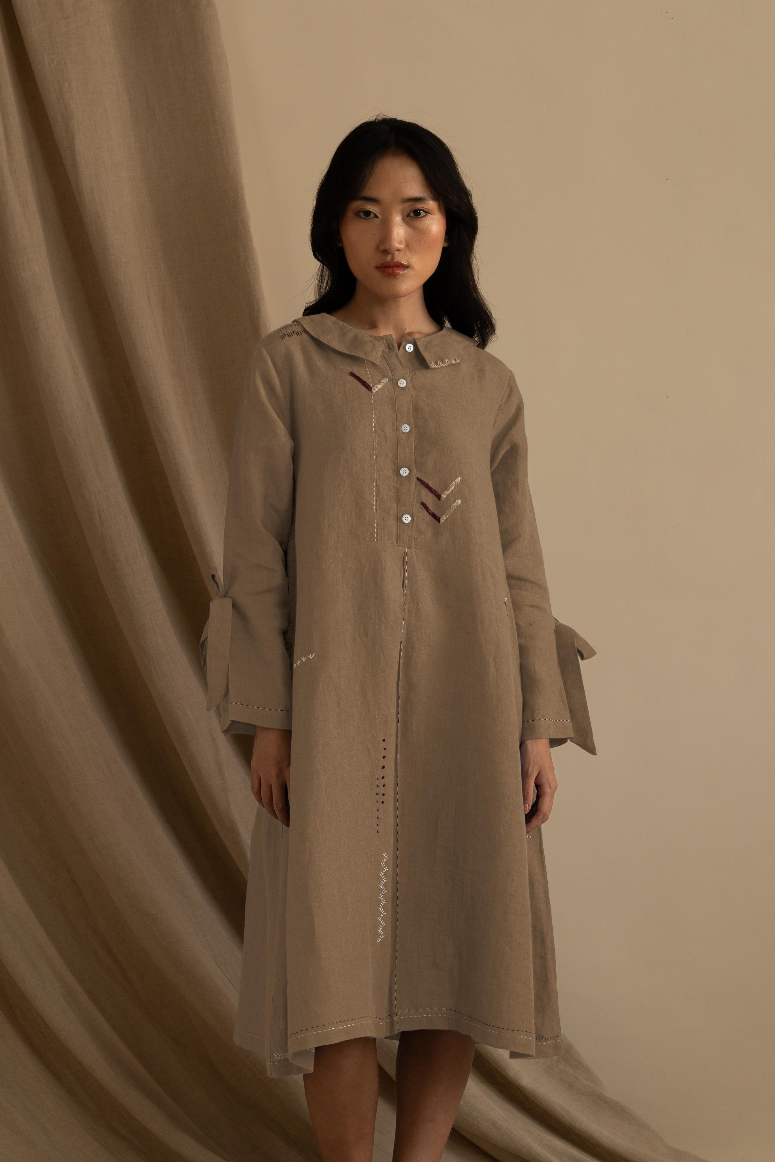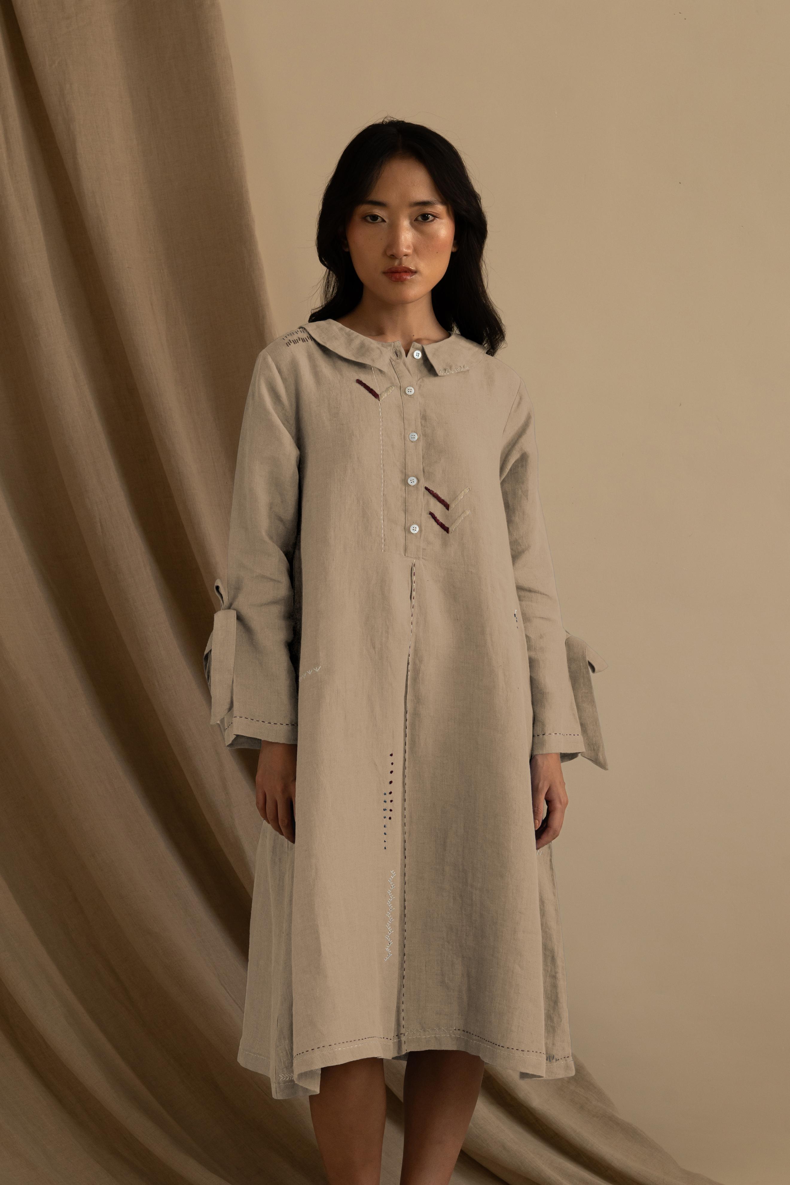 There is something pretty about our Linen Aurelia Dress. It is a simple midi dress with detailed handwork around the collar and length running down. With sweet little knots around the sleeves, this dress catches attention smoothly.