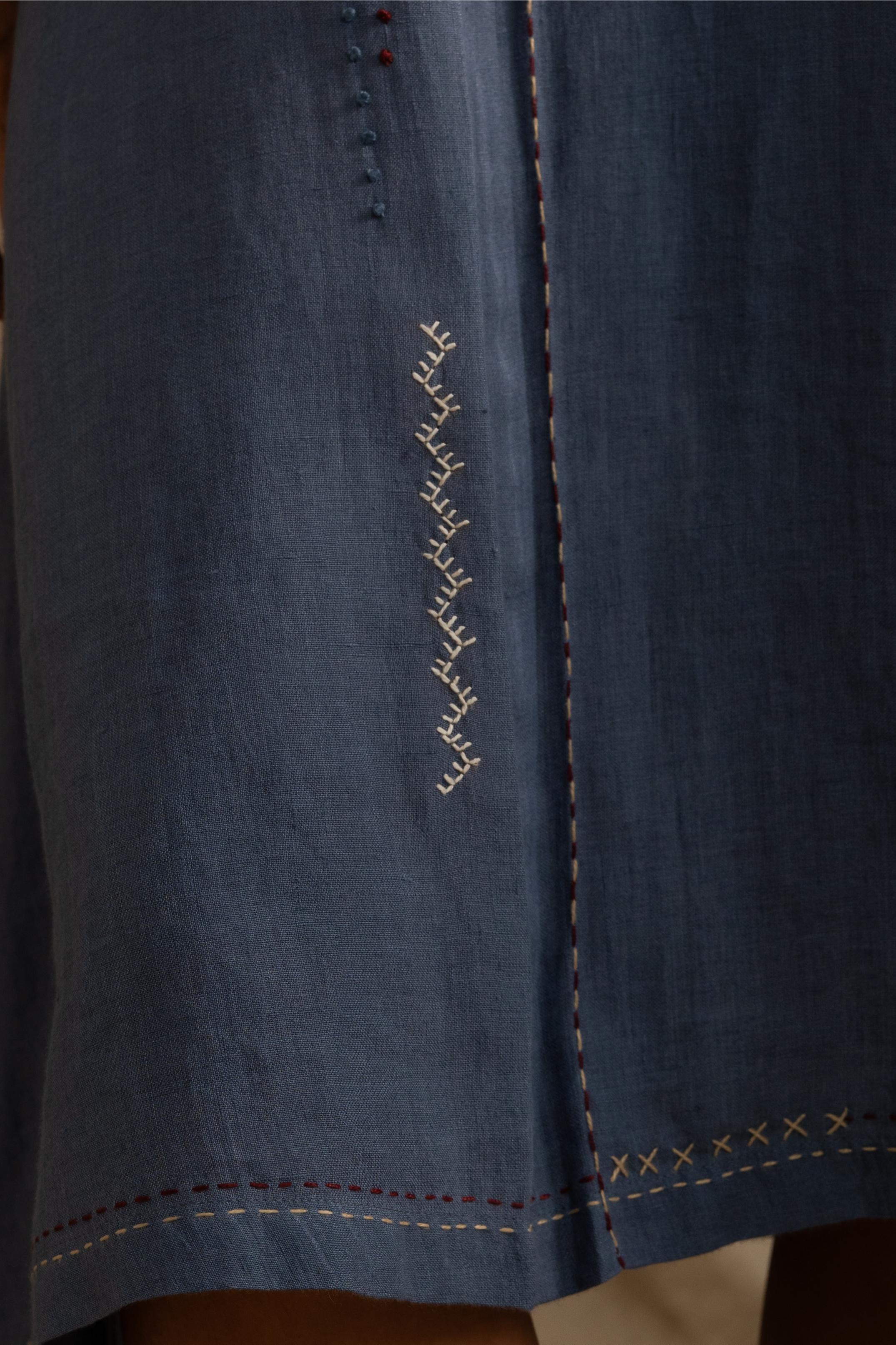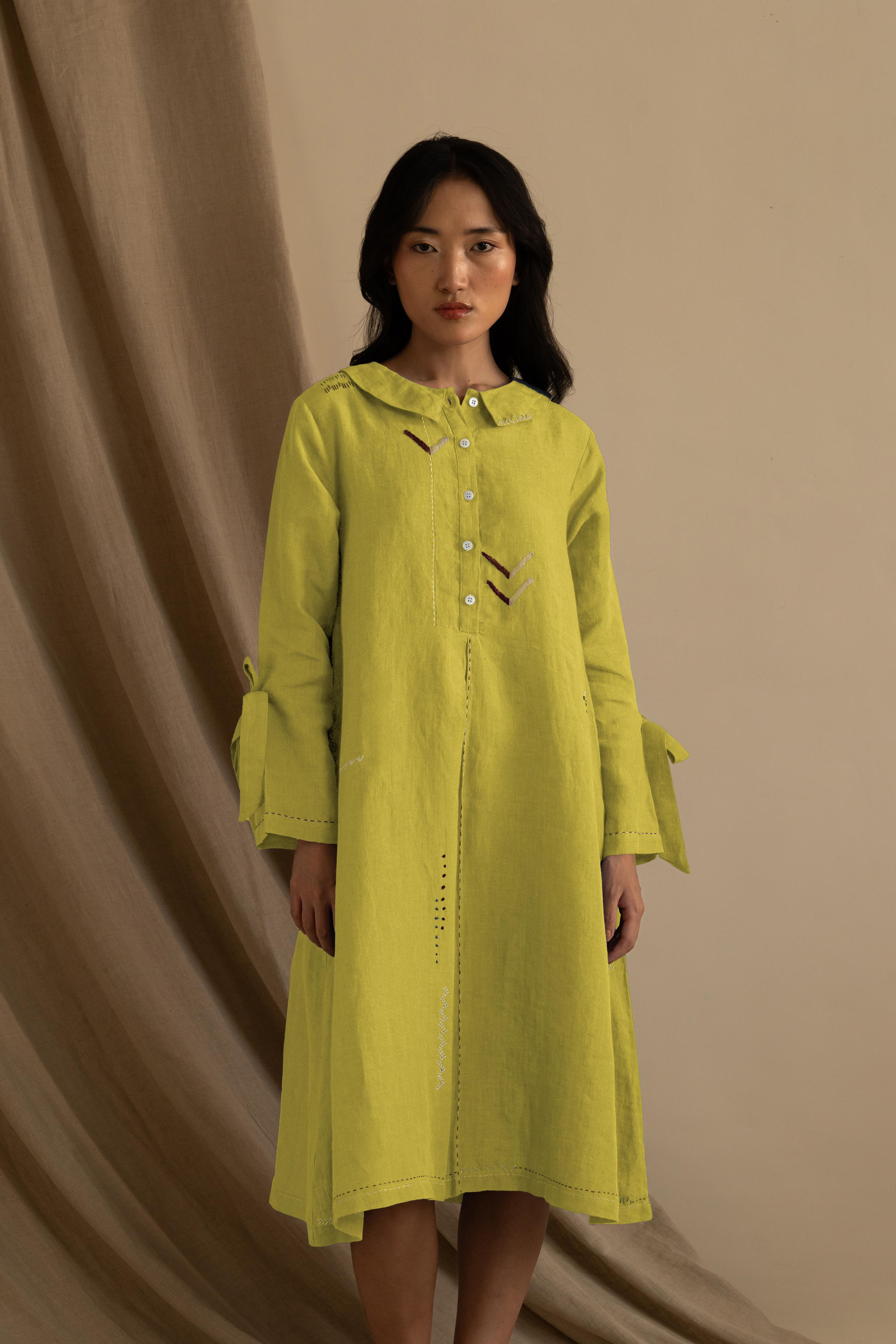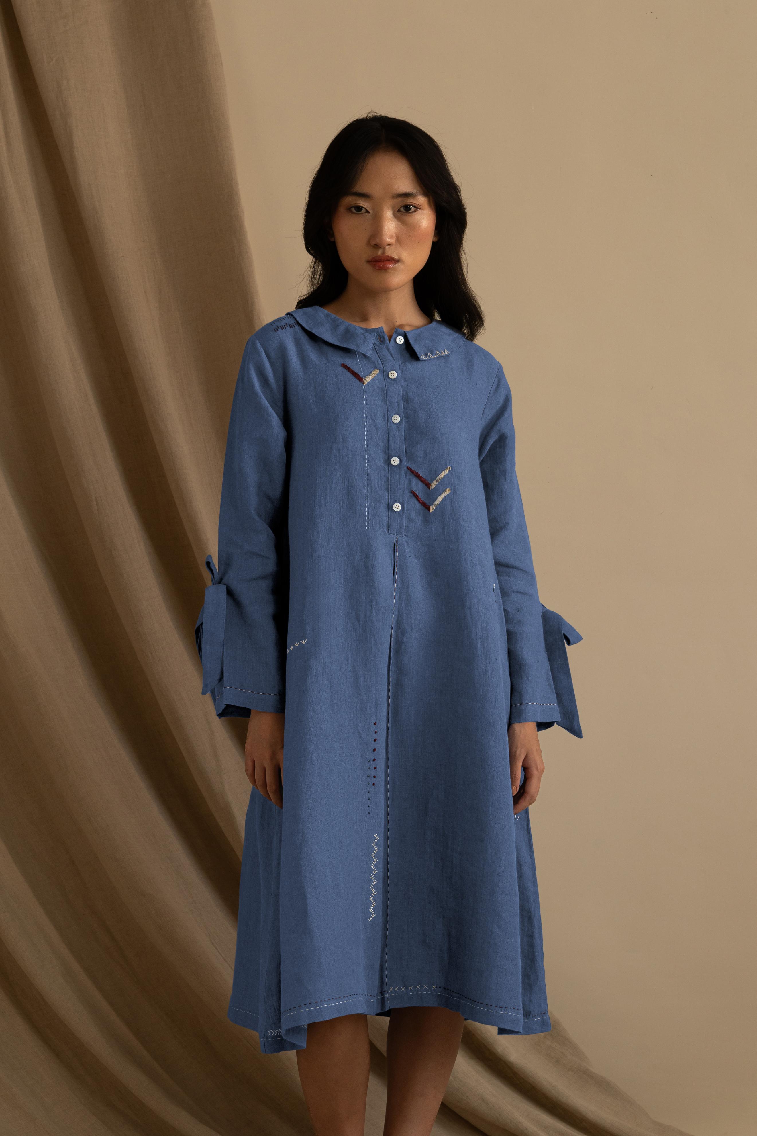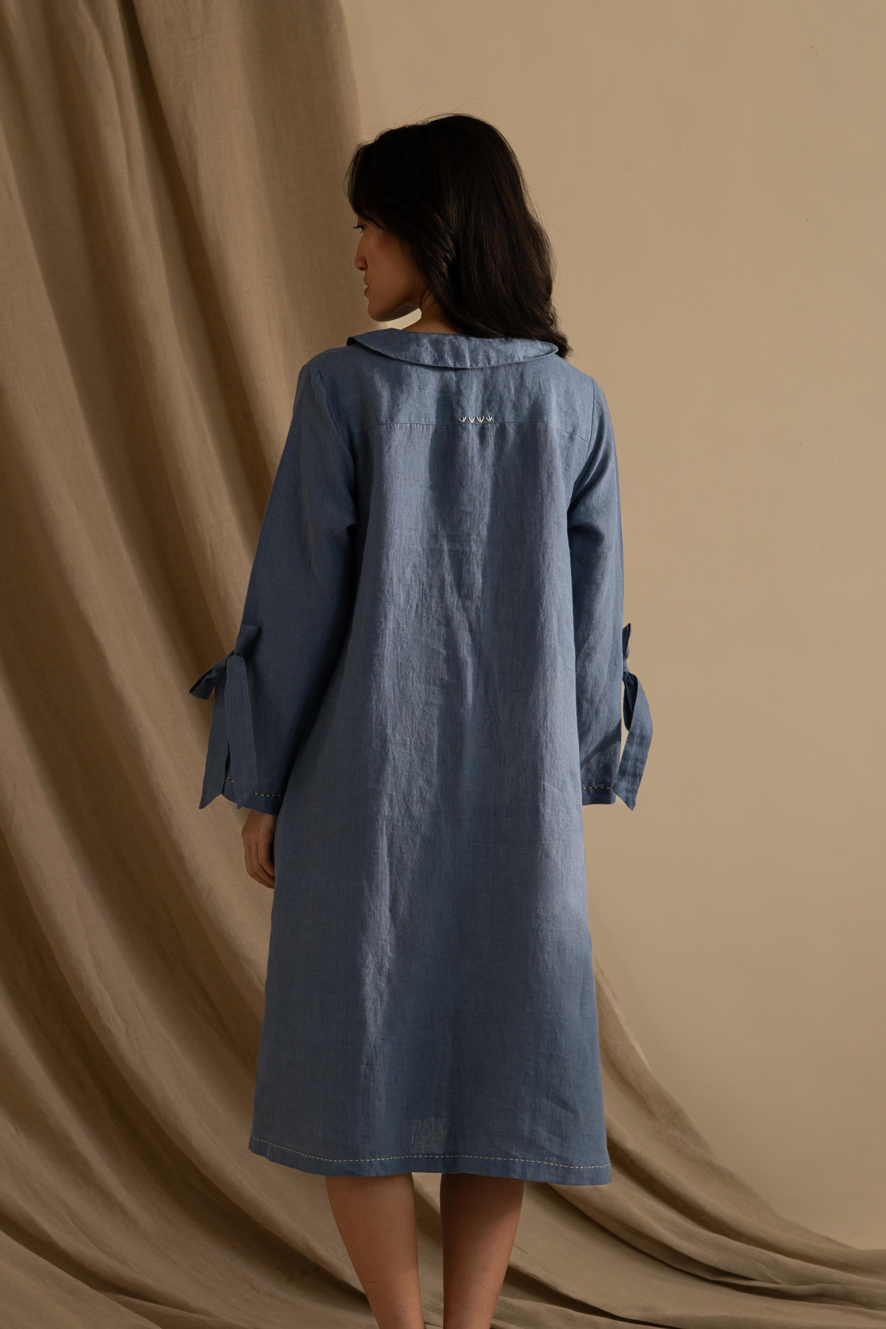 There is something pretty about our Linen Aurelia Dress. It is a simple midi dress with detailed handwork around the collar and length running down. With sweet little knots around the sleeves, this dress catches attention smoothly.
