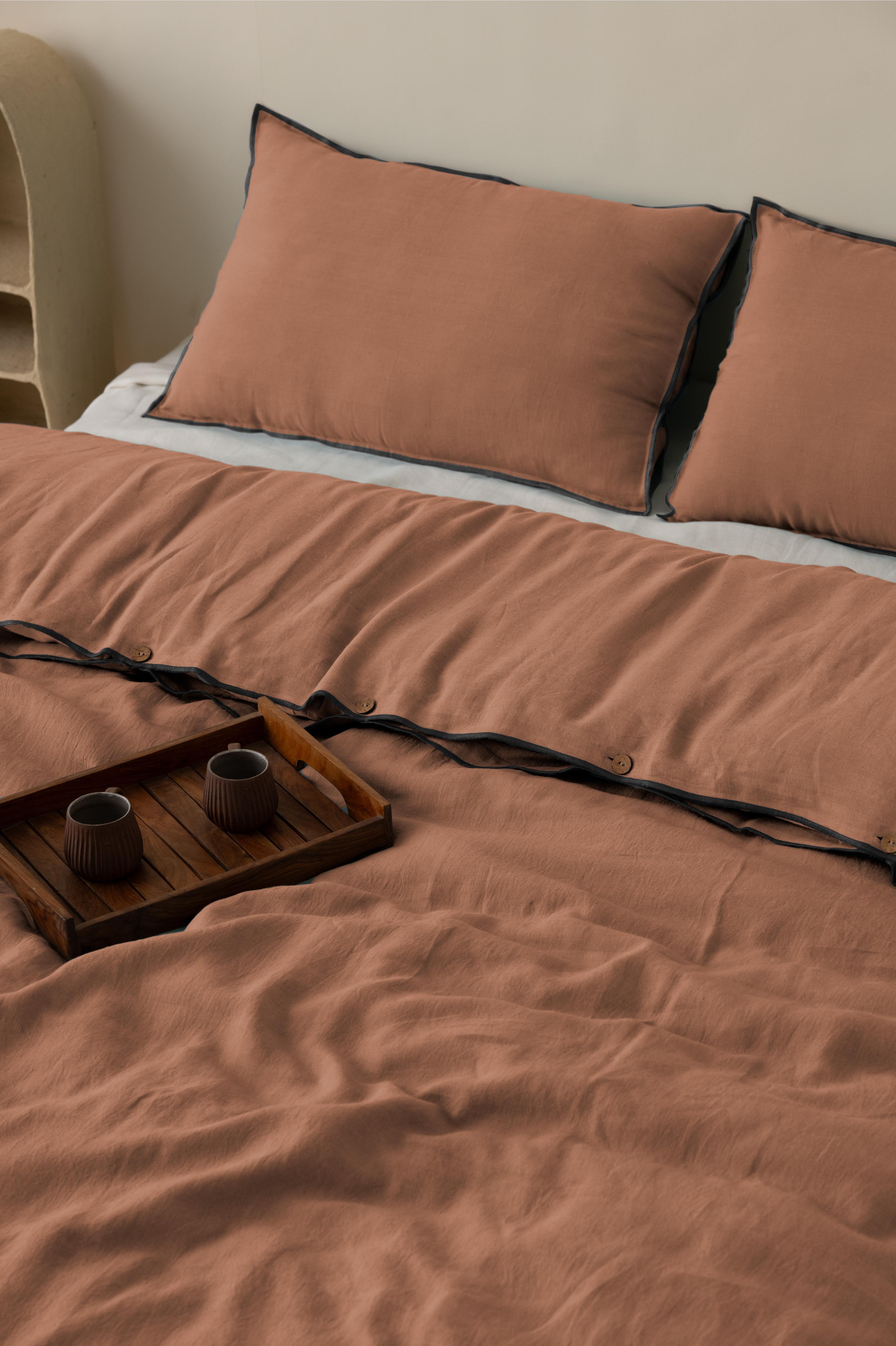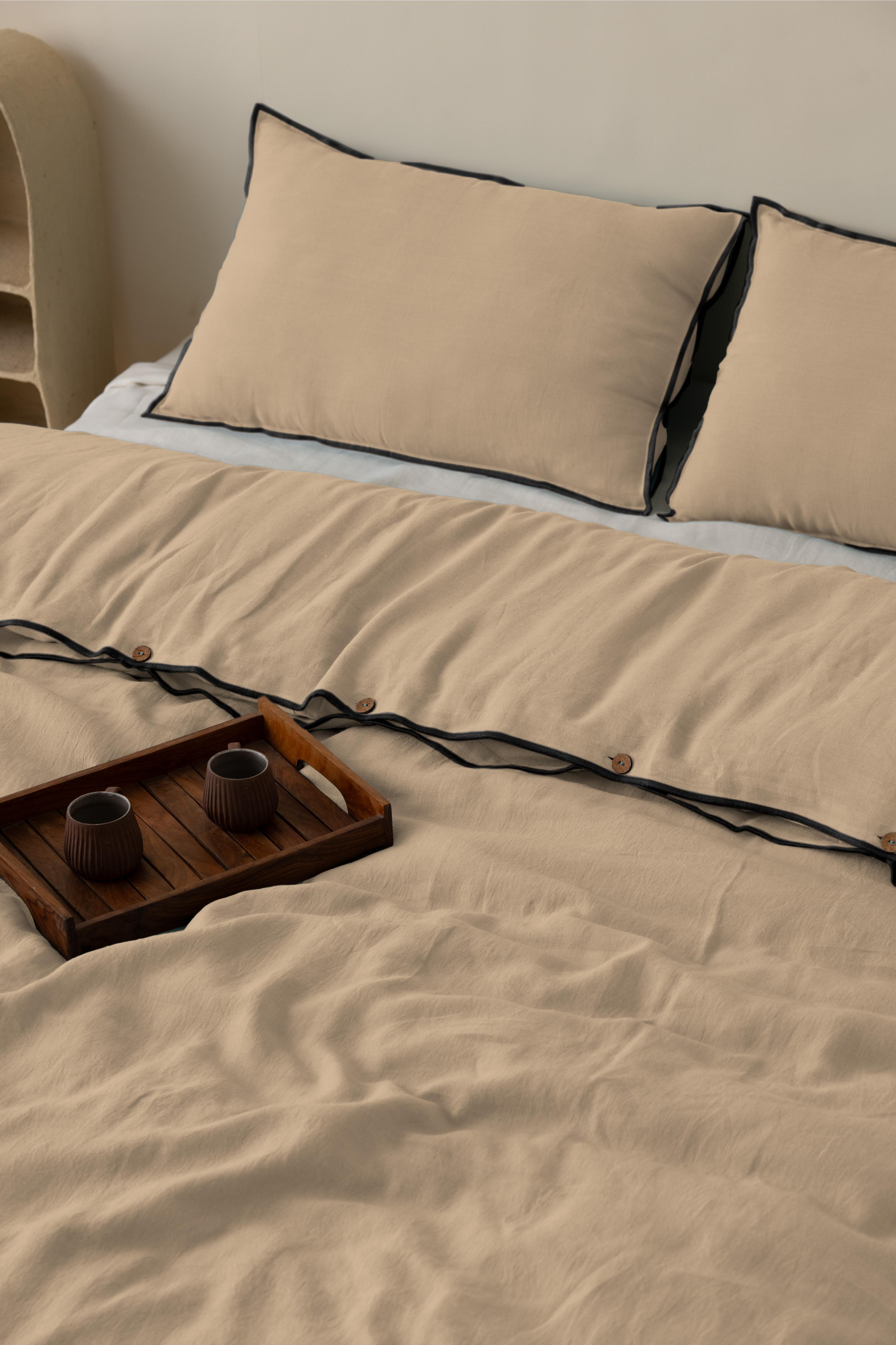 Linen Black Needled Duvet Cover Set in Bottle Green: Presenting our beautiful Linen Black Needled Duvet Cover to create a cloudy heaven in your bedroom. The intricate black needlework around the borders of this comfy creation will easily grab the attention of your loved ones. The duvet cover comes with two matching pillowcases and embellished coconut husk buttons to consciously adorn it, making it more special.