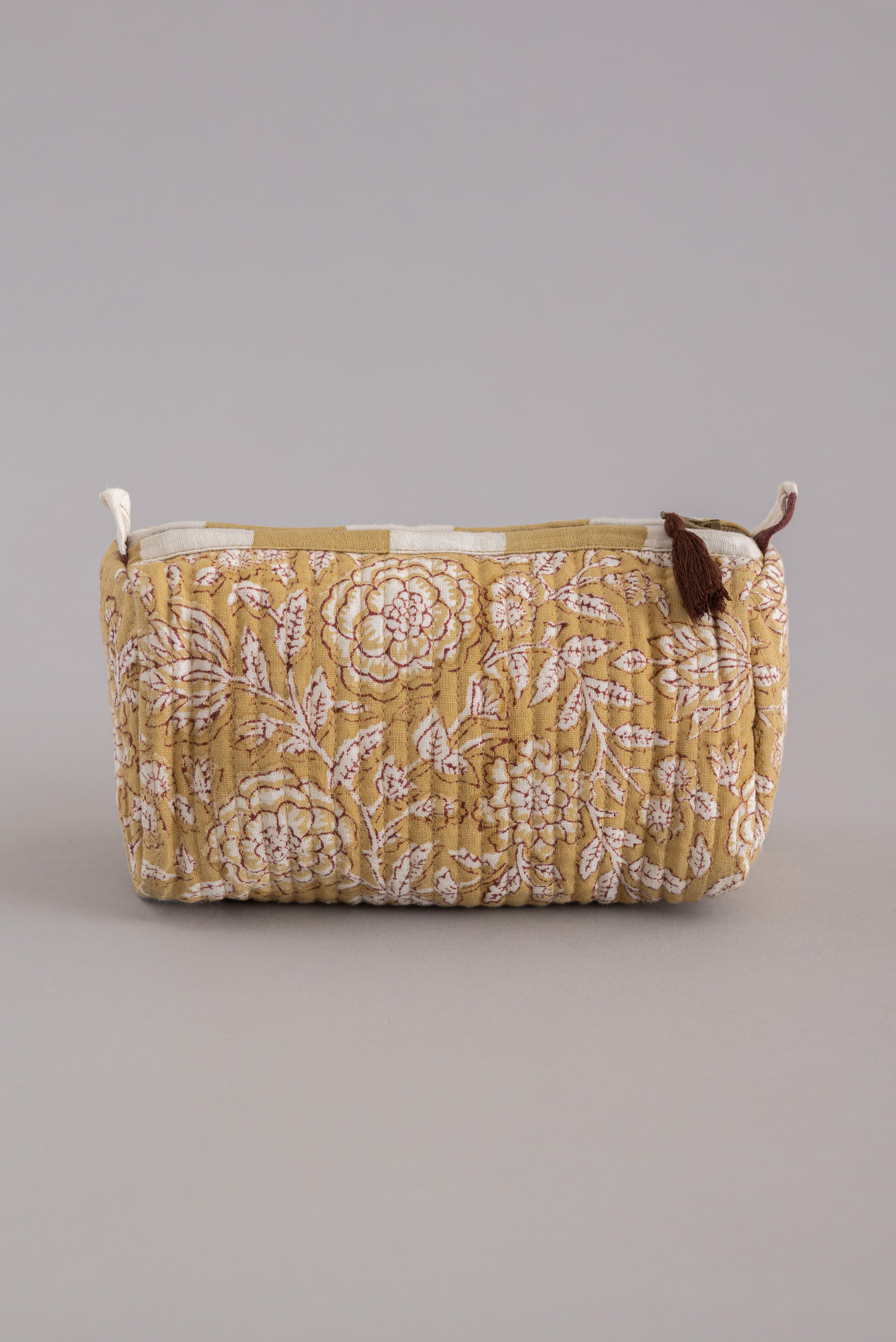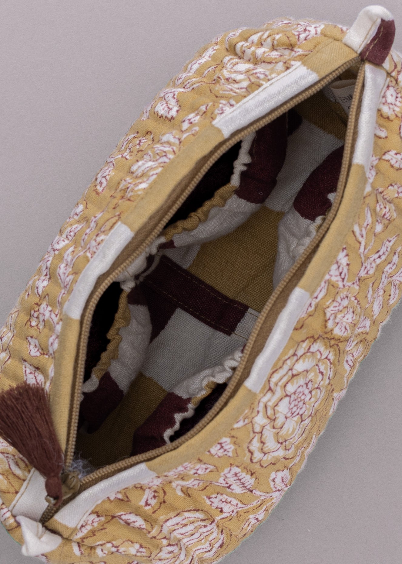 Carefully designed floral Block print lightweight mustard, red and brown Linen quilted pouch with durable quilted exterior which protects your essentials and make it easy to carry. A smooth, high-quality zip finished with a handcrafted fabric tassel pull. Inside, four mini pockets keep your belongings neatly organized—perfect for makeup, travel necessities, or everyday must-haves. Compact, spacious, Made to move with you.