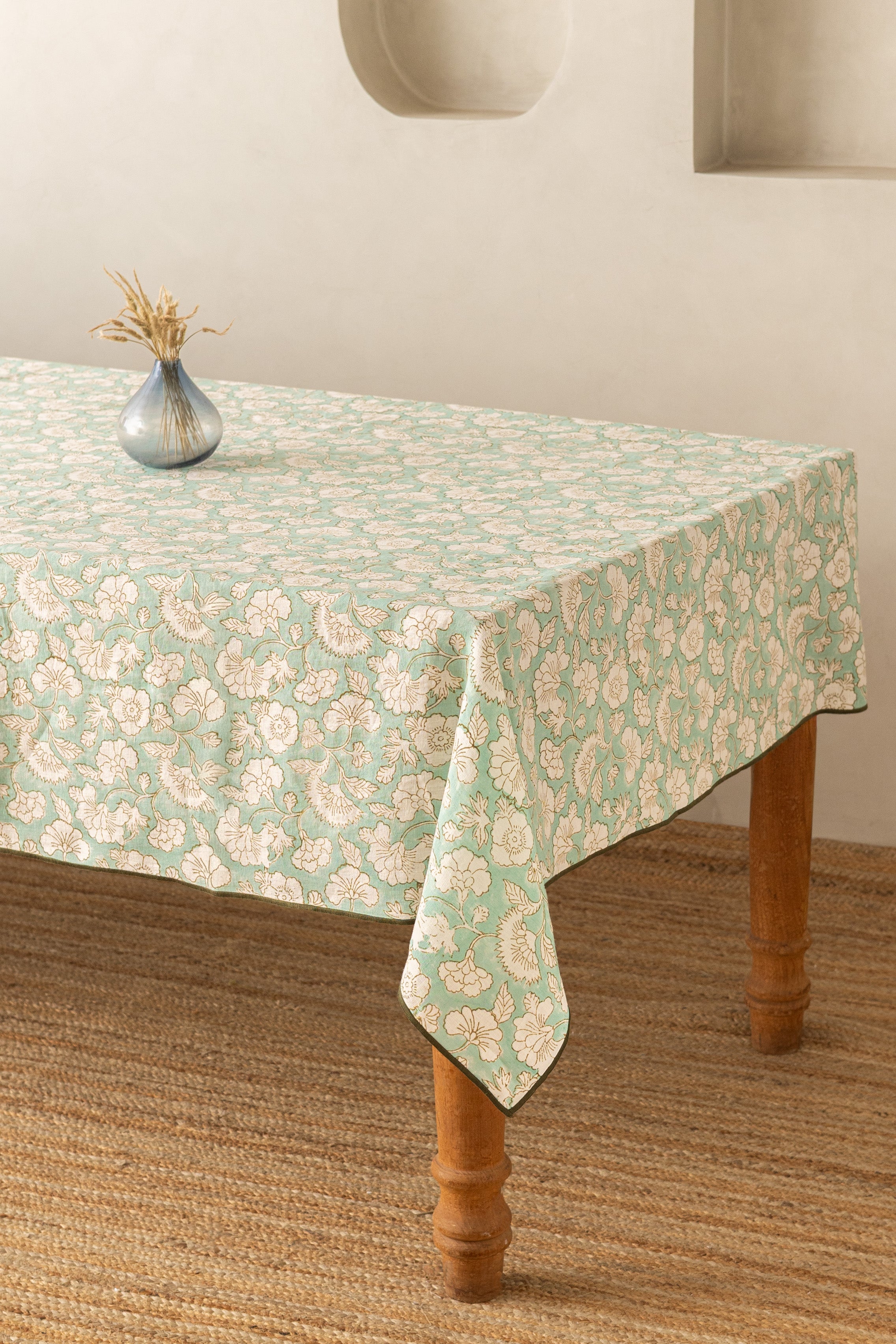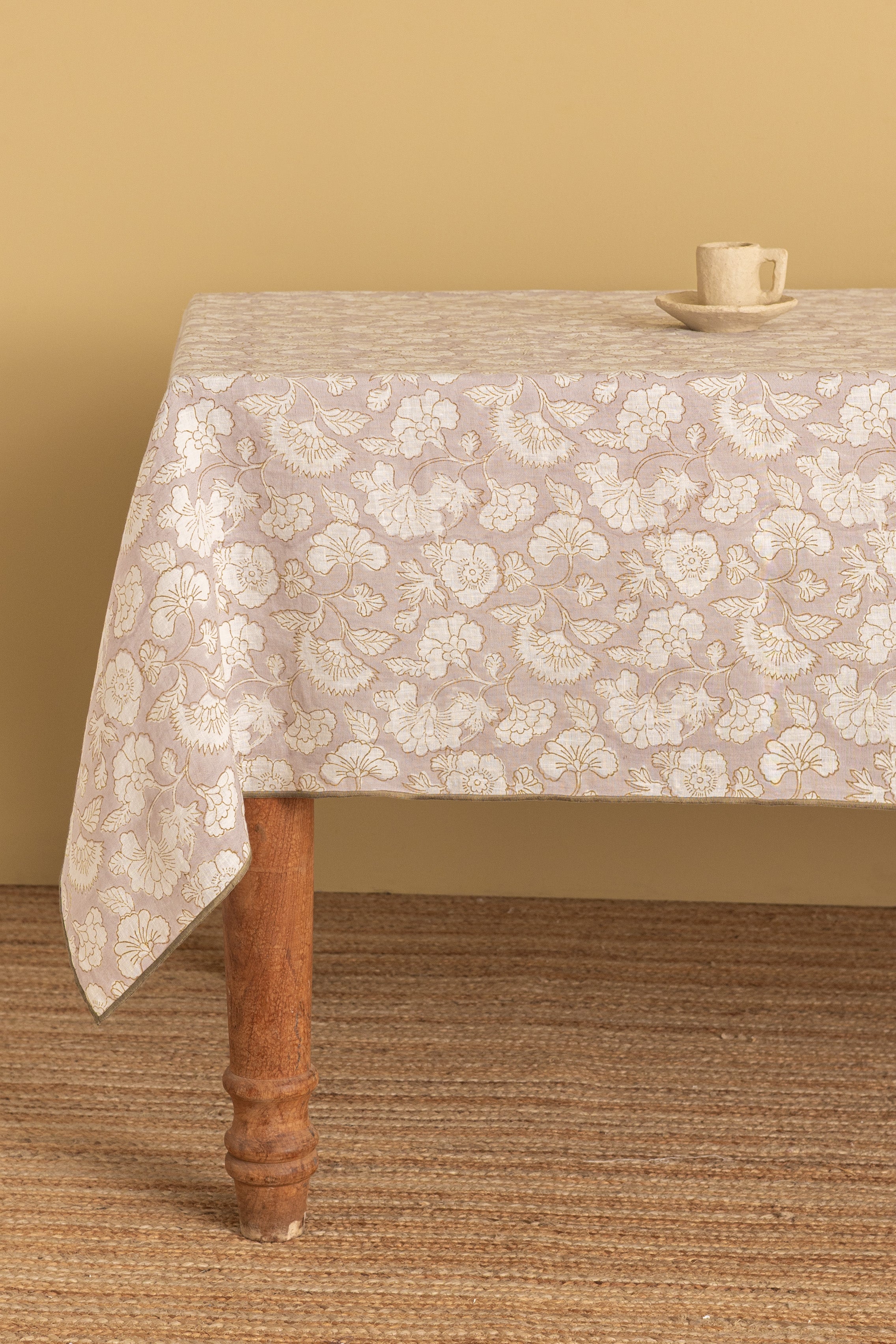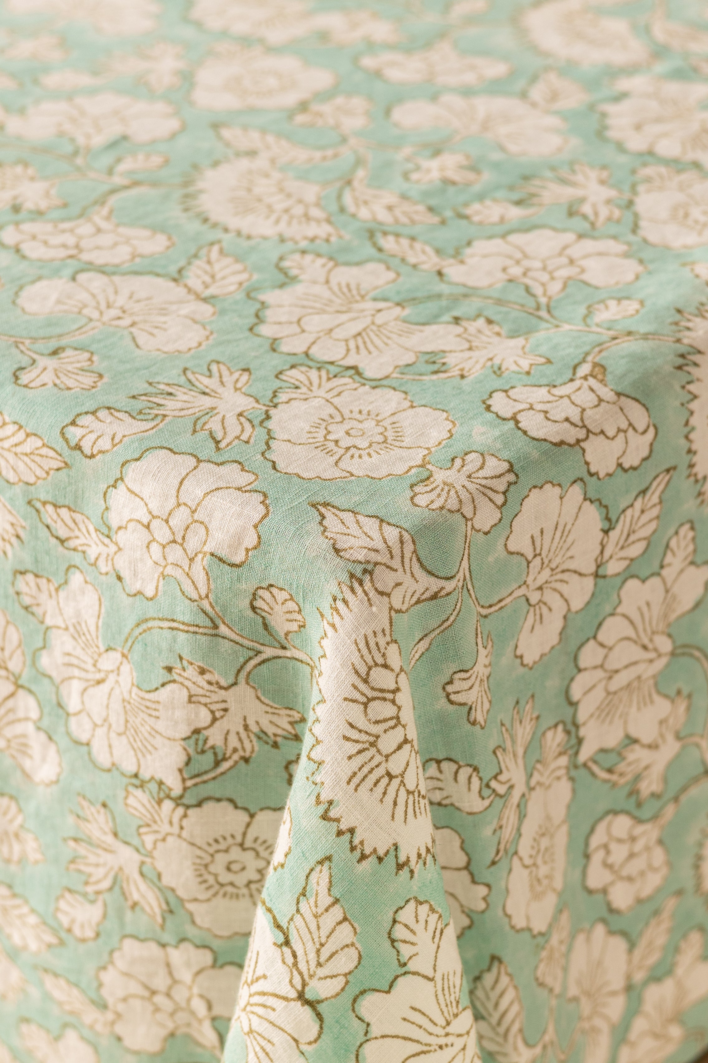 Linen Camellia Indian Block Print tablecloth, perfect for everyday dining or festive gatherings, its natural linen texture adds warmth, breathability, and timeless appeal. Pair it with brass cutlery or ceramic dinnerware for a coordinated, stylish look. Elevate your dining space with sustainable craftsmanship and the beauty of Block Print Linen Camellia Tablecloth.