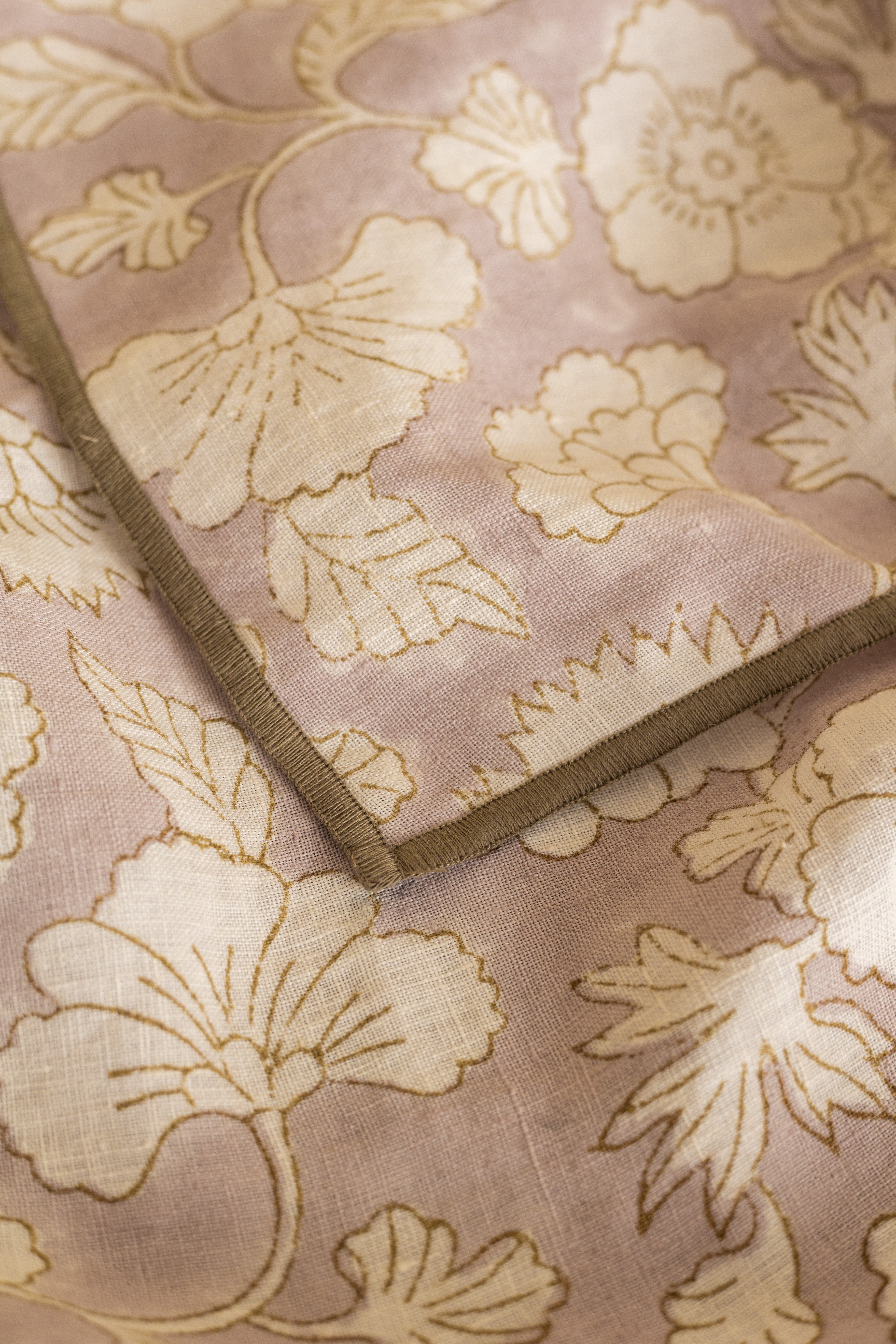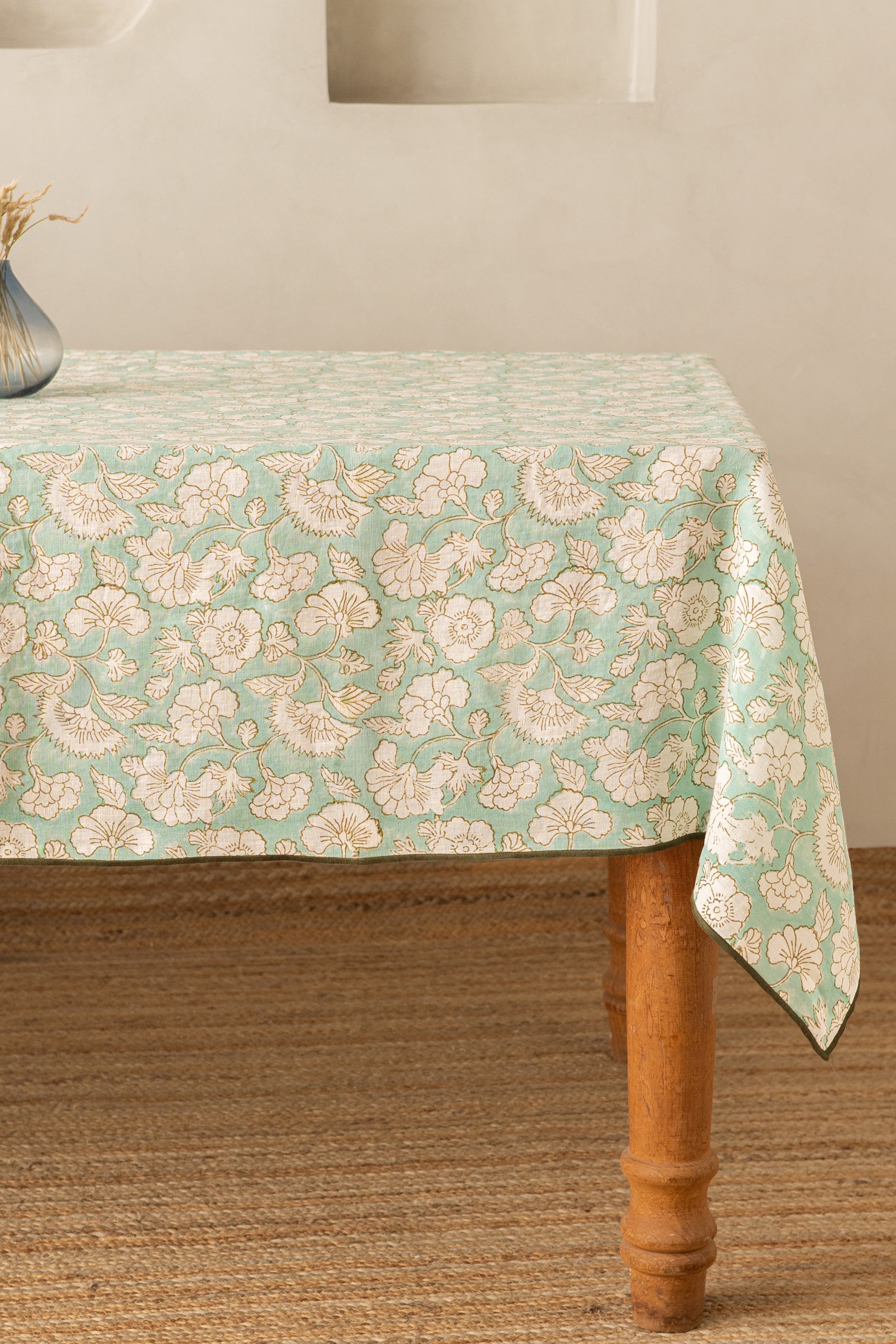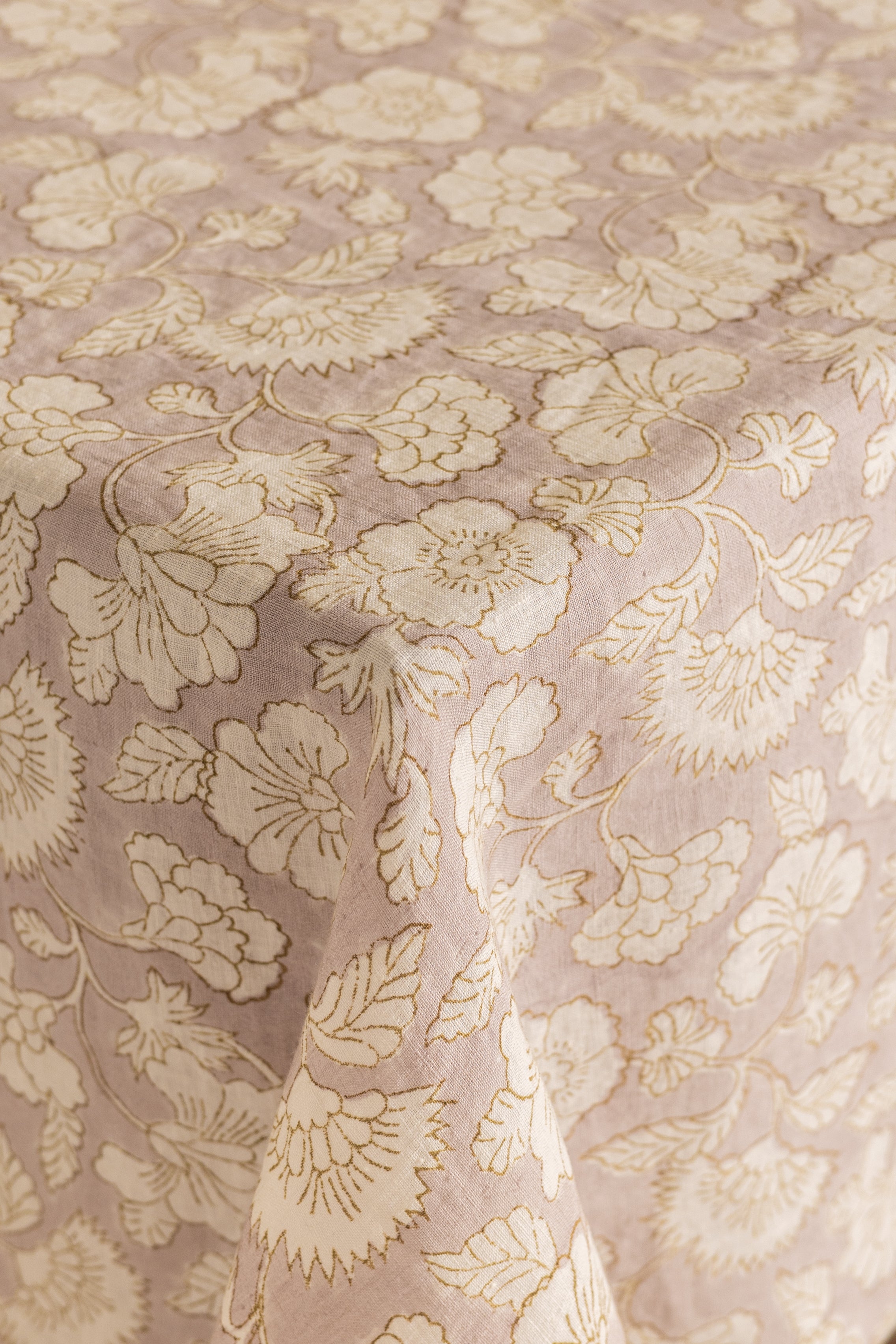 Indian Block Print Linen Camellia Pink tablecloth, perfect for everyday dining or festive gatherings, its natural linen texture adds warmth, breathability, and timeless appeal. Pair it with brass cutlery or ceramic dinnerware for a coordinated, stylish look. Elevate your dining space with sustainable craftsmanship and the beauty of Pink floral Block Print Linen Camellia Tablecloth.