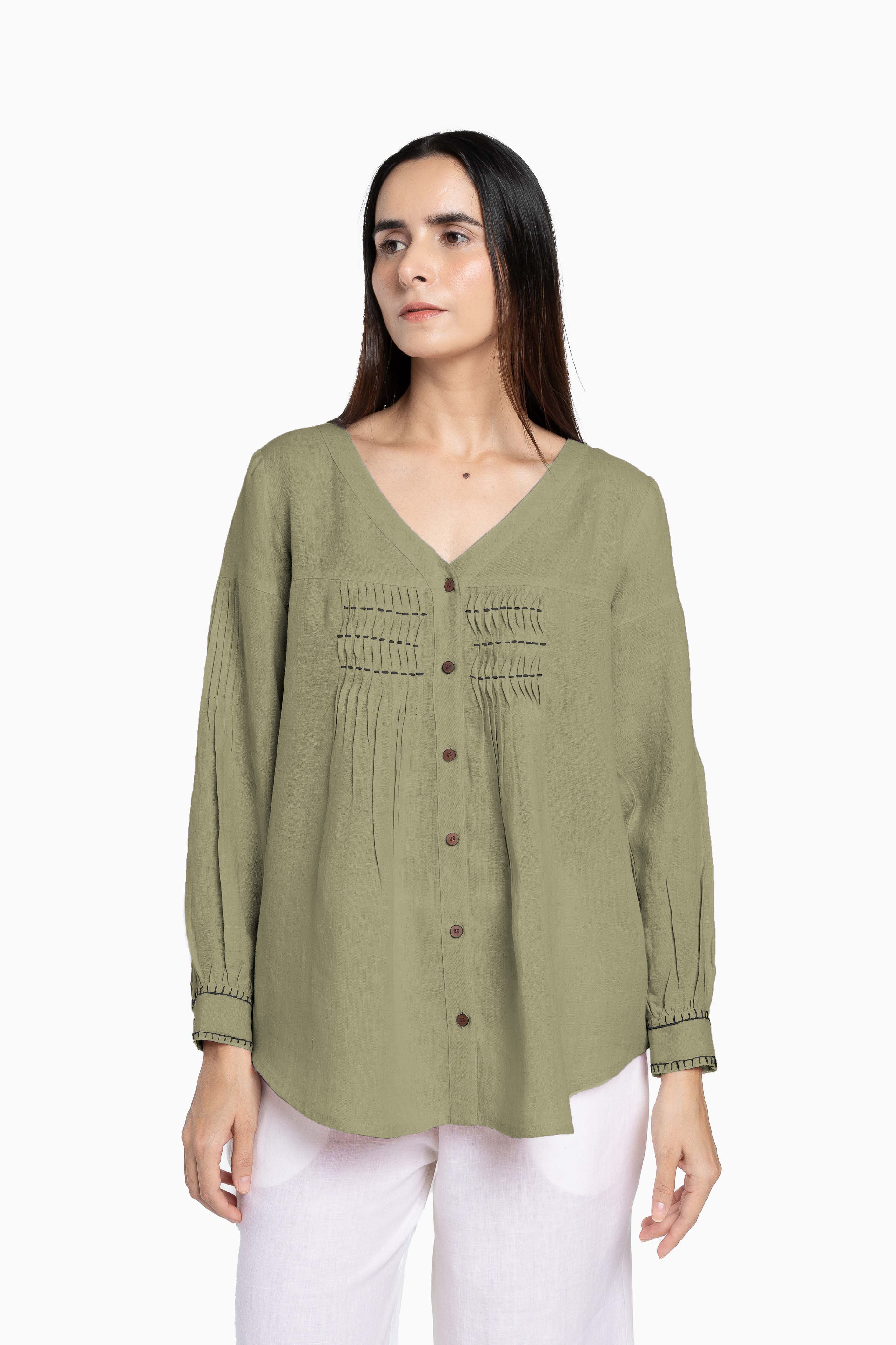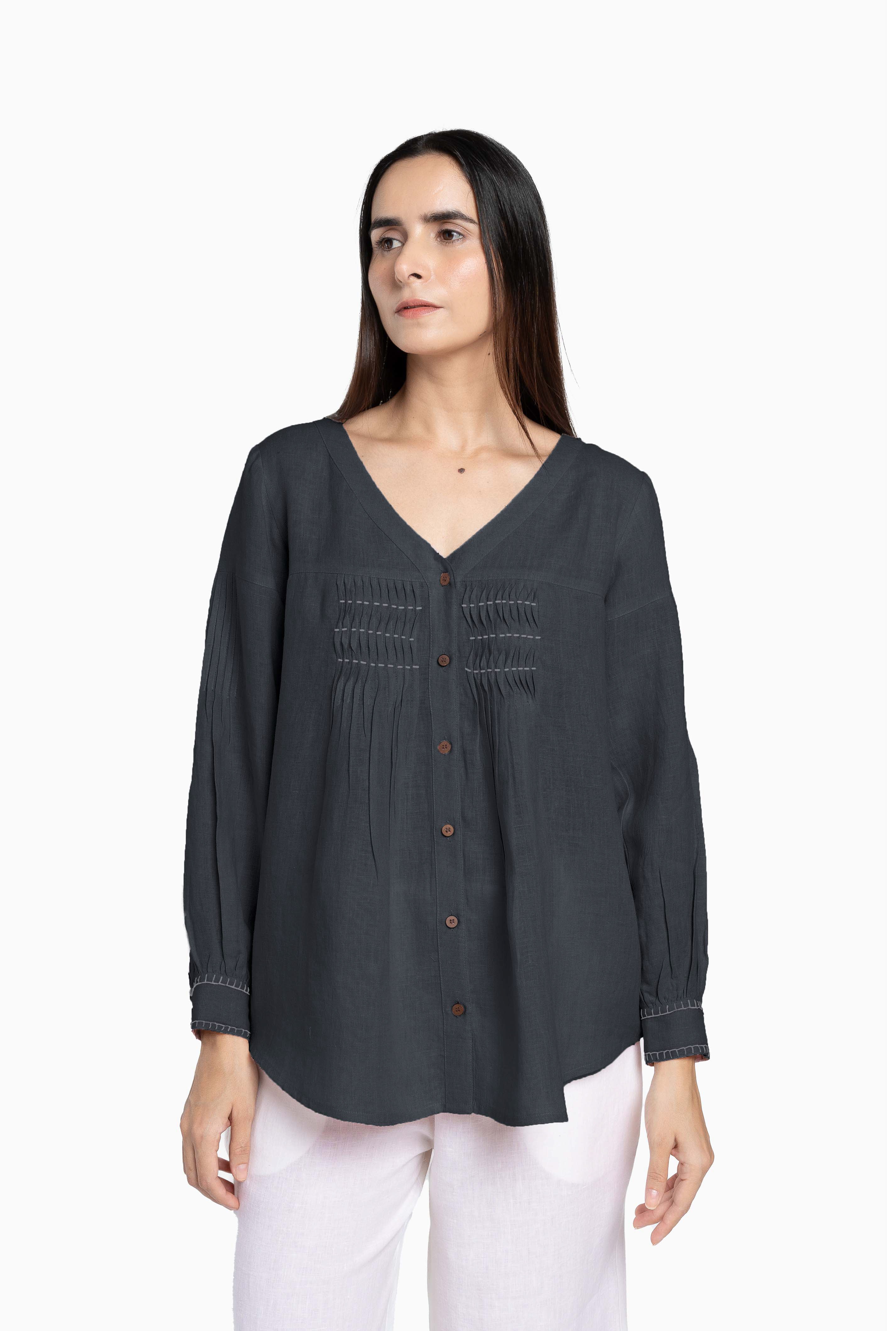 Live Linen’s V-neck Linen Caprice Top is crafted from soft European Linen, perfect for everyday wear. The pintuck detailing and bishop sleeves, adorned with blanket stitch, add a charming touch to this pastel pink top. The placket on the front is embellished with coconut husk buttons, making it both elegant and eco-friendly.