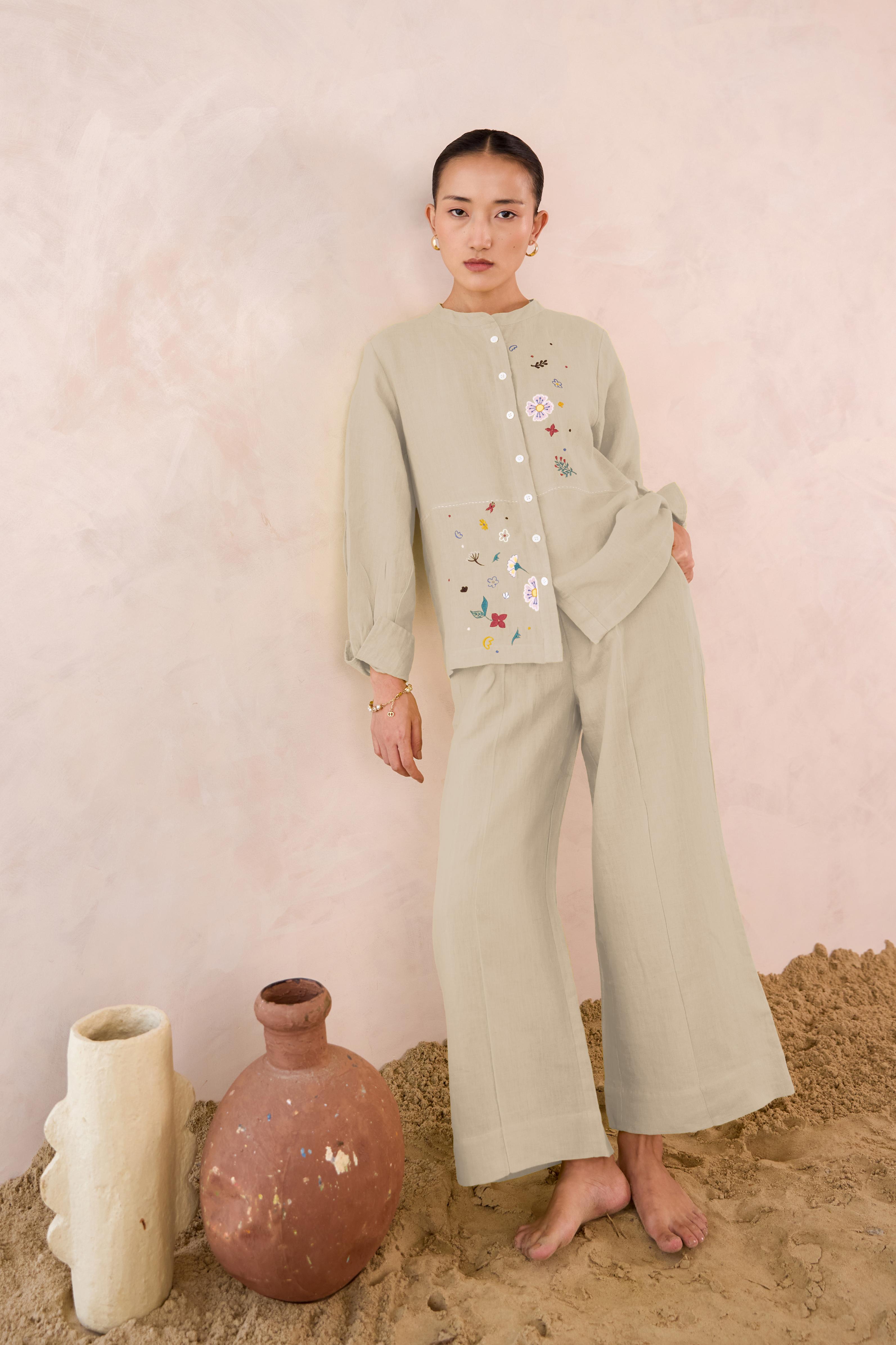 Our Linen Citrene Co-ord is adorned with graceful floral appliqué work, crafted with the detailed efforts of our artisans. The machine embroidered elements in the entire outfit bring delicacy to your fashion sense.