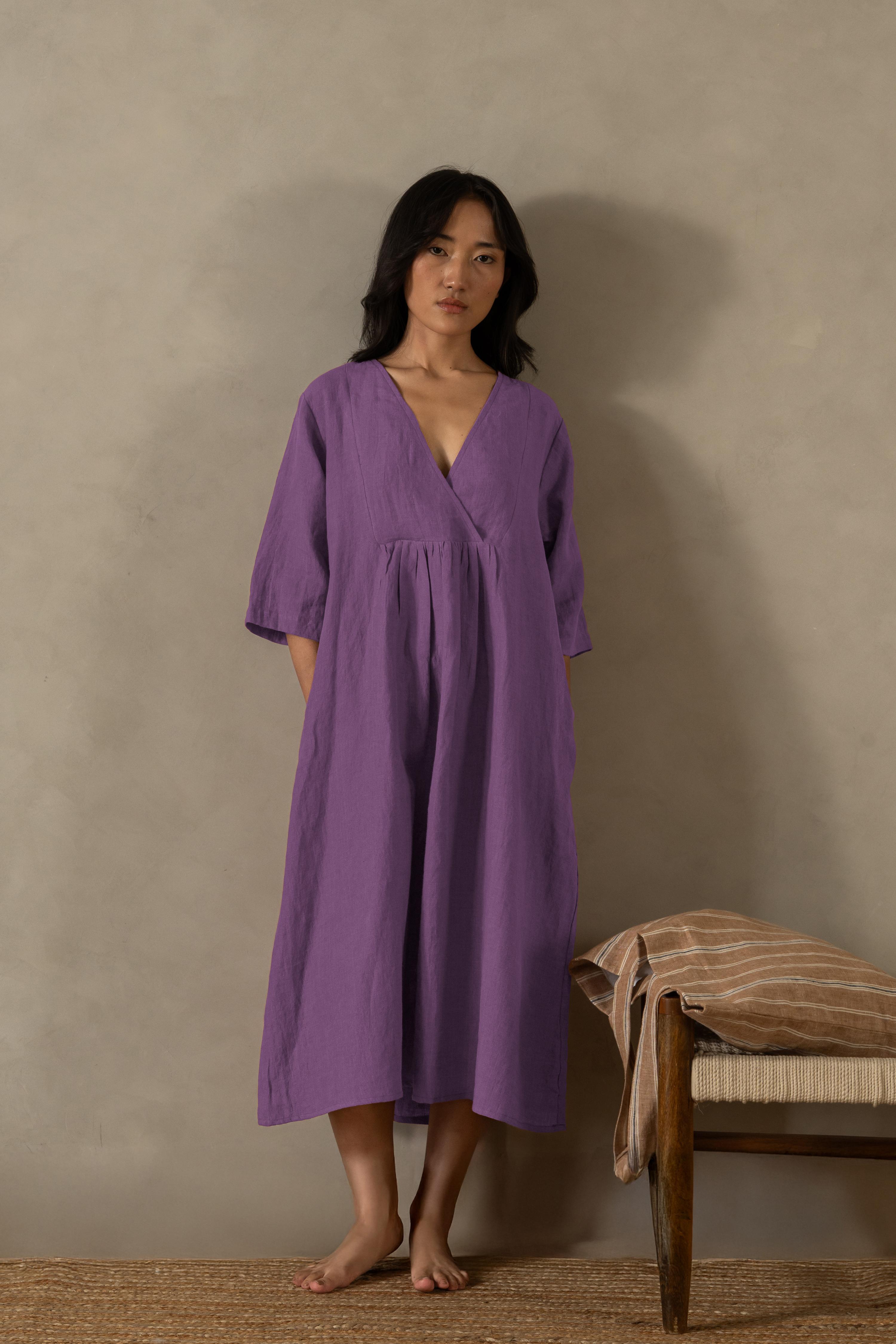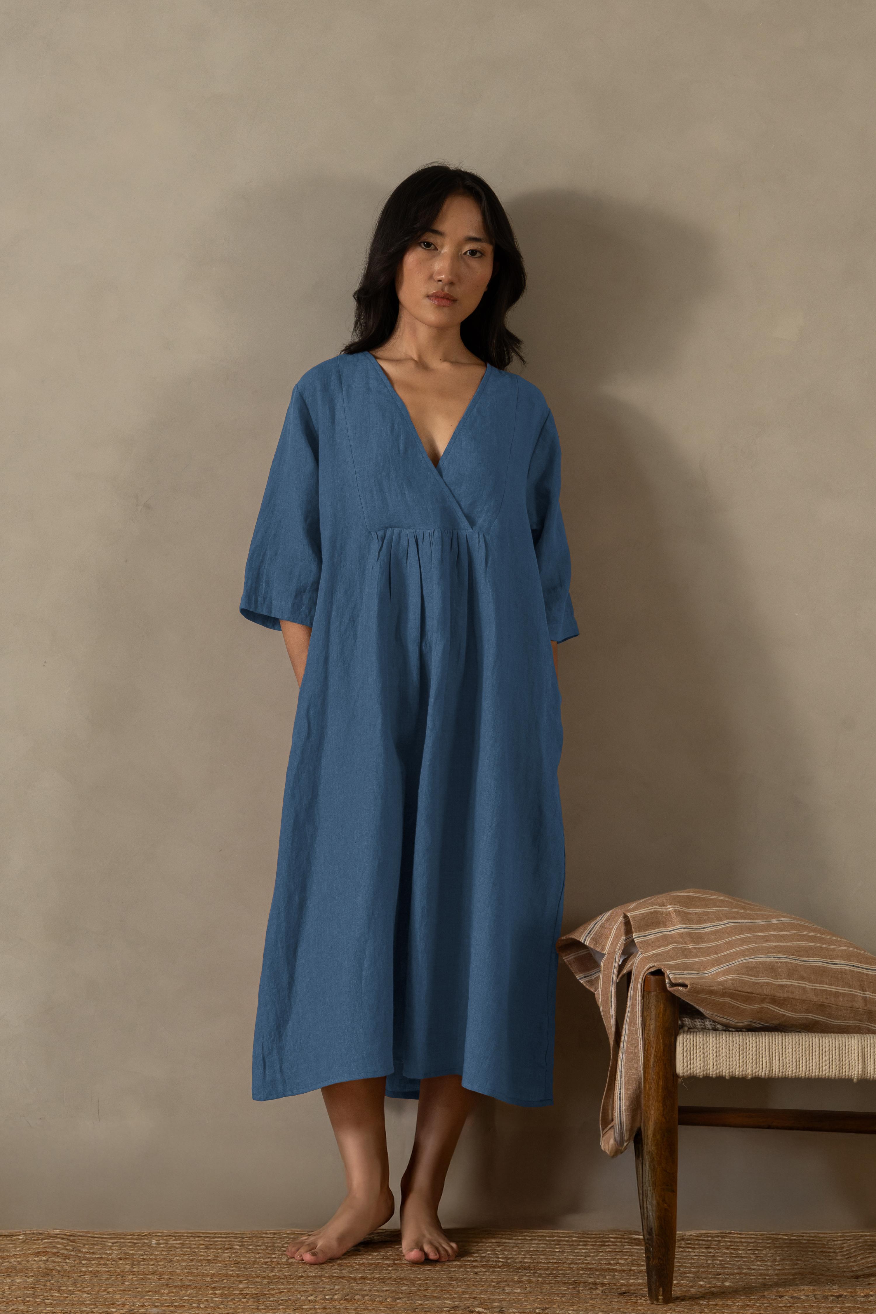A V-neck fashionable Linen Citrus Midi Dress with soft pleats on the front and back. The free-flowing pattern of the dress and three-quarter sleeves will provide you the utmost comfort and luxury. Discover the best collection of European Linens here at Live Linen.