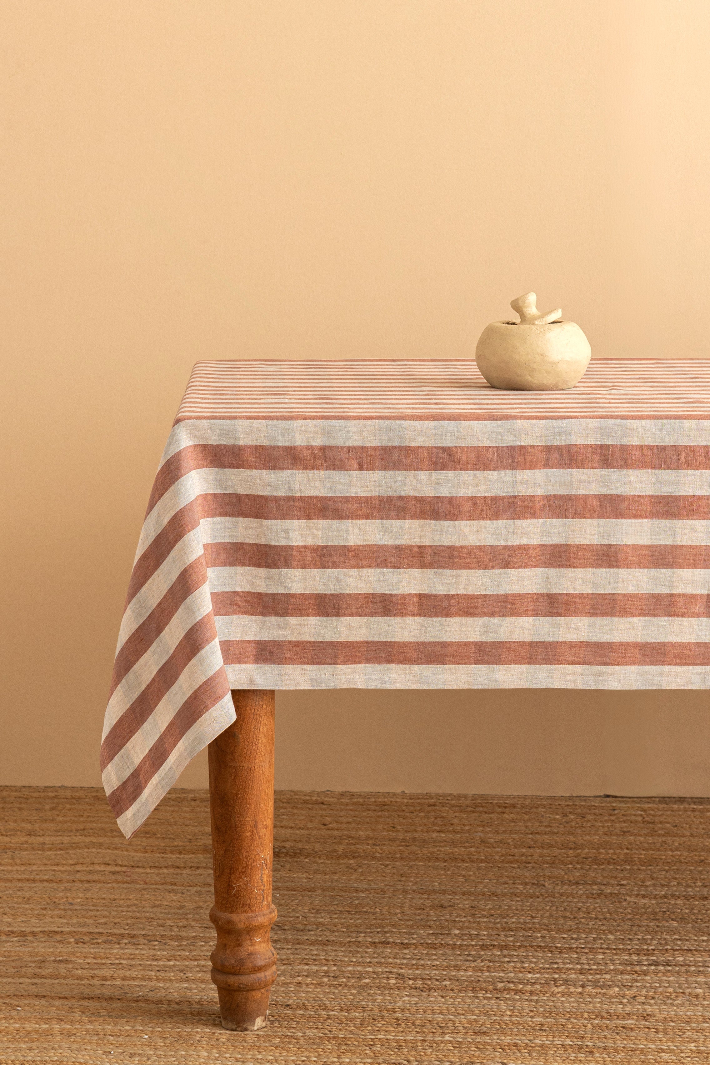 The Linen Terracotta Clara Tablecloth holds a special place with its contemporary check pattern. Linen, a moisture-absorbing fabric with a delicate touch, is perfect for a tablecloth. Let us keep luxury coming your way!