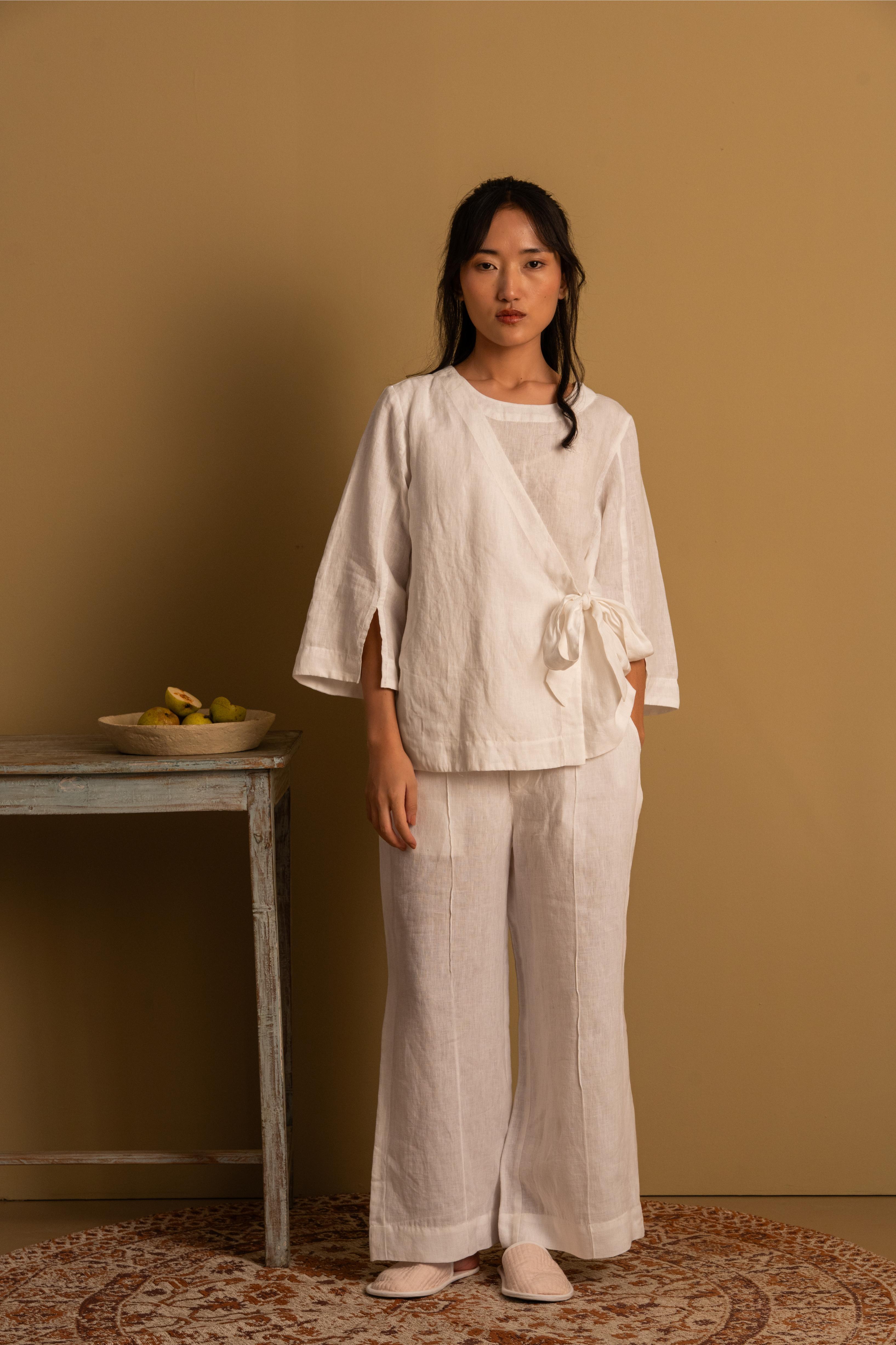 Discover our Linen Cymira Co-ord that has a kimono-style top with matching pants. The crisp linen is extremely perfect for a sunny day as it keeps you breezy and breathable. The 100% soft touches of linen have a redefined aura ready for you.