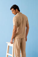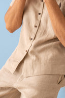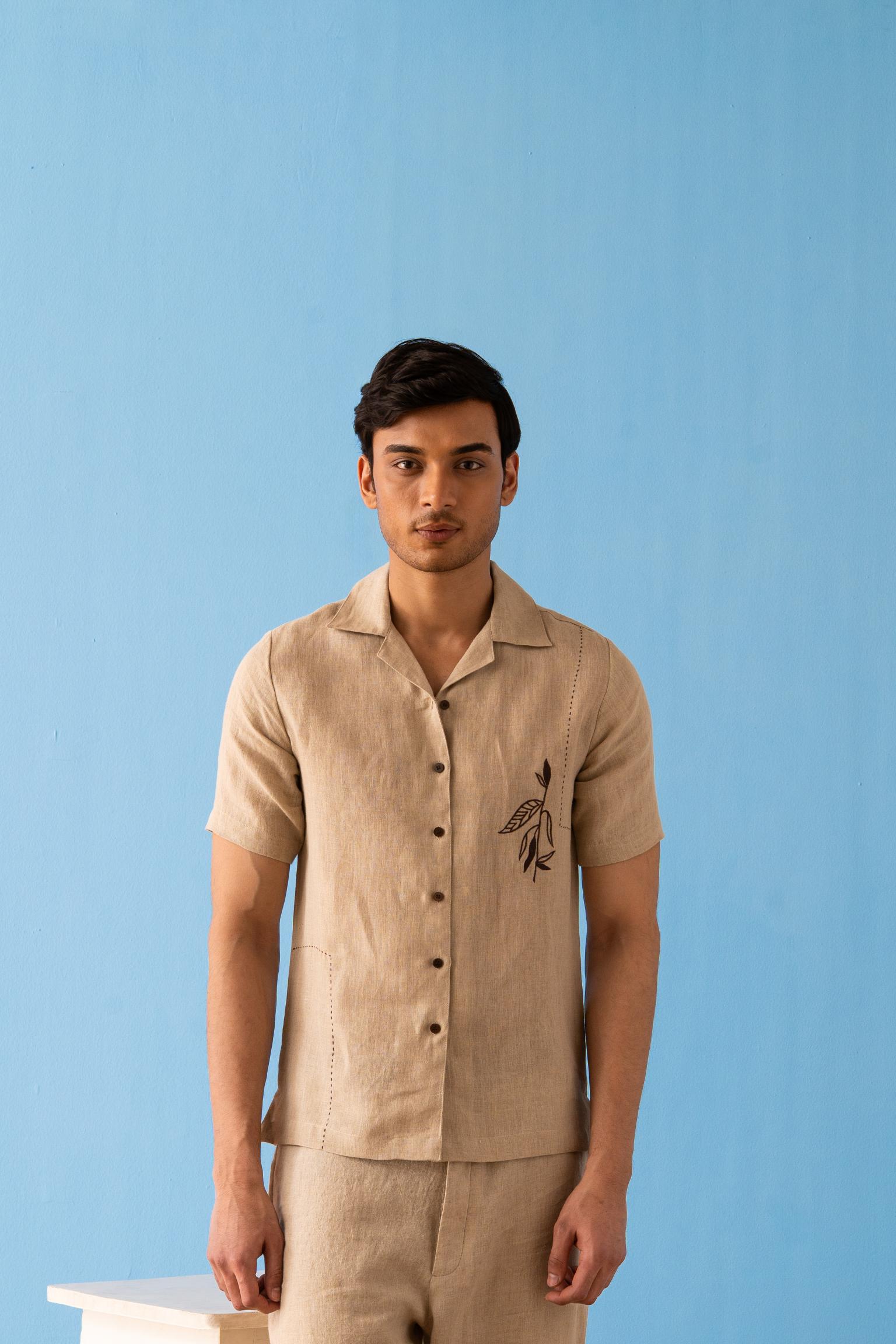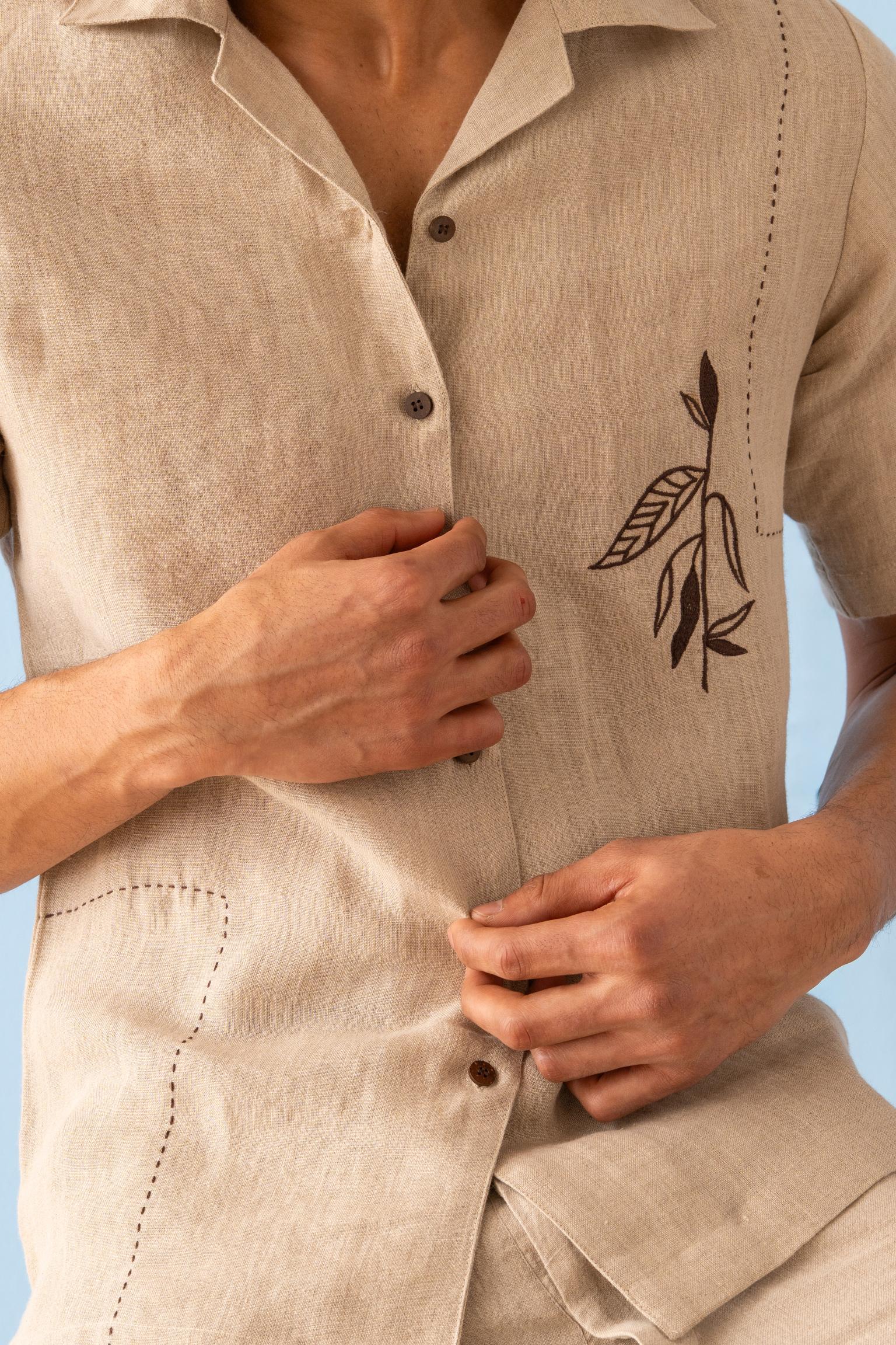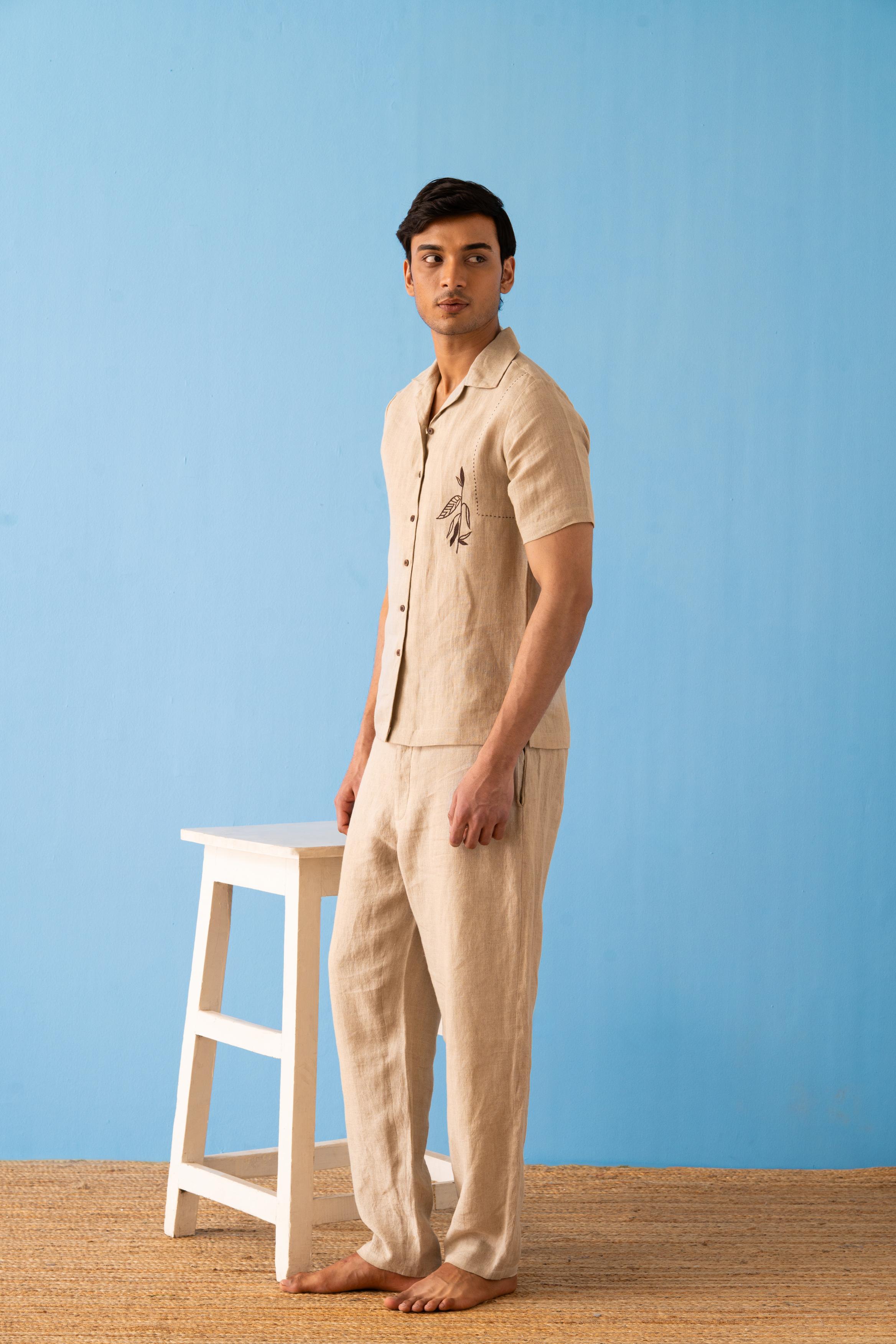 A breezy and soothing drop shouldered Linen Edward Shirt that will bring you a vacation vibe as you wear it. Giving a special touch of sophistication, our artisans have put their skilled efforts by adorning the shirt with machine embroidery and kantha work on the front. The placket is sustainably adorned with coconut husk buttons, bring the subtle charm home today.