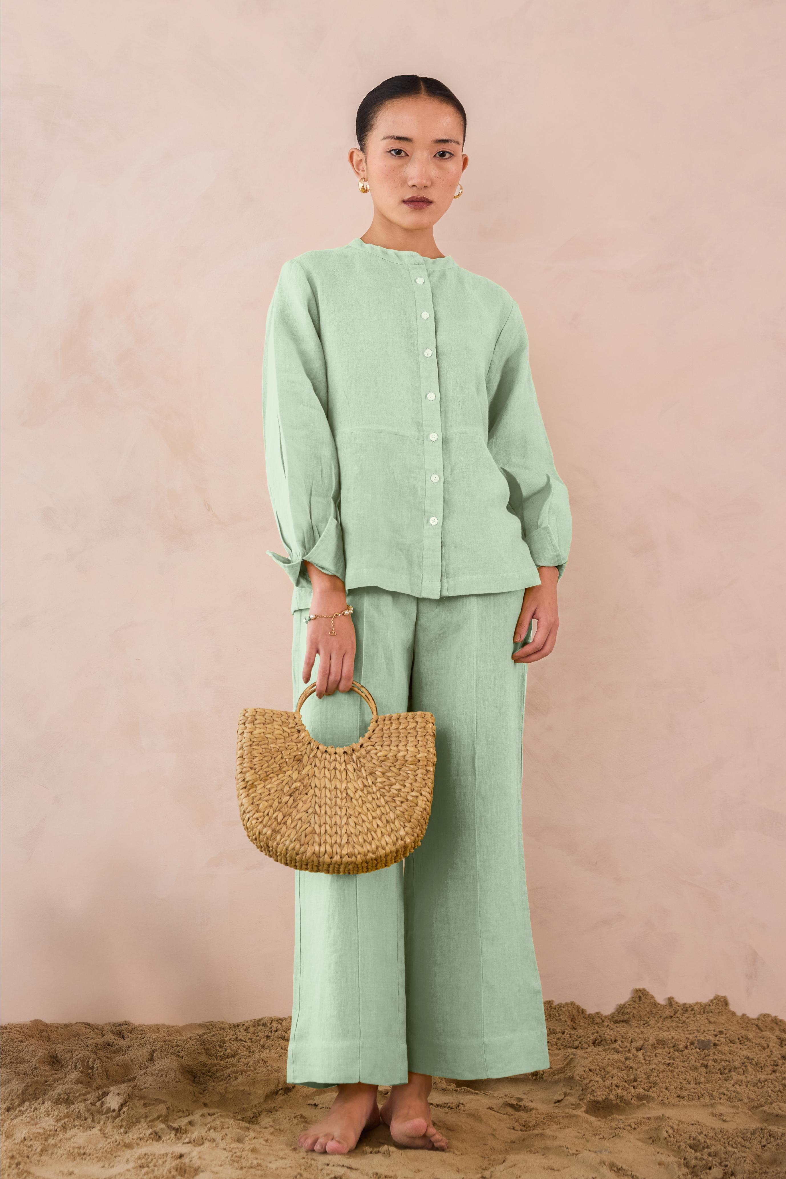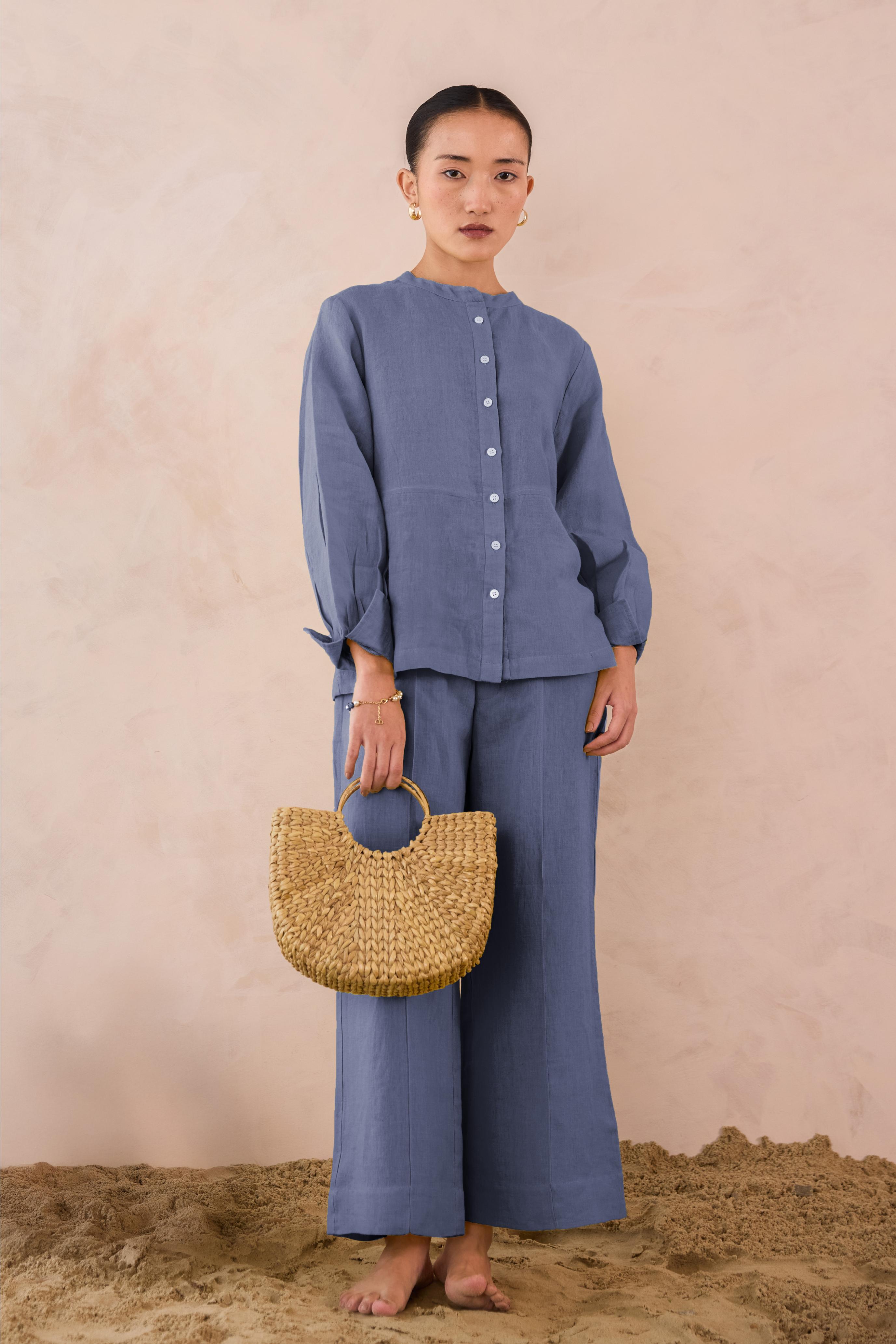 Bring this magical Linen Emilia Co-ord to your fashion closet. The beautiful band collar and the placket are finished with shell buttons. This breezy co-ord set is an absolute hit on a hot summer day.