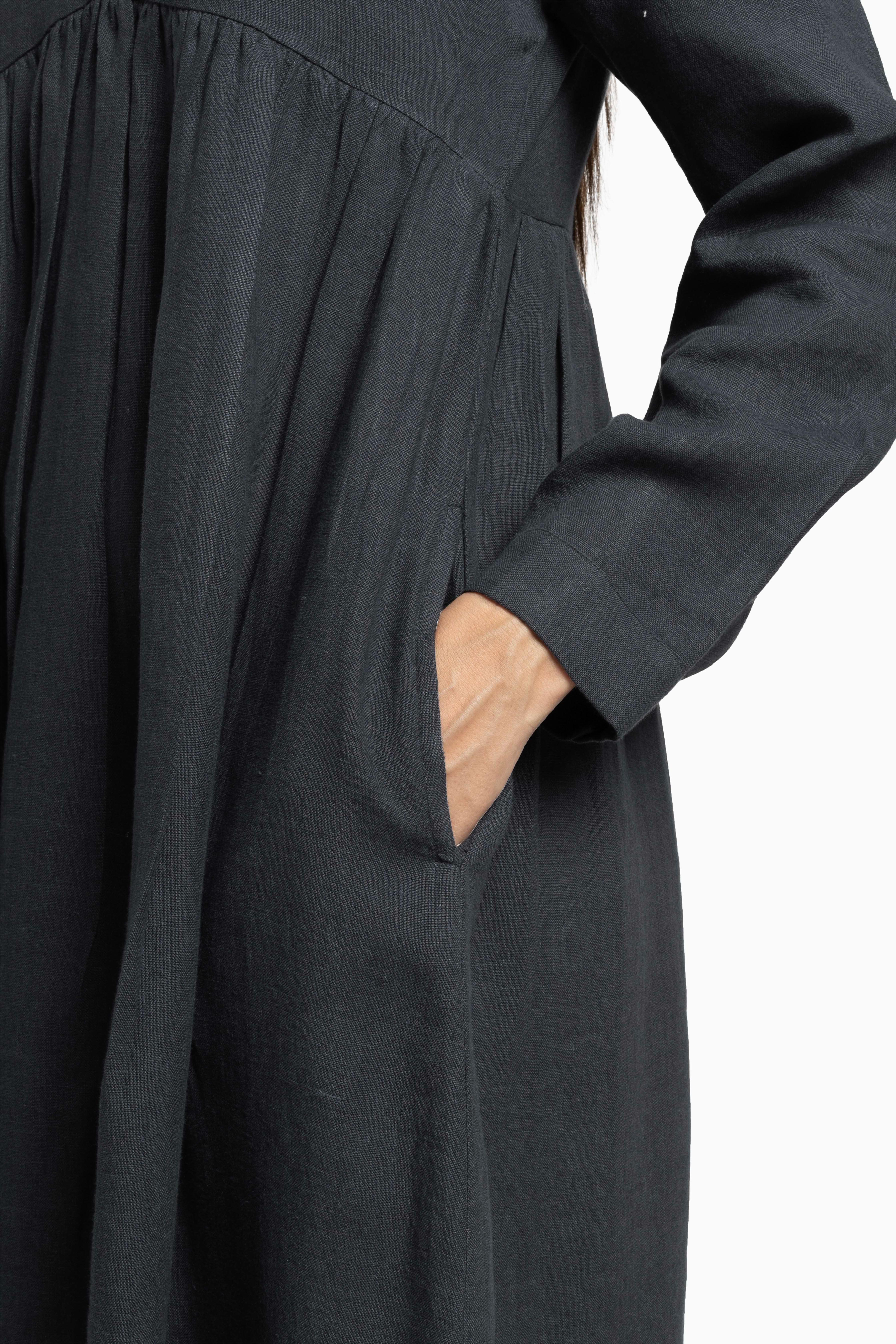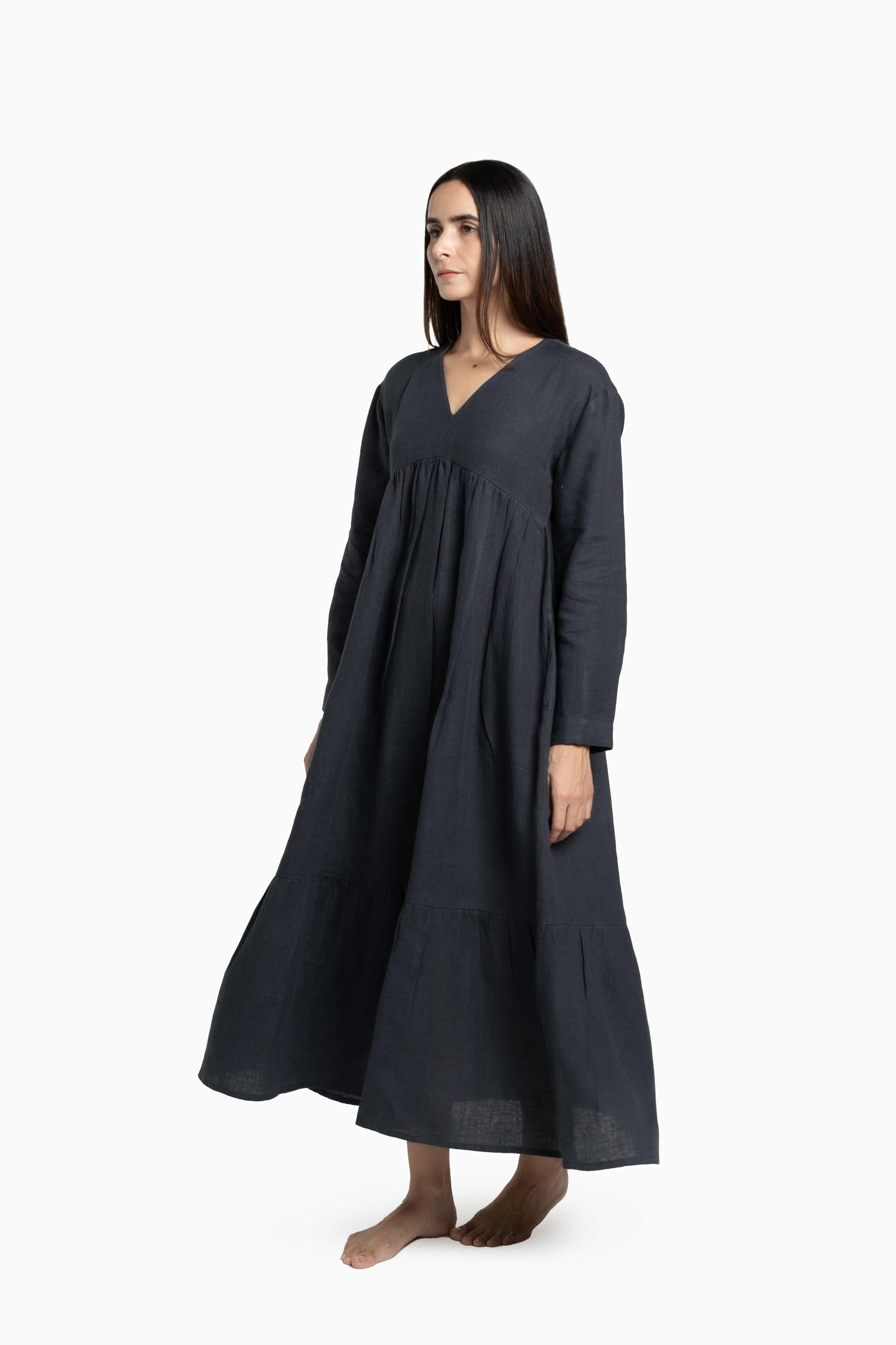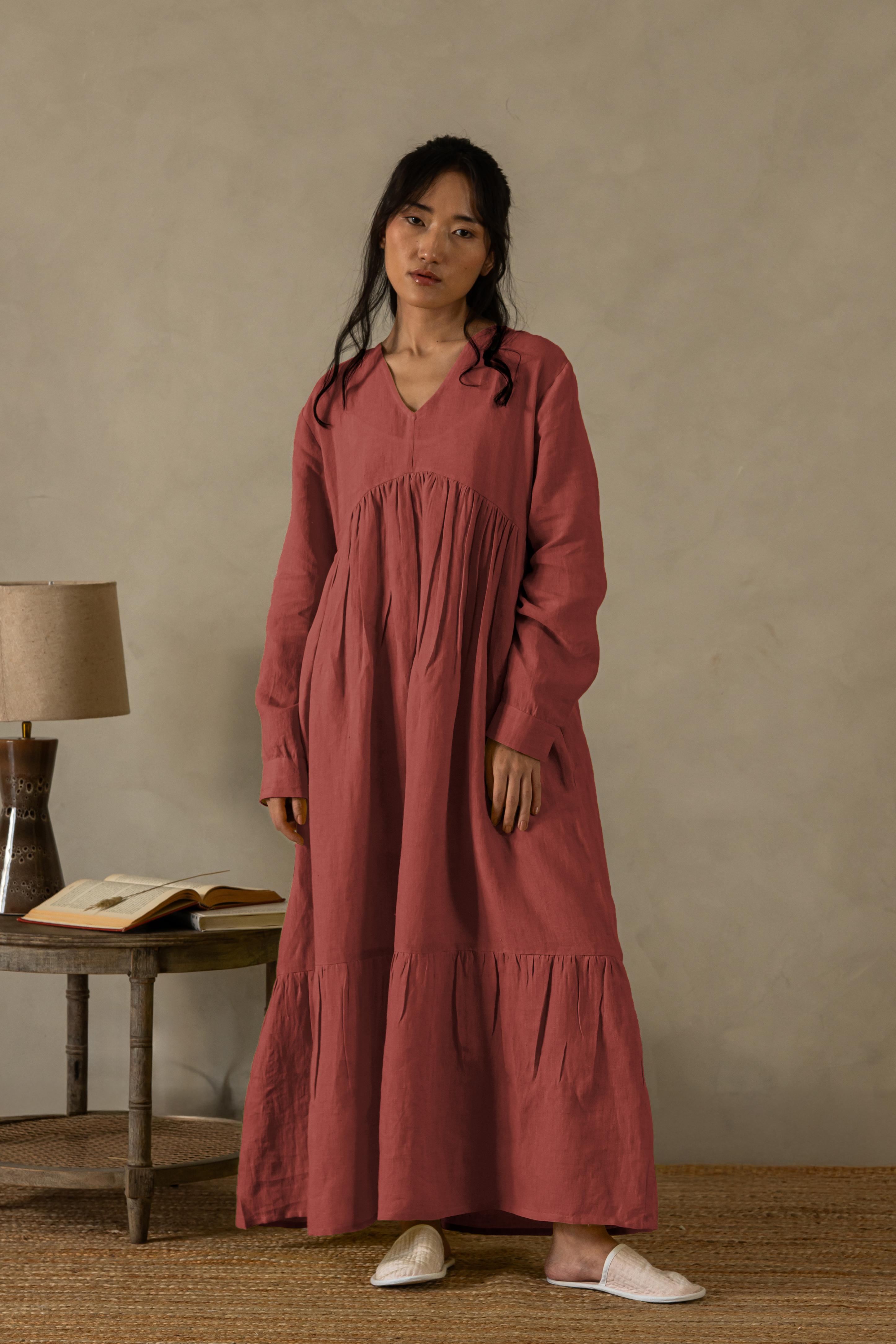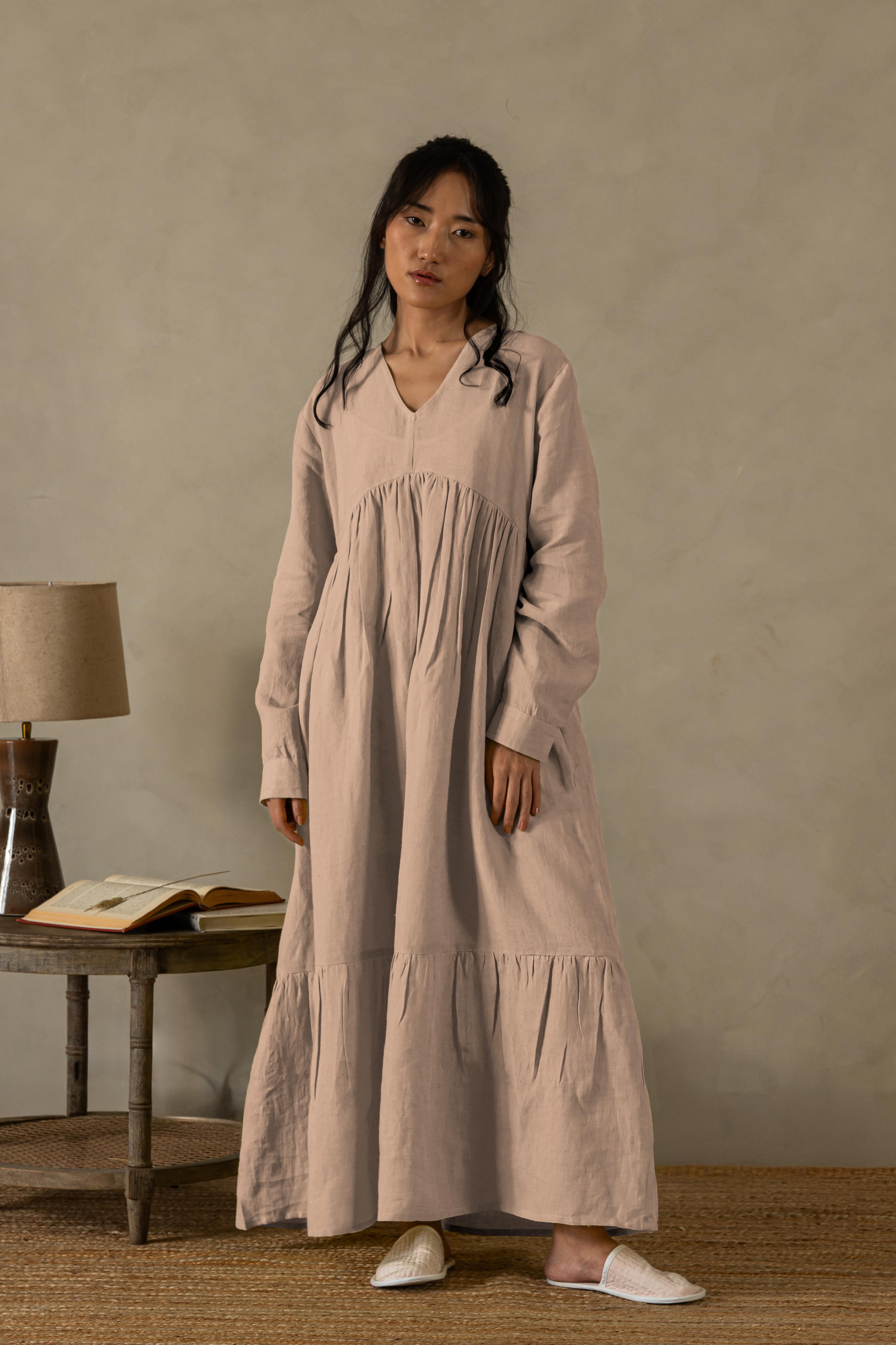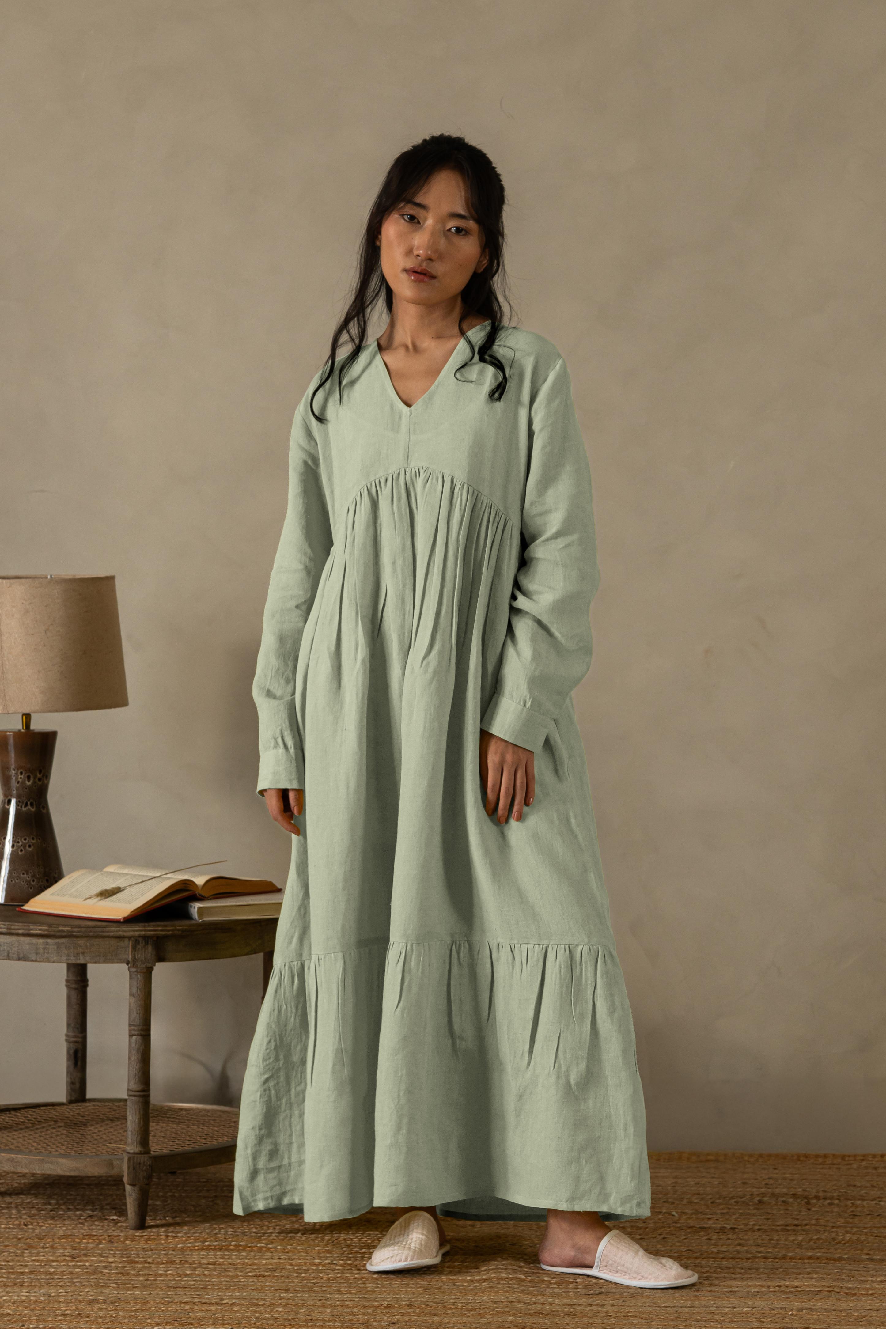 Delve into the sublime of feathery touches with our European Linens. The artisanal efforts in making the Linen Harbor Maxi Dress is a work of craft. The sustainable efforts adorn coconut husk buttons on the cuffs, while the intricacy can surely mesmerize anyone. The subtle gathering around the chestline and bottom makes it stand out for any special evening.
