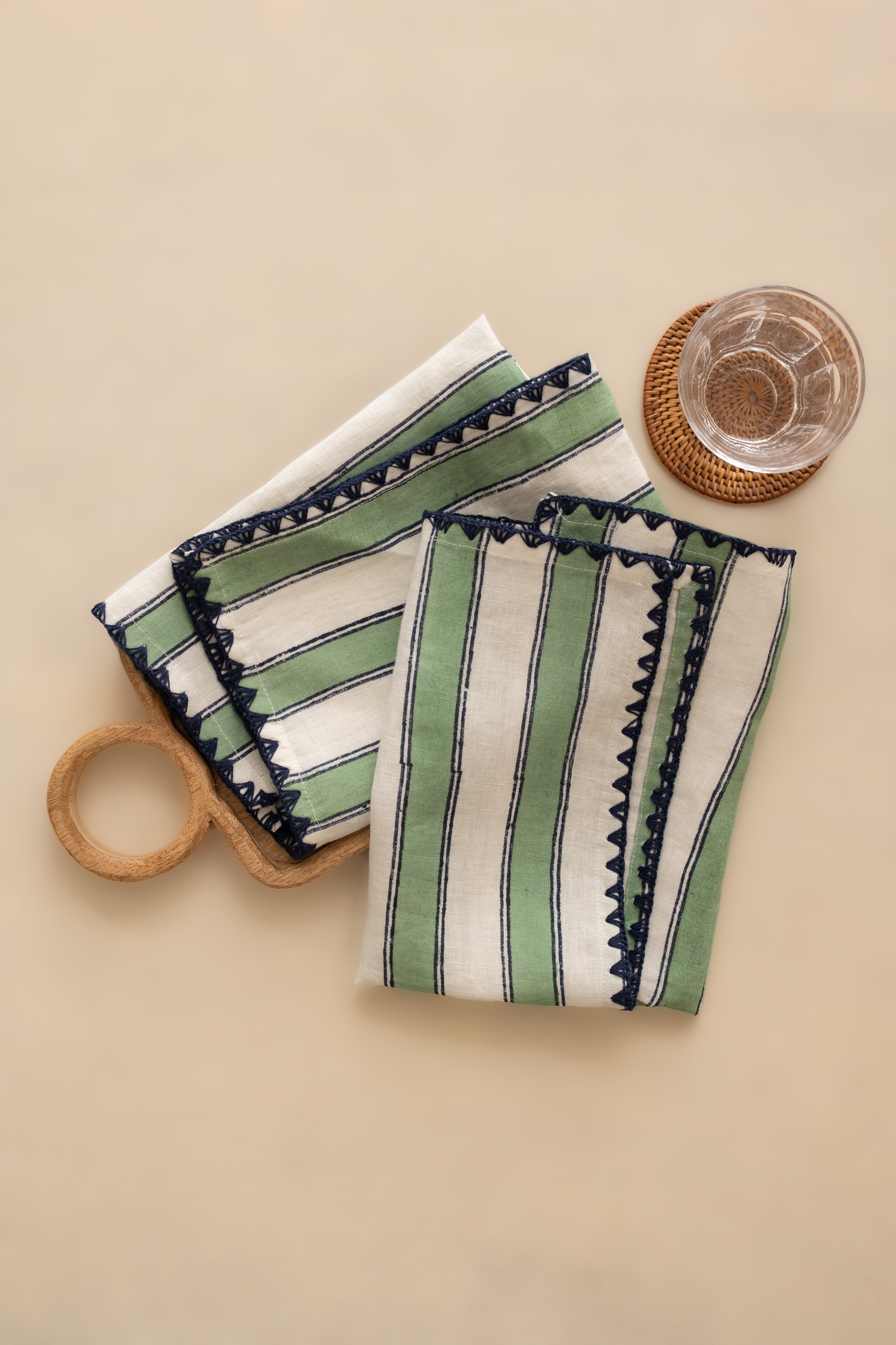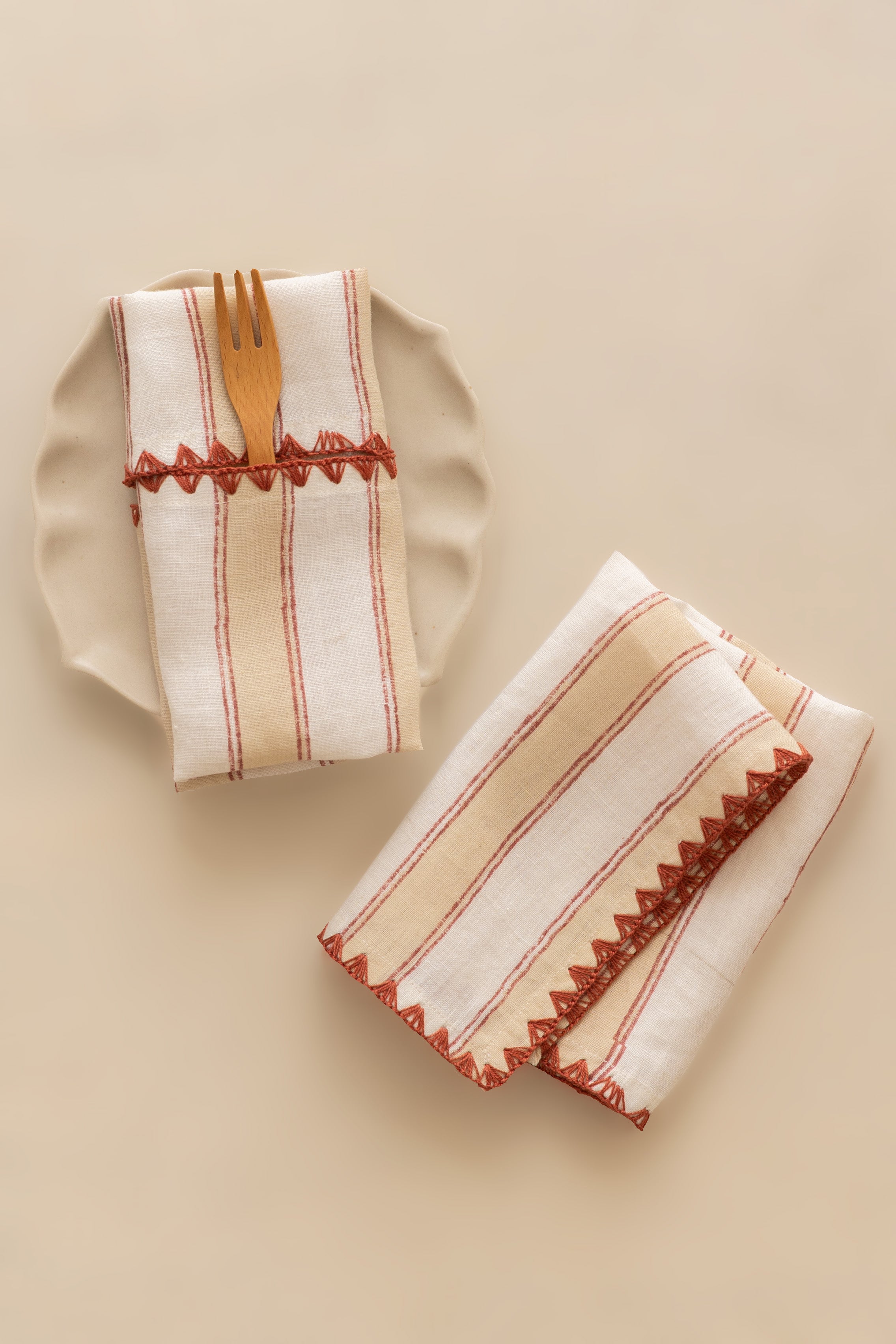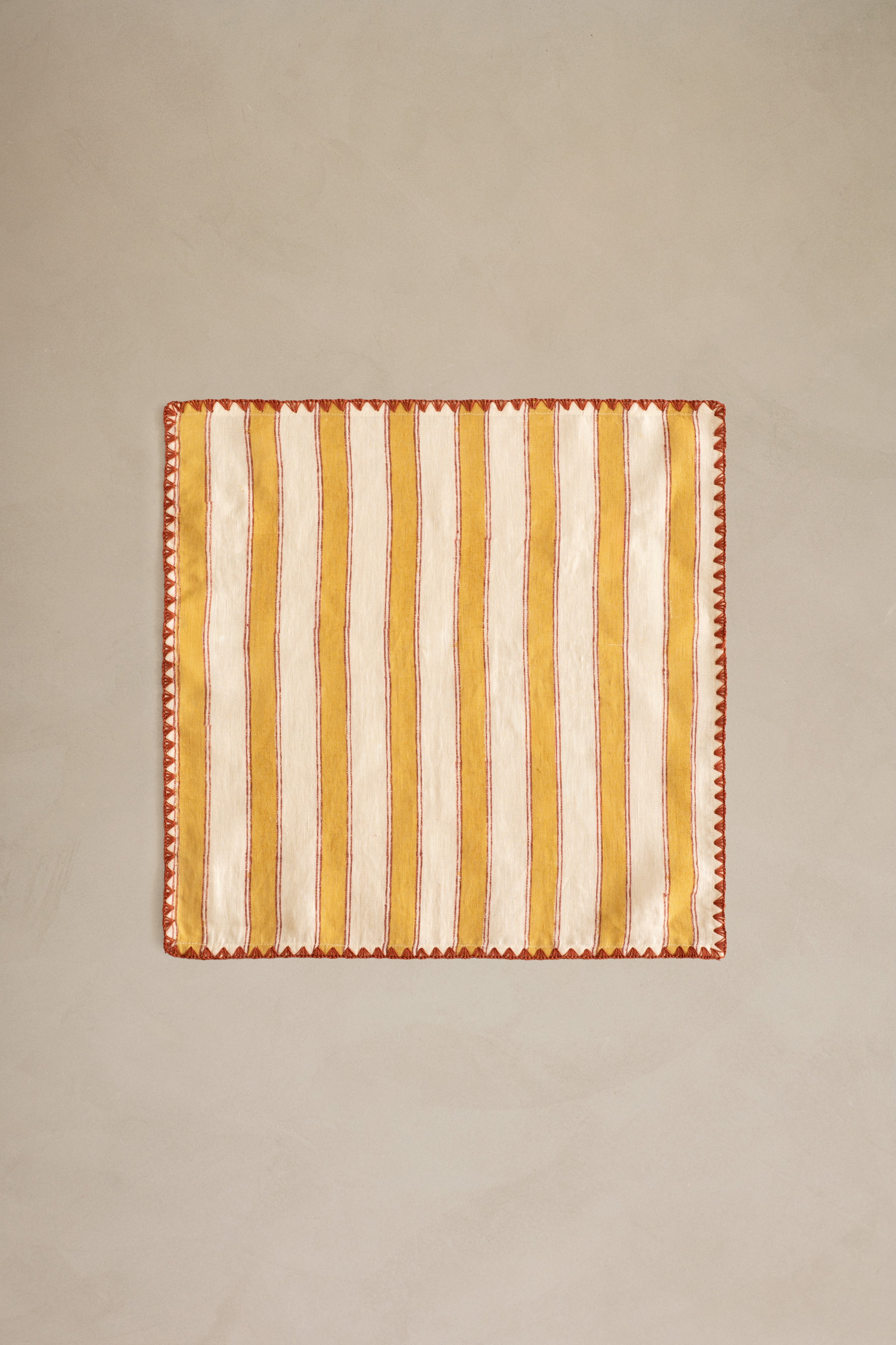Made from lightweight yet durable linen, these Heritage Stripe napkins are designed for everyday use. The classic striped pattern is finished with delicate hand-embroidered edges, adding a thoughtful detail to your table. A modern, reusable alternative to paper napkins, they protect surfaces while elevating every meal with effortless style.