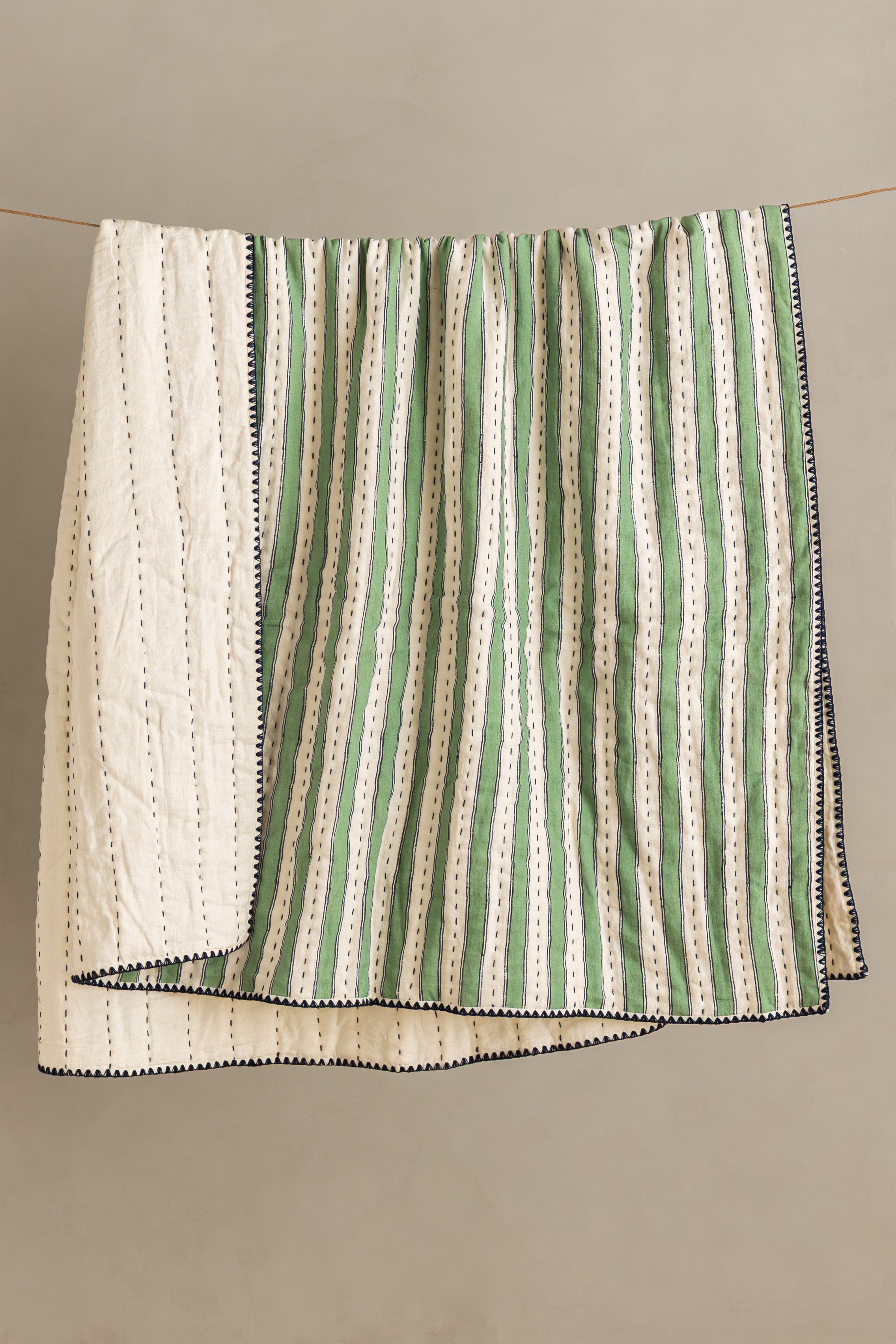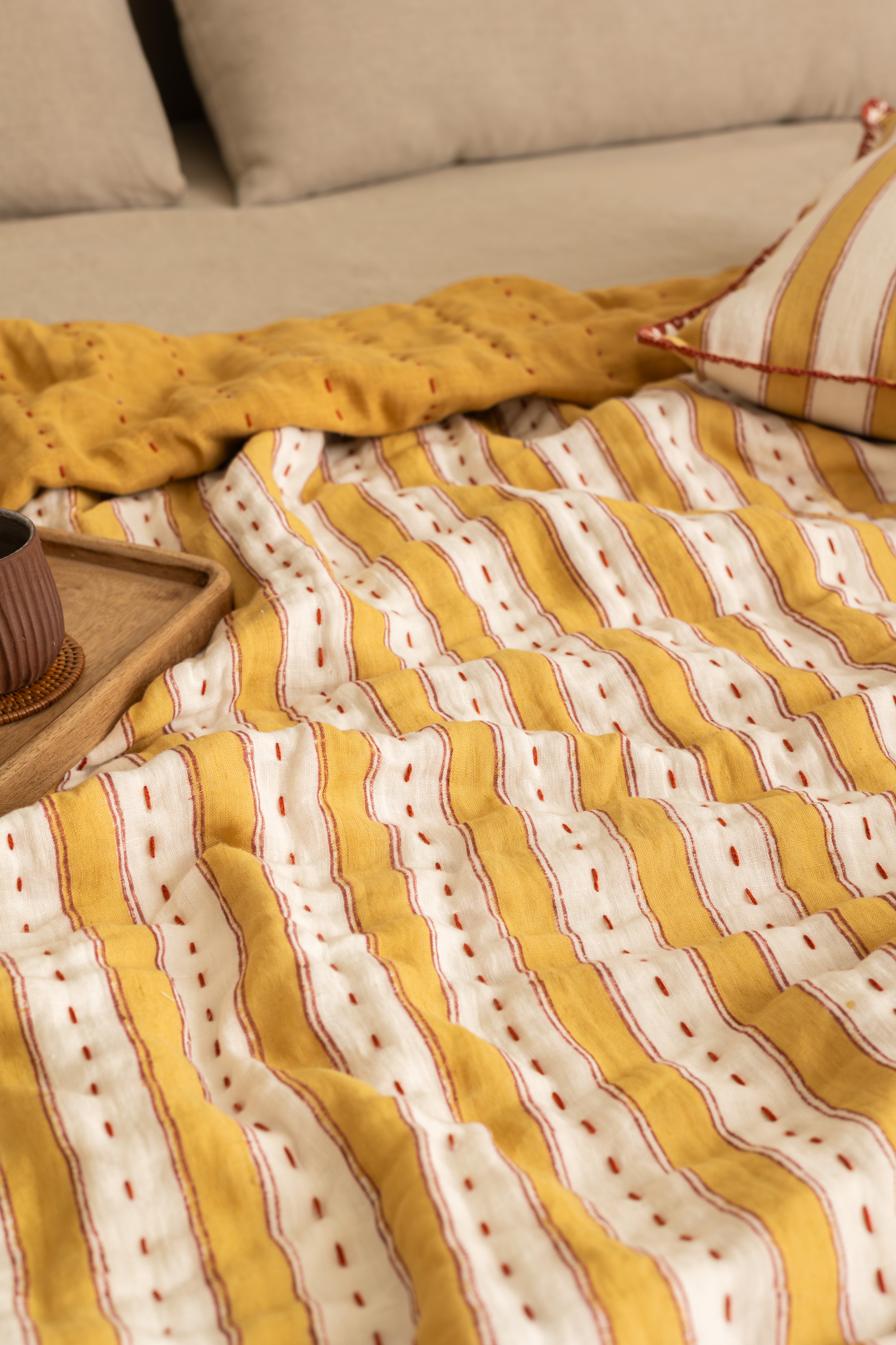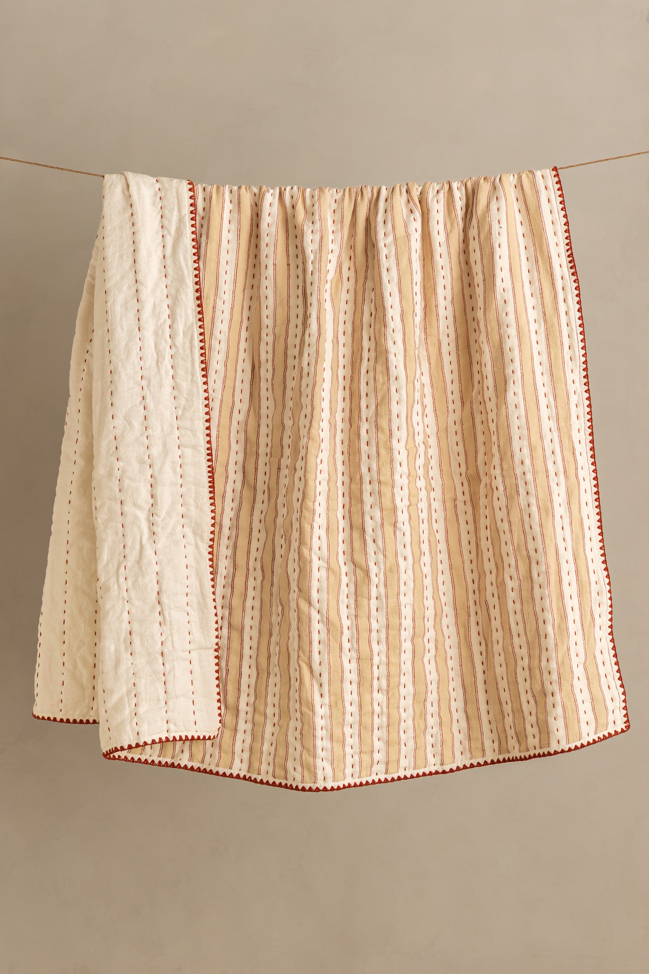 Woven from 100% European flax, our peach and white strip linen quilt is OEKO-TEX® certified, free from harmful chemicals, and safe for both you and the environment. Naturally hypoallergenic and antimicrobial, it supports healthy skin and promotes restful sleep.Finished with delicate embroidery along the edges, the quilt carries a subtle touch of heritage and traditional craftsmanship, adding depth and character to its timeless design. Durable, breathable, and endlessly cozy, this linen quilt is naturally sustainable, machine washable, and thoughtfully made to last.