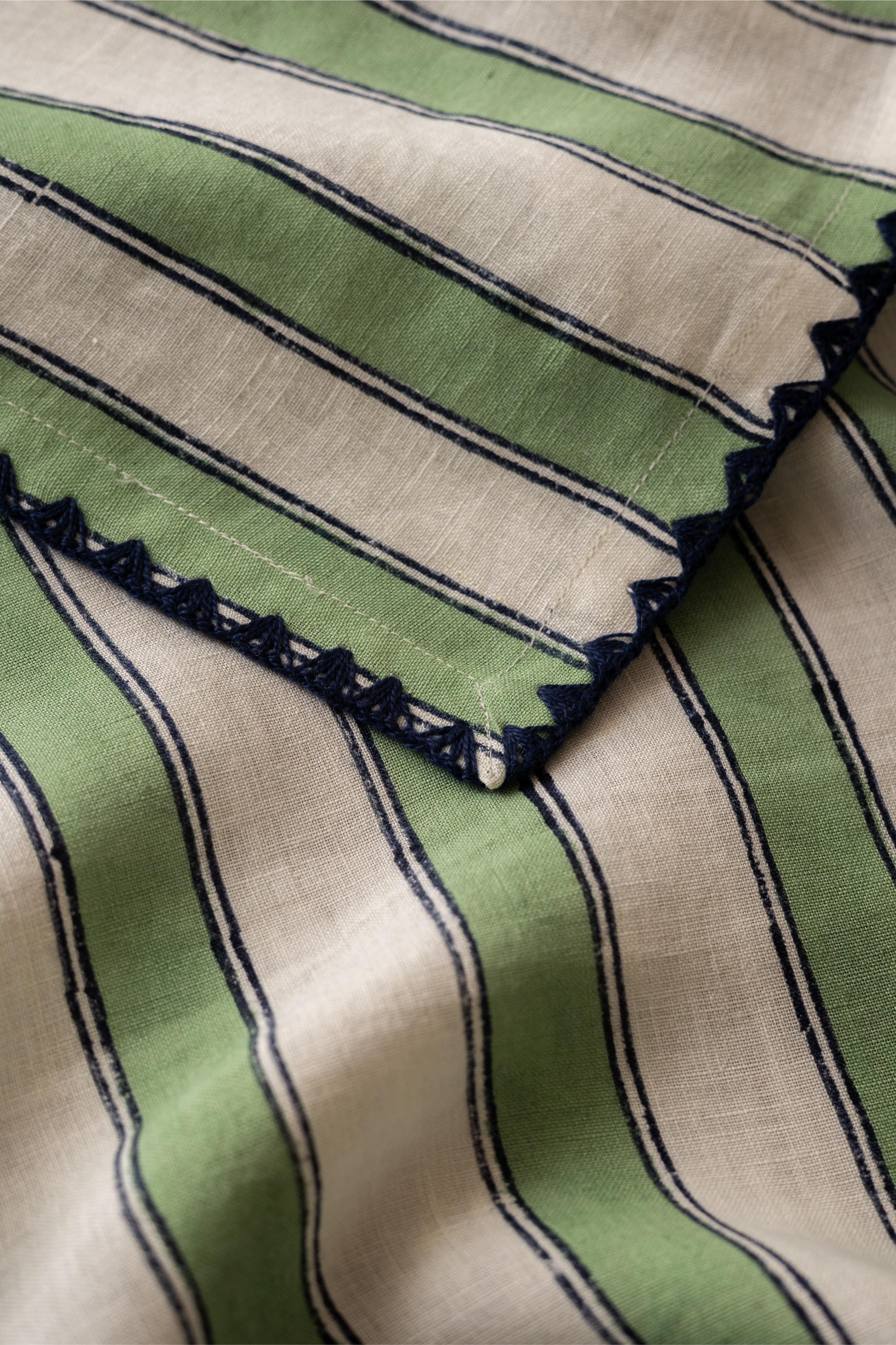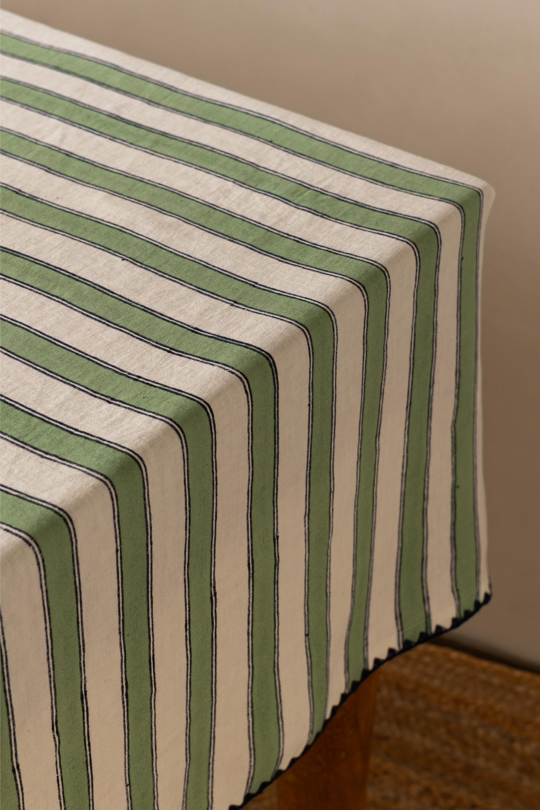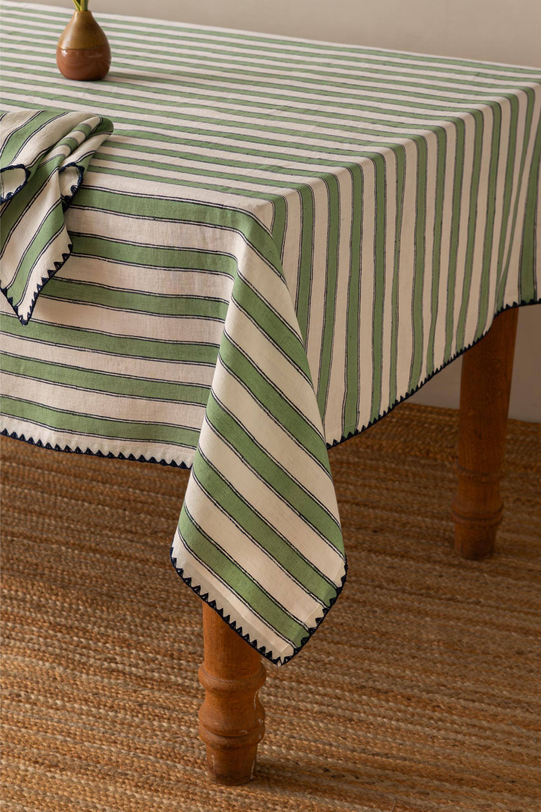 Linen Heritage Stripes Tablecloth features timeless striped design with handmade embroidered borders. Crafted from premium natural linen, it adds artisanal elegance to dining tables—perfect for festive gatherings, special occasions, and everyday luxury with sustainable, breathable comfort.