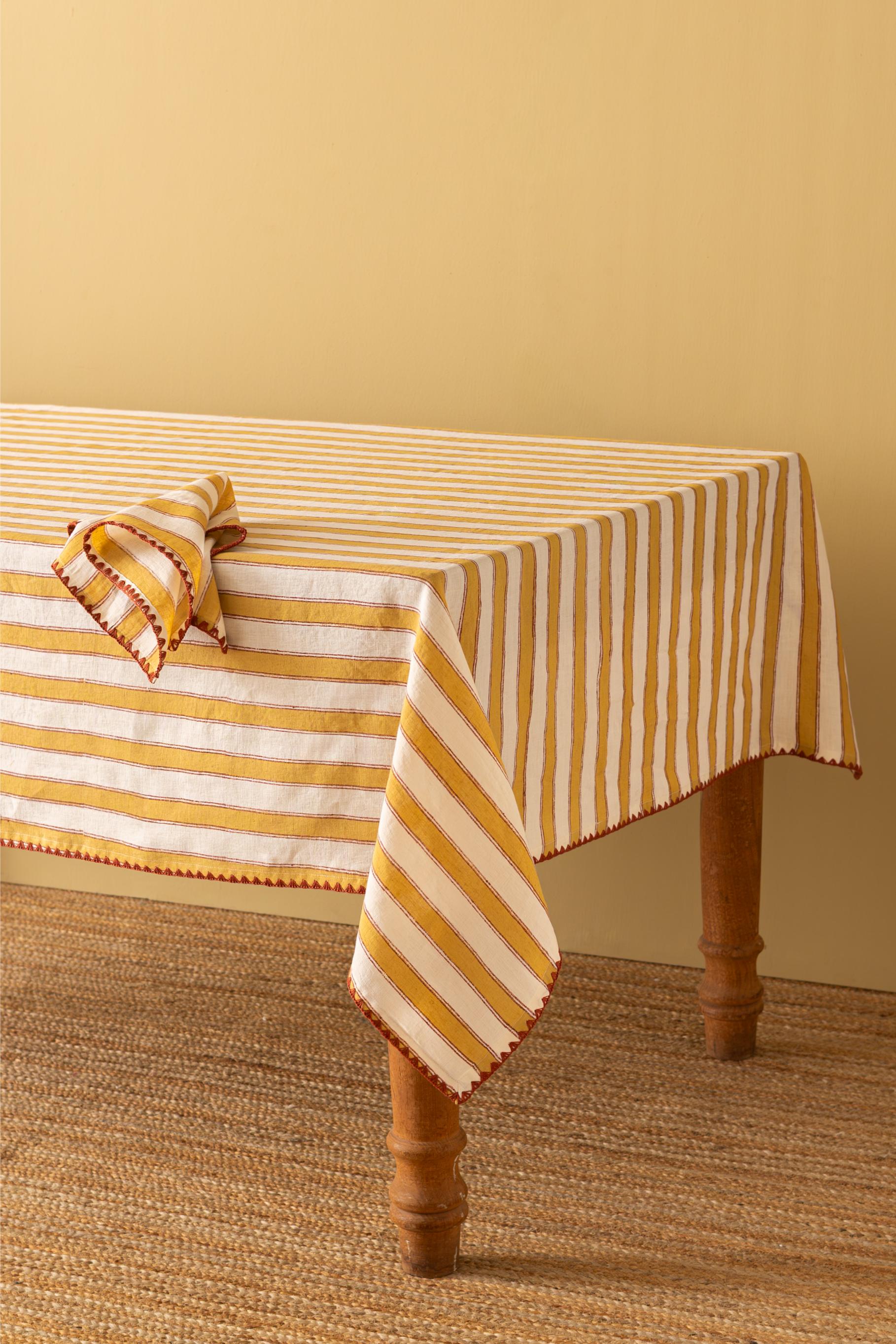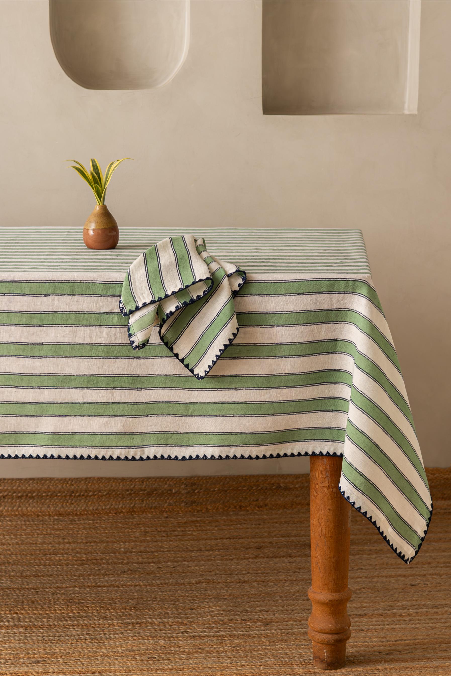 Linen Heritage Stripes Tablecloth features timeless striped design with handmade embroidered borders. Crafted from premium natural linen, it adds artisanal elegance to dining tables—perfect for festive gatherings, special occasions, and everyday luxury with sustainable, breathable comfort.