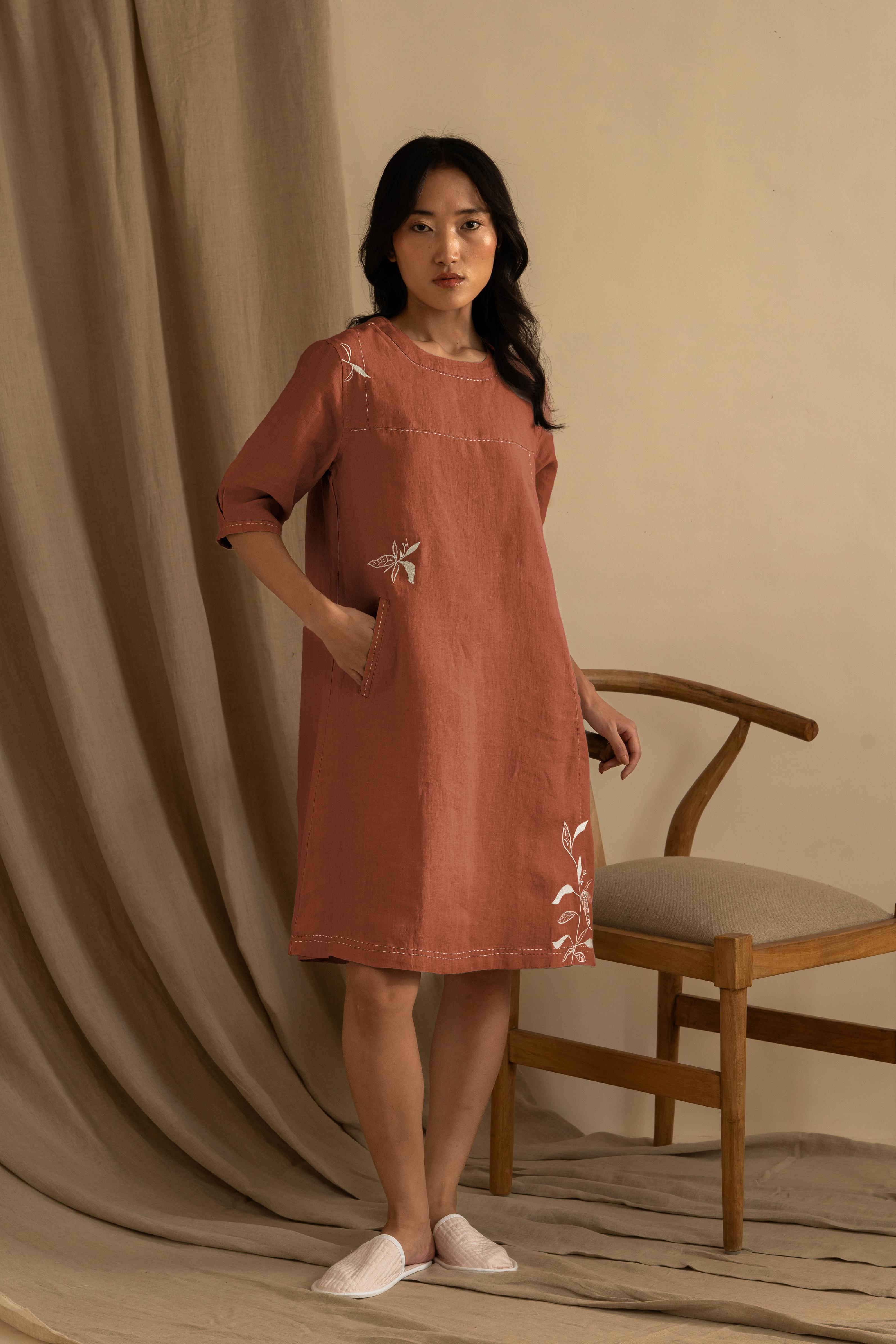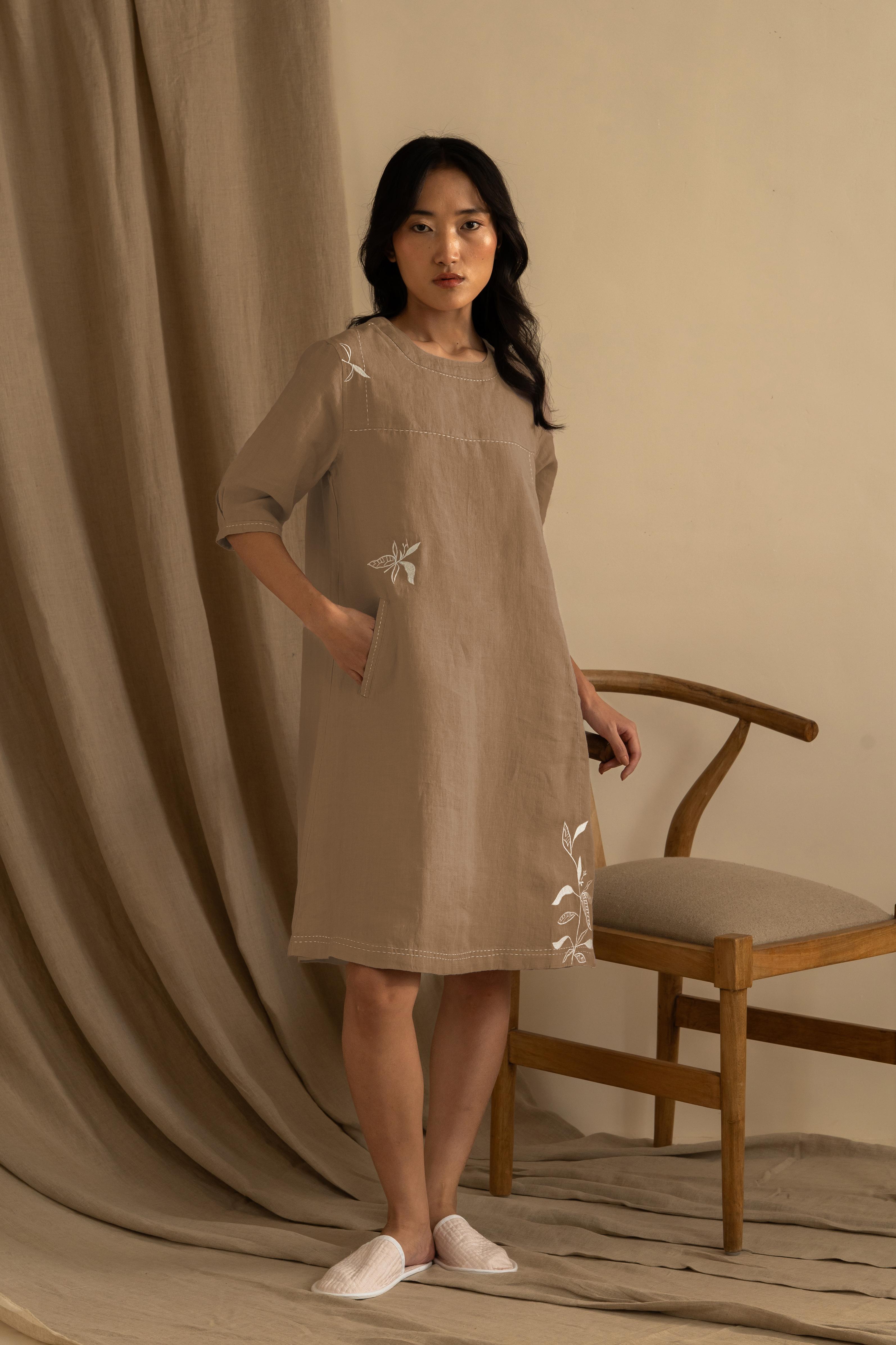 Let the warmth of our Linen Lavinia Dress delicately capture your beauty. The machine-embroidered motifs and intricate detailing bring the silhouette together. Shop for comfort now.