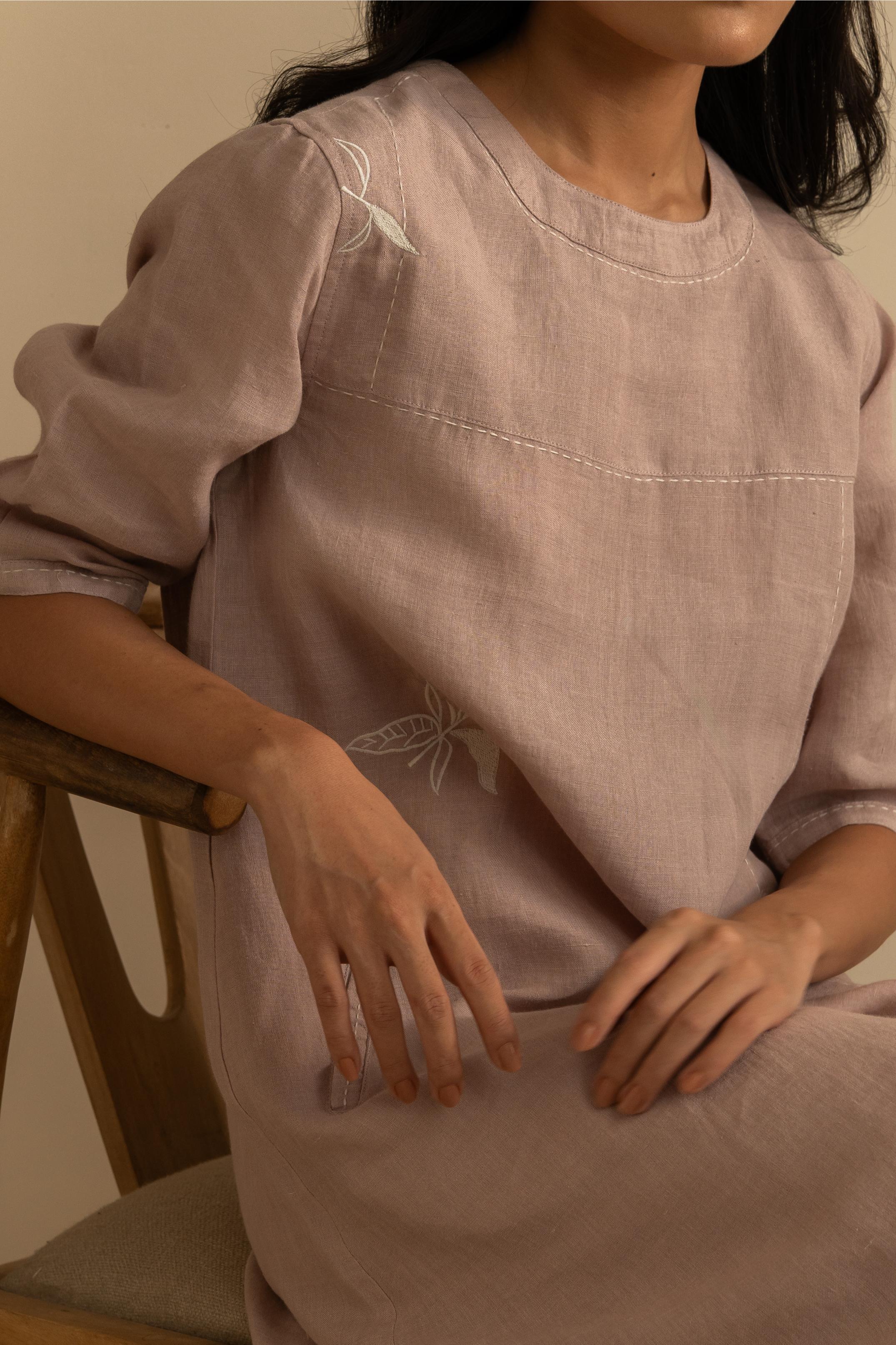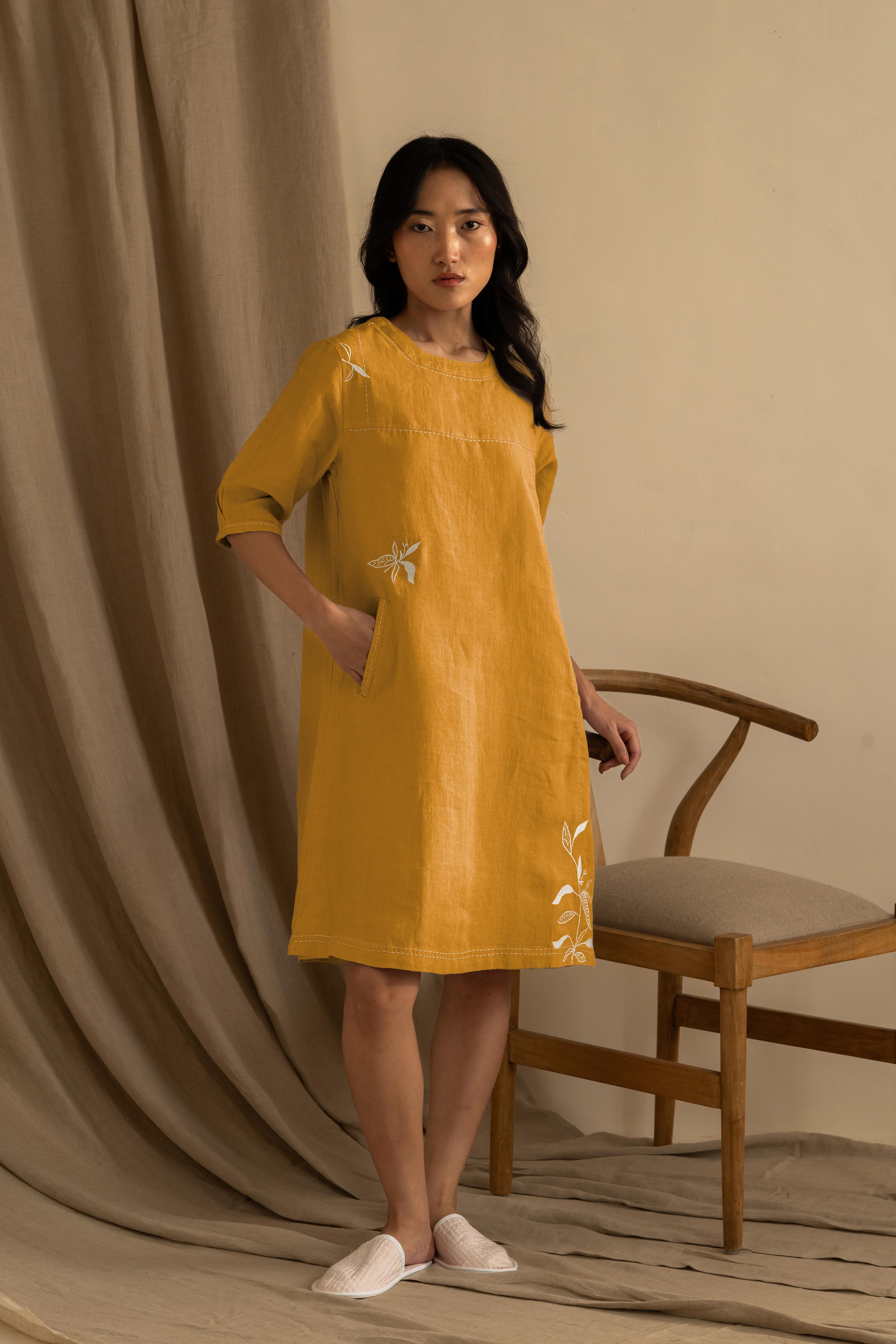 Let the warmth of our Linen Lavinia Dress delicately capture your beauty. The machine-embroidered motifs and intricate detailing bring the silhouette together. Shop for comfort now.