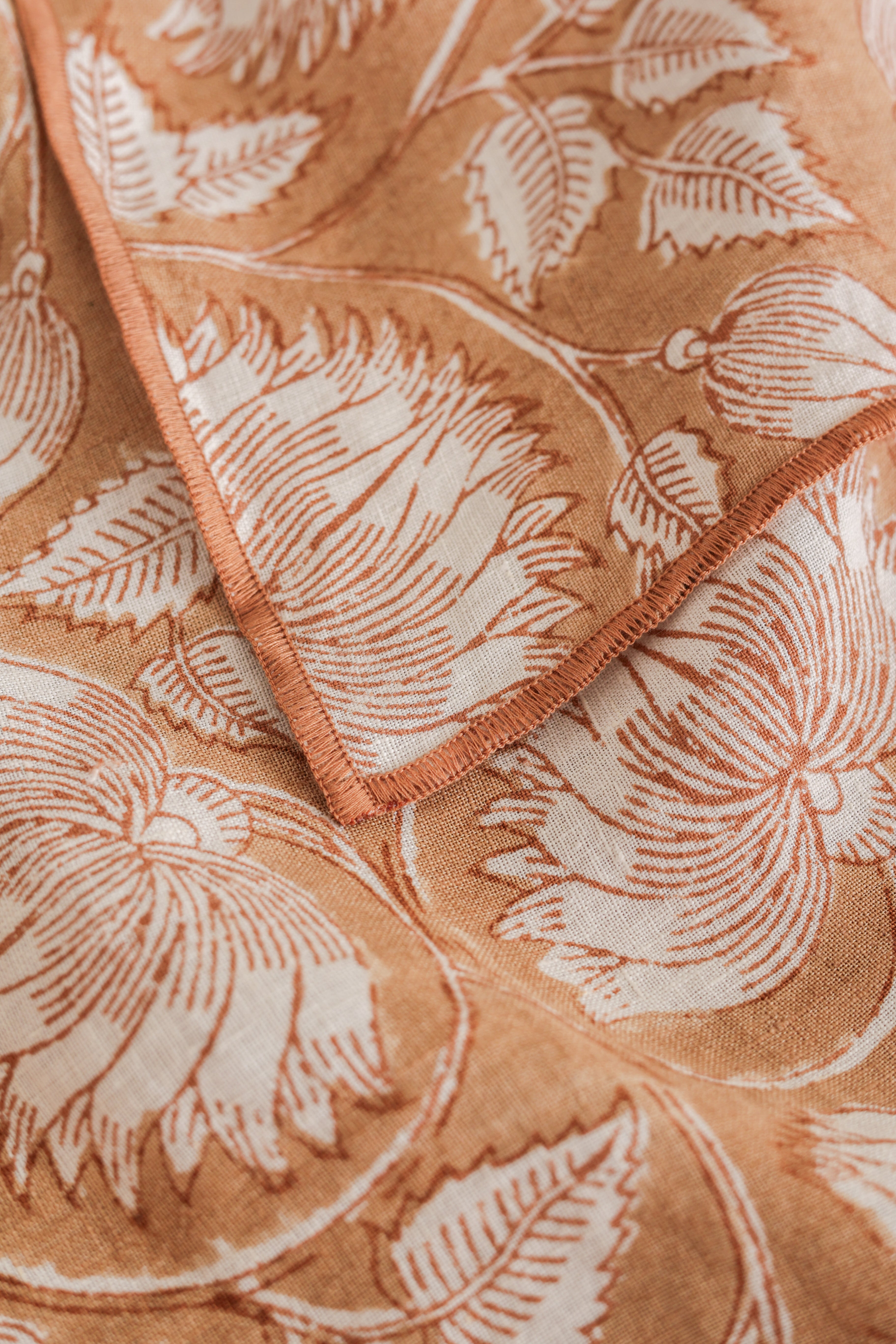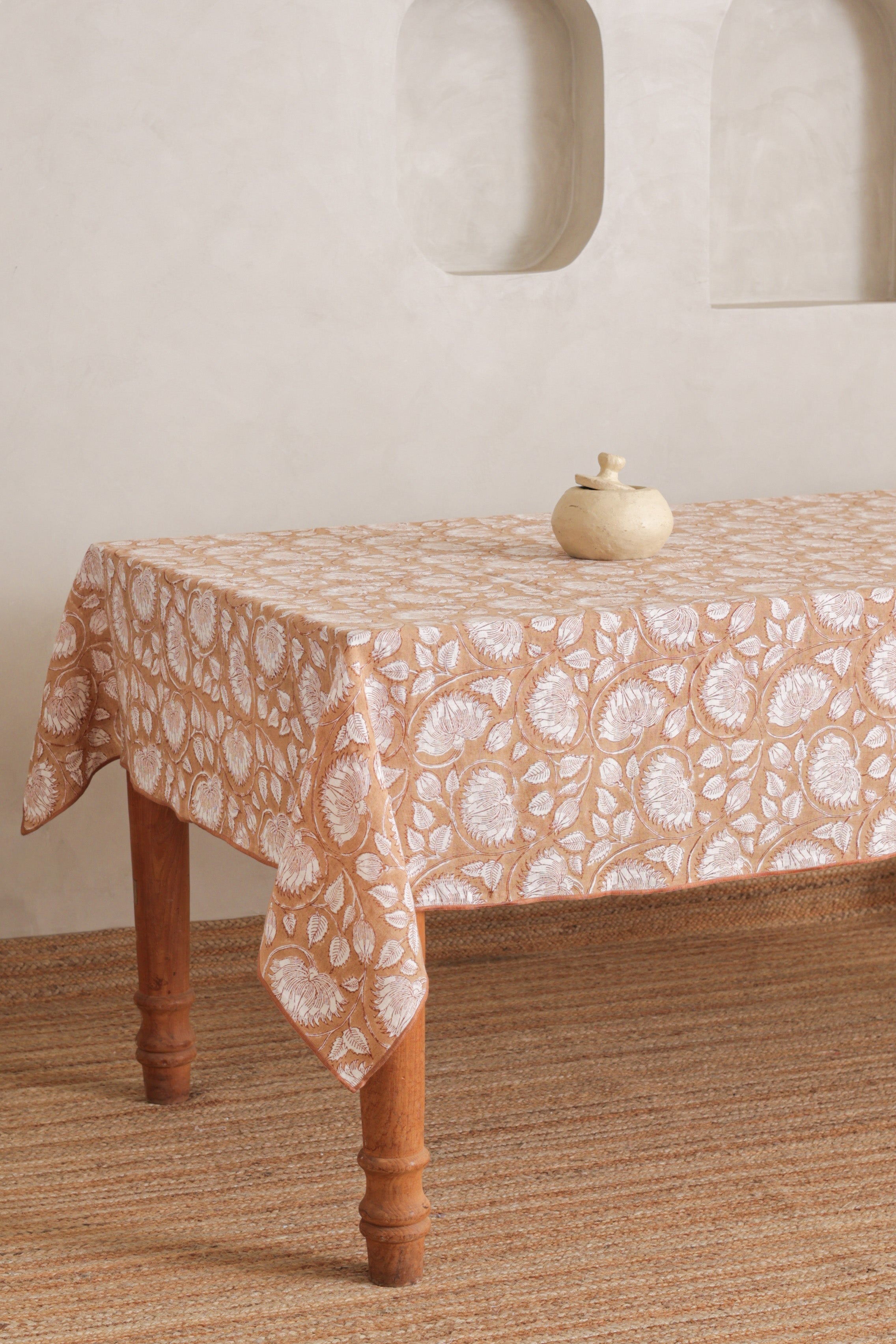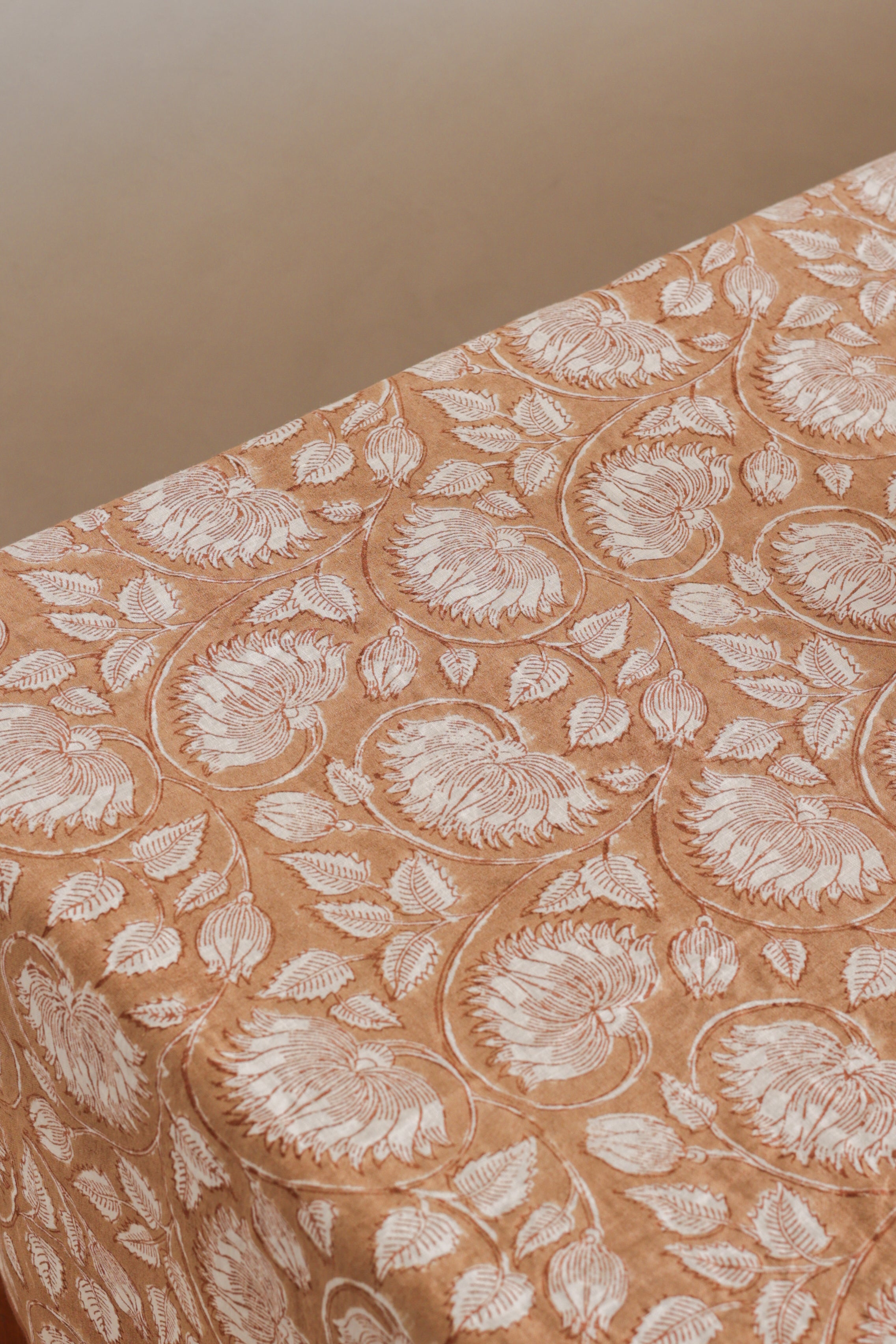 A beautiful Linen tablecloth for special lunches and dinners. This Linen floral block print Tablecloth is made with 100% natural Europeon flex linen so that it drapes the table beautifully. Inspired by flowers, block print patterns and wall paintings in India - Pair it with brass cutlery or ceramic dinnerware for a coordinated, modern and luxury look. Protect your dining table from spills and scratches while adding style.