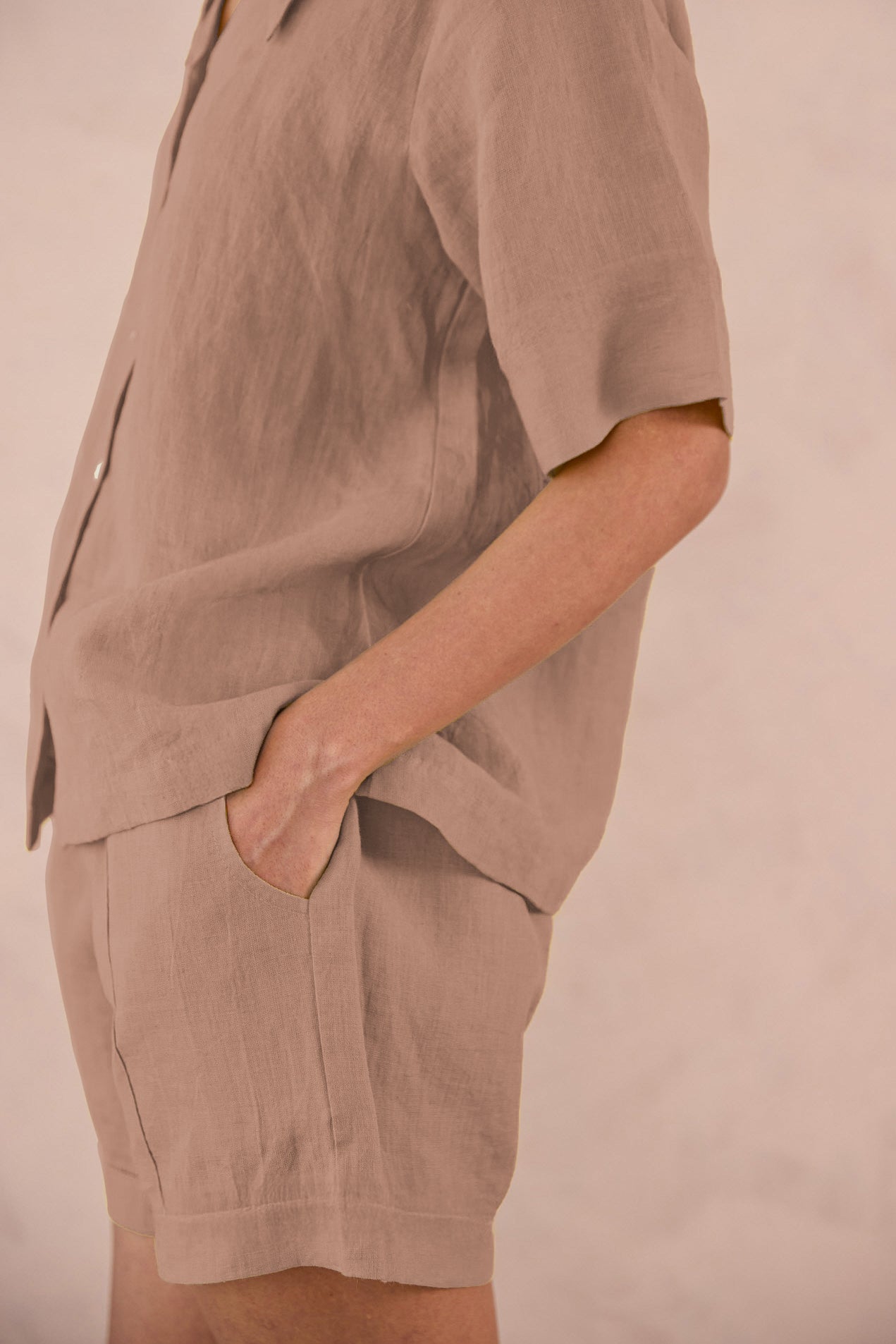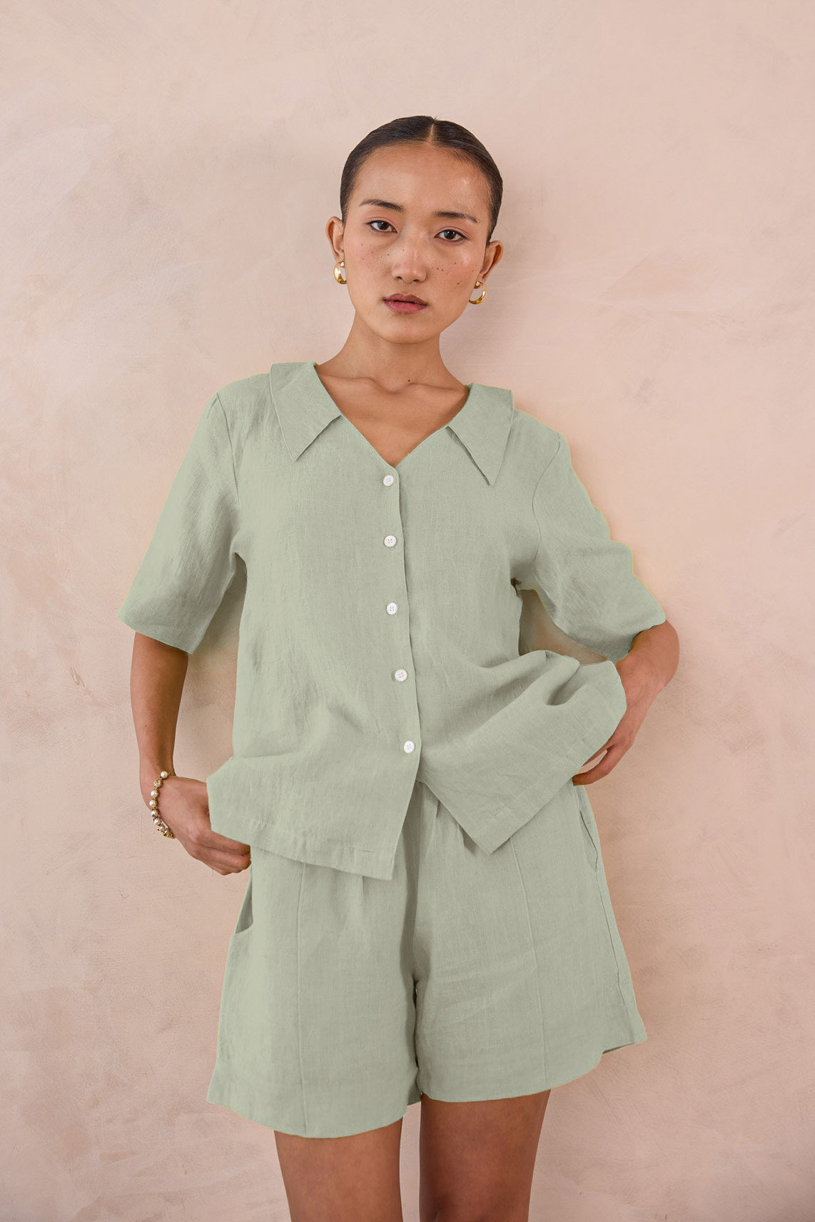 Discover the art of breath comfortably with our Linen Lyla Co-ord. A co-ord set for the breezy days and sunlit noons to hangout with your loved ones. The laid-back style of this outfit with standard collar and v-neckline is an absolute hit, added with the comfy shorts the entire ensemble brings ultimate elegance.