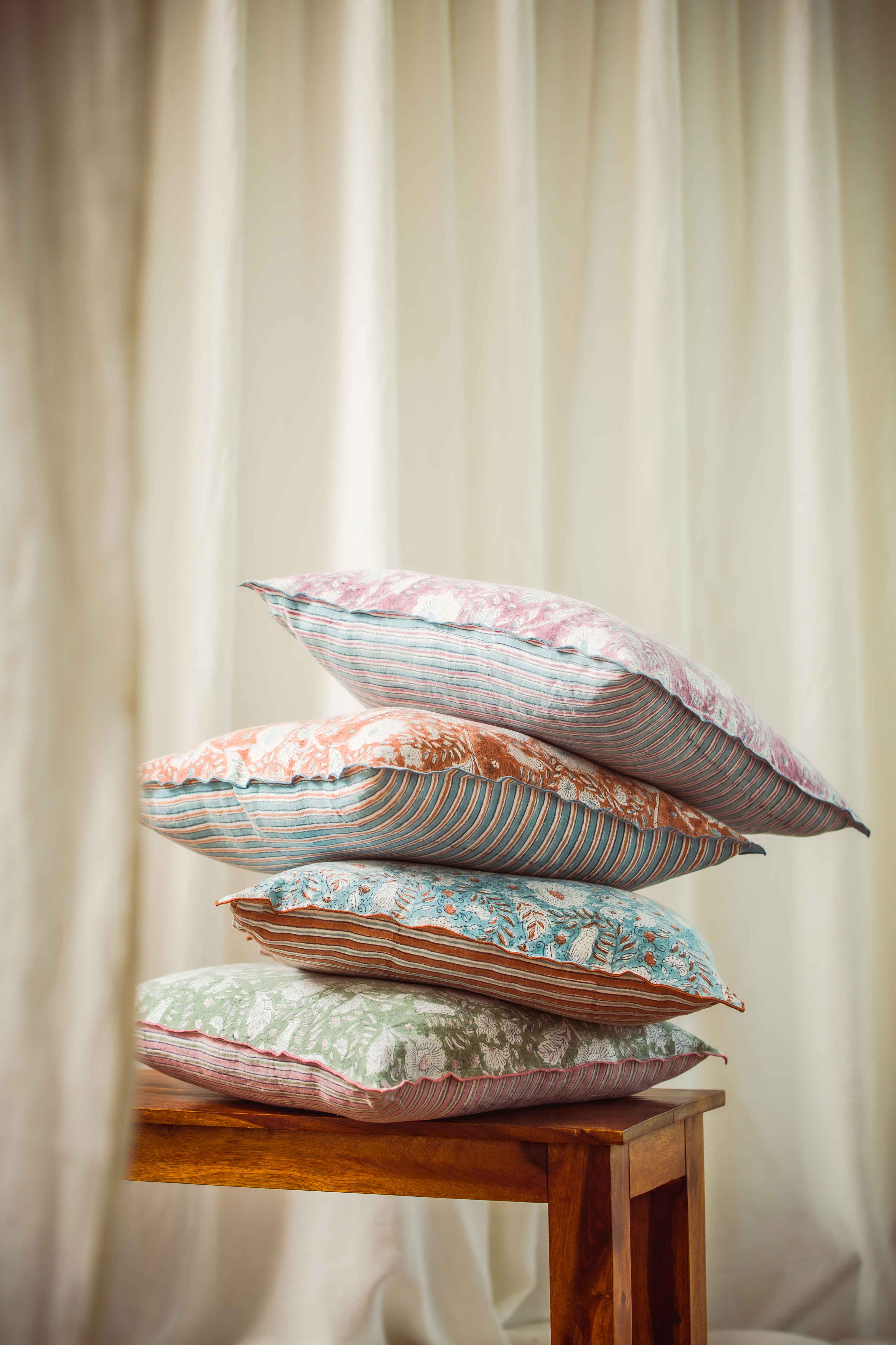 Our Linen Mabel Cushion Cover/Pillowcase is designed carefully with the art of expression in the form of the most laborious practice of hand block printing. The everlasting fashion of striped patterns will keep you always in trend while the touch of European Linen keeps you comforted. These naturally designed reversible patterns of both floral and stripes on either side of the cushion cover/pillowcase will give you a sound sleep and snug feeling. The consciously crafted creations are blended with three different hued stripes and are secured with a zipper, so lay your hands on them today!