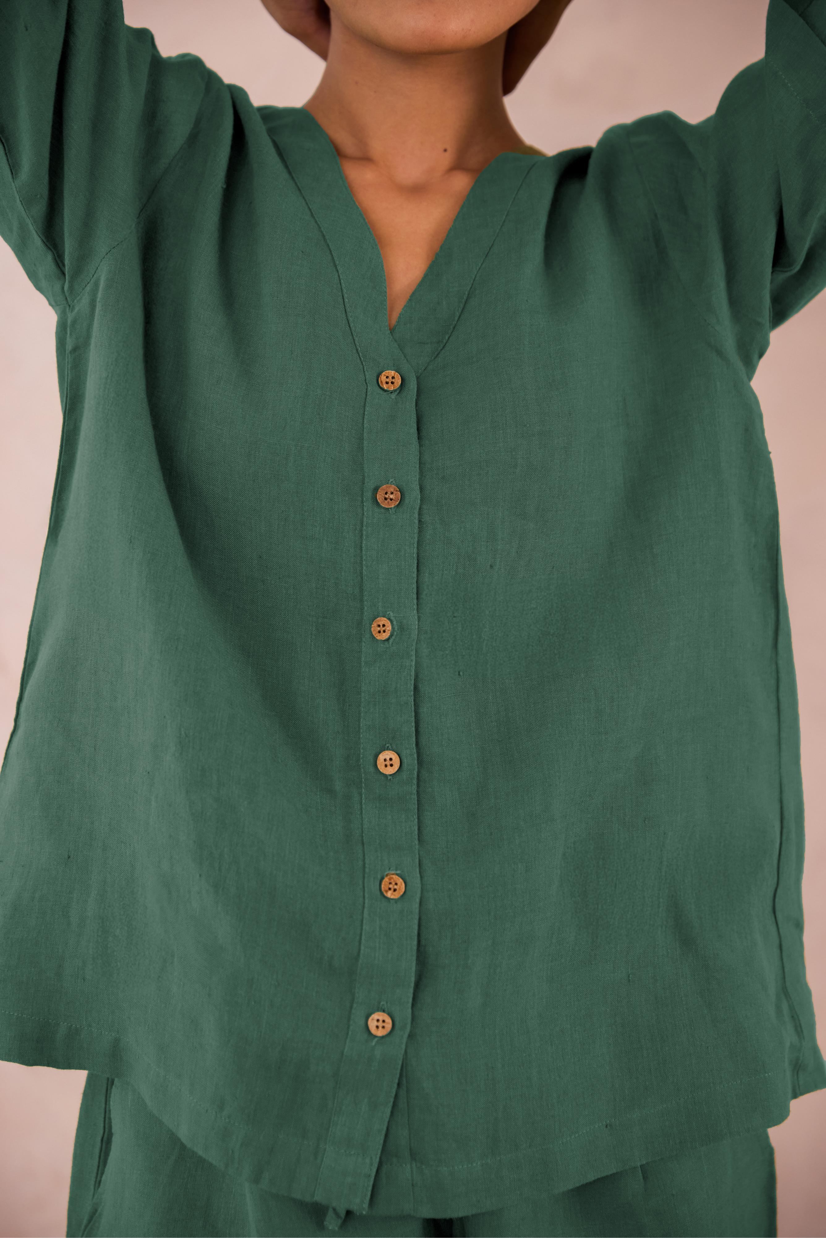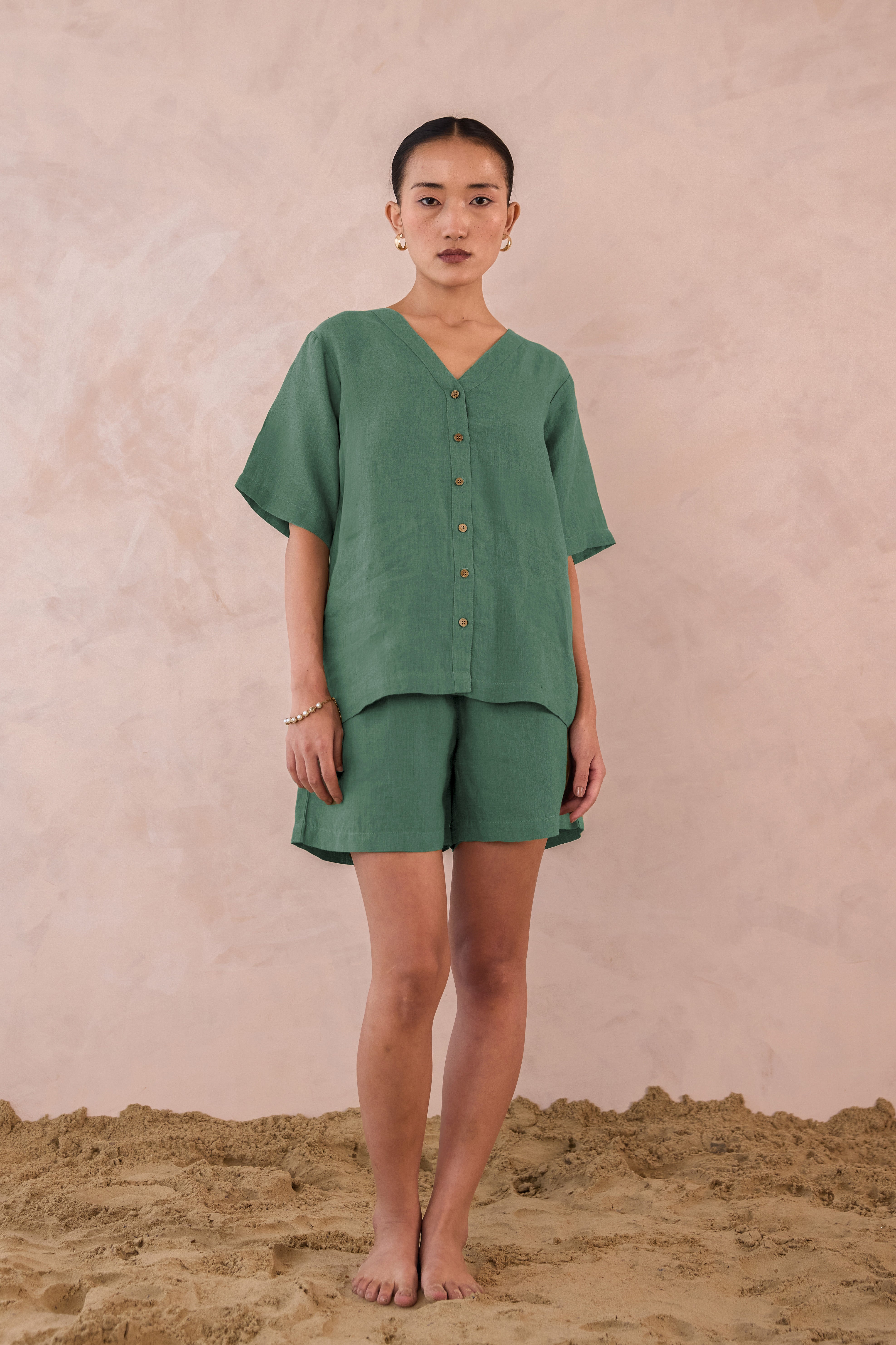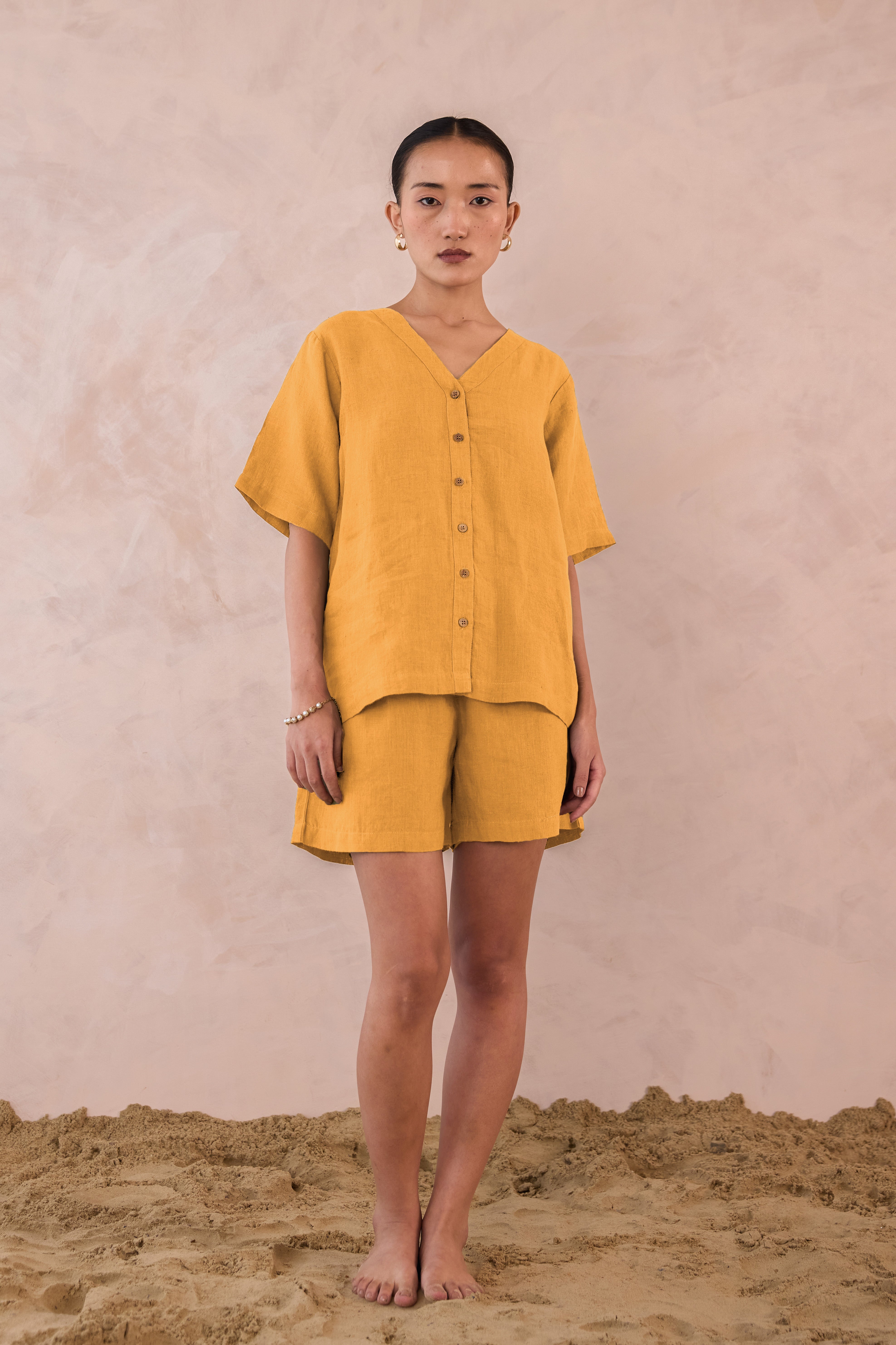 Here is our Linen Meliana Co-ord crafted with eternal grace and skilled efforts. The V-neckine of the shirt and simple shorts with twin pockets make this co-ord set simply beautiful. There is a gorgeous gathering at the back of shirt that will bring everyone's attention effortlessly, shop this stylish linen co-ord set today.
