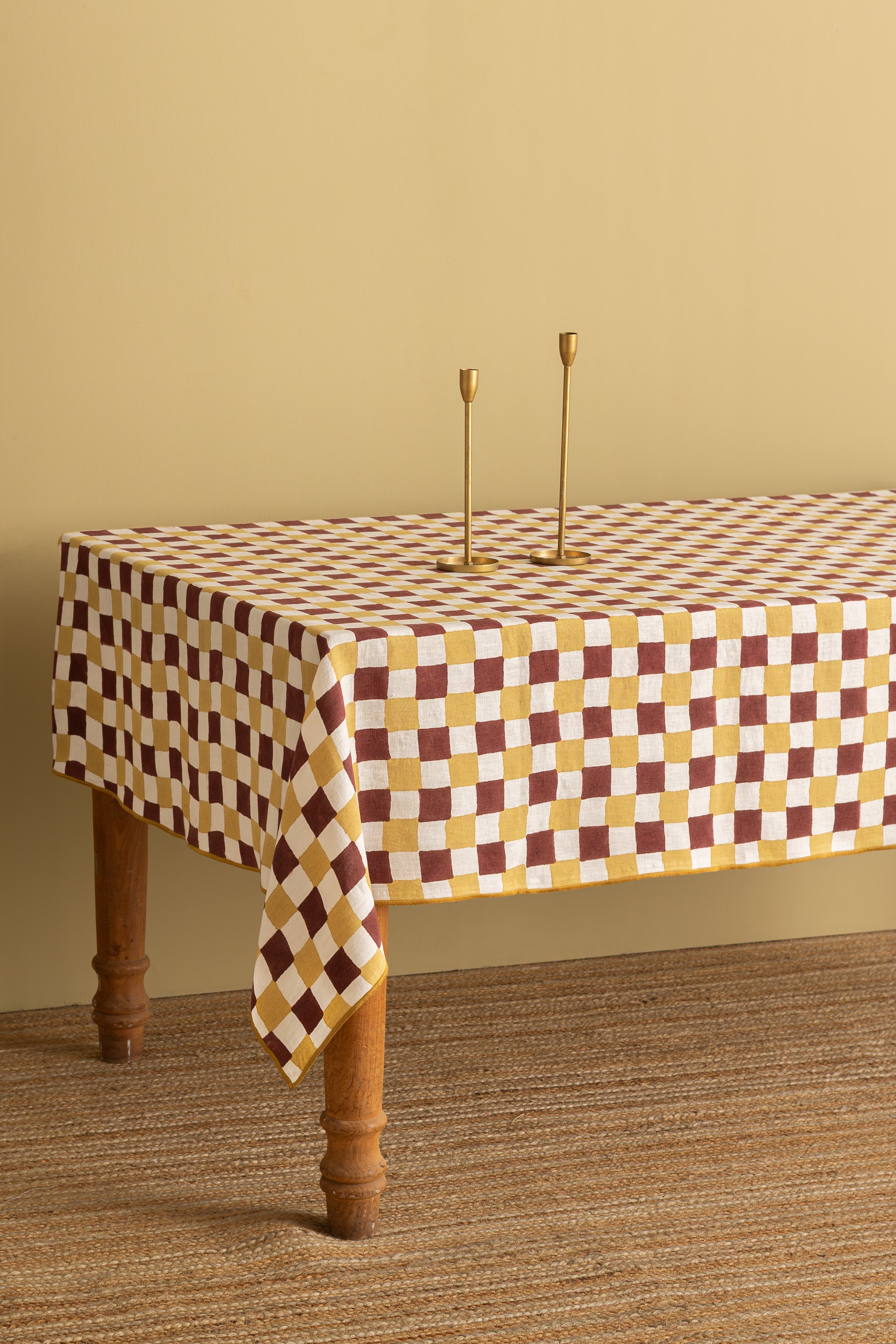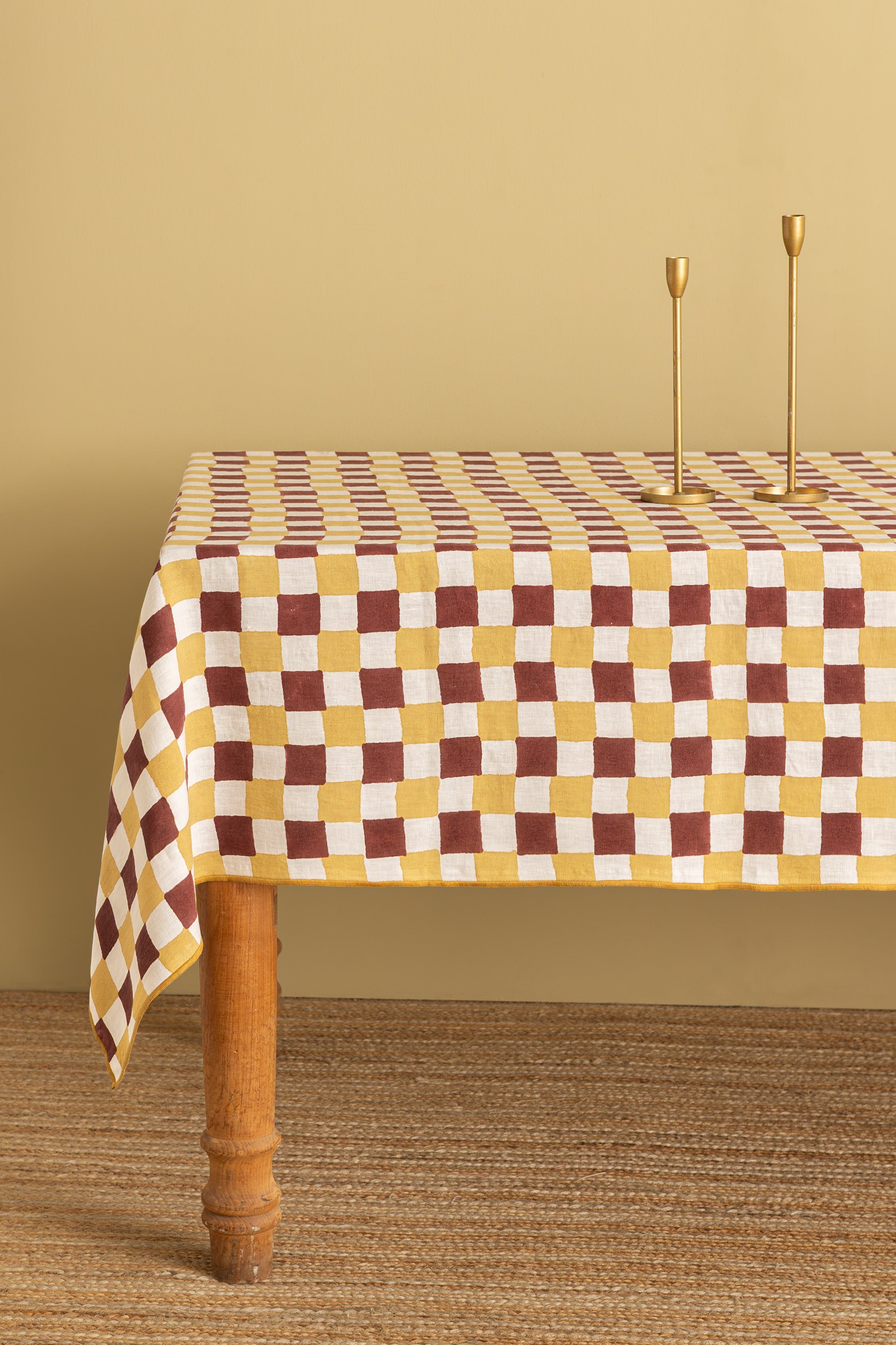 Linen mustard and white checkered tablecloth is crafted using traditional Indian hand block printing techniques. Accented with earthy red tones and finished with hand-stitched red thread embroidery, it celebrates heritage craftsmanship, natural linen texture, and timeless geometric design—perfect for everyday dining and festive tables alike.