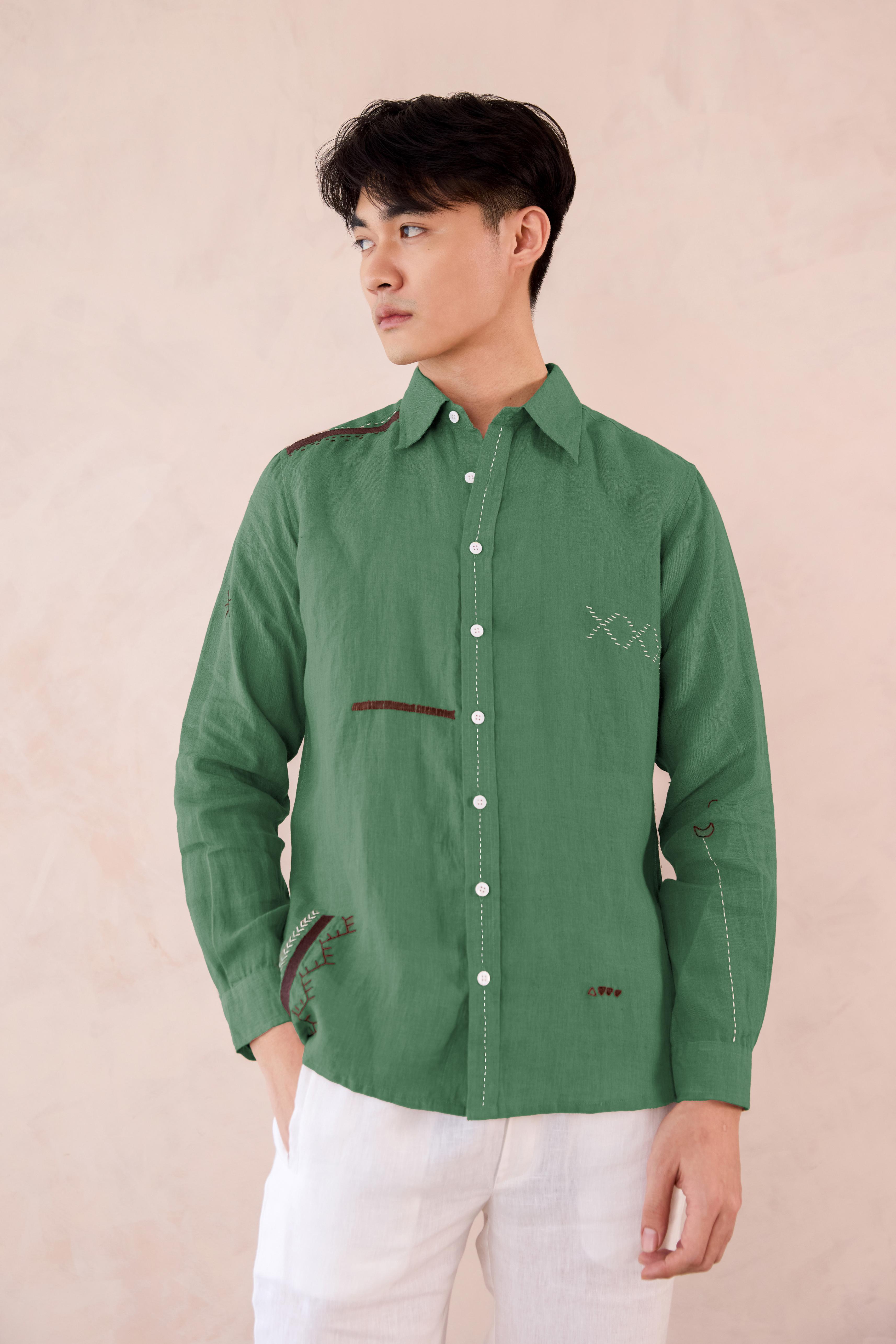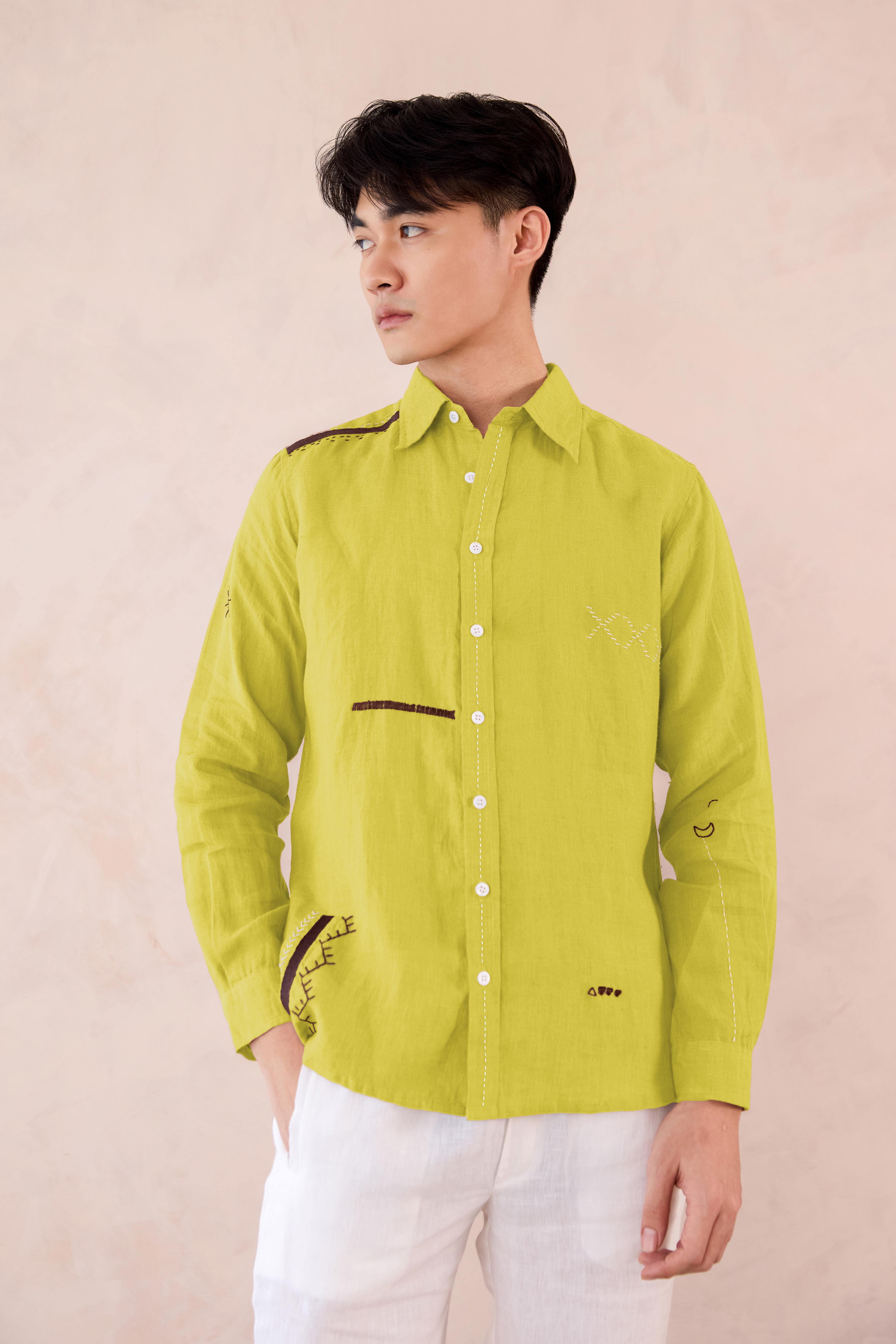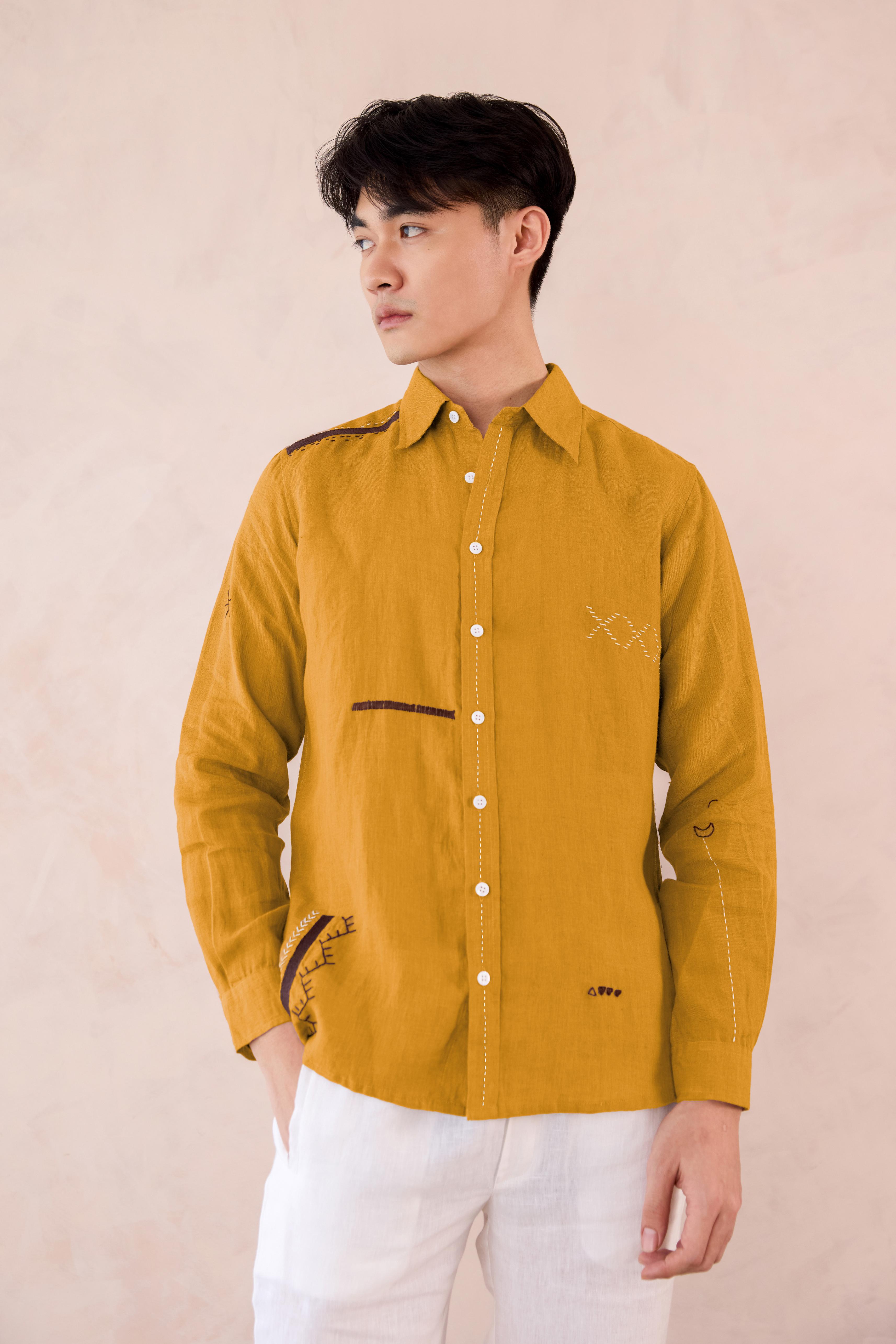 Embrace the mindful look of our Linen Peter Shirt. An ideal outfit for your special outings, crafted with premium European Linen for maximum softness. The shirt is graced with minimal embroidered elements around it for a beautiful composed touch.