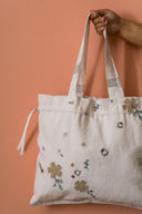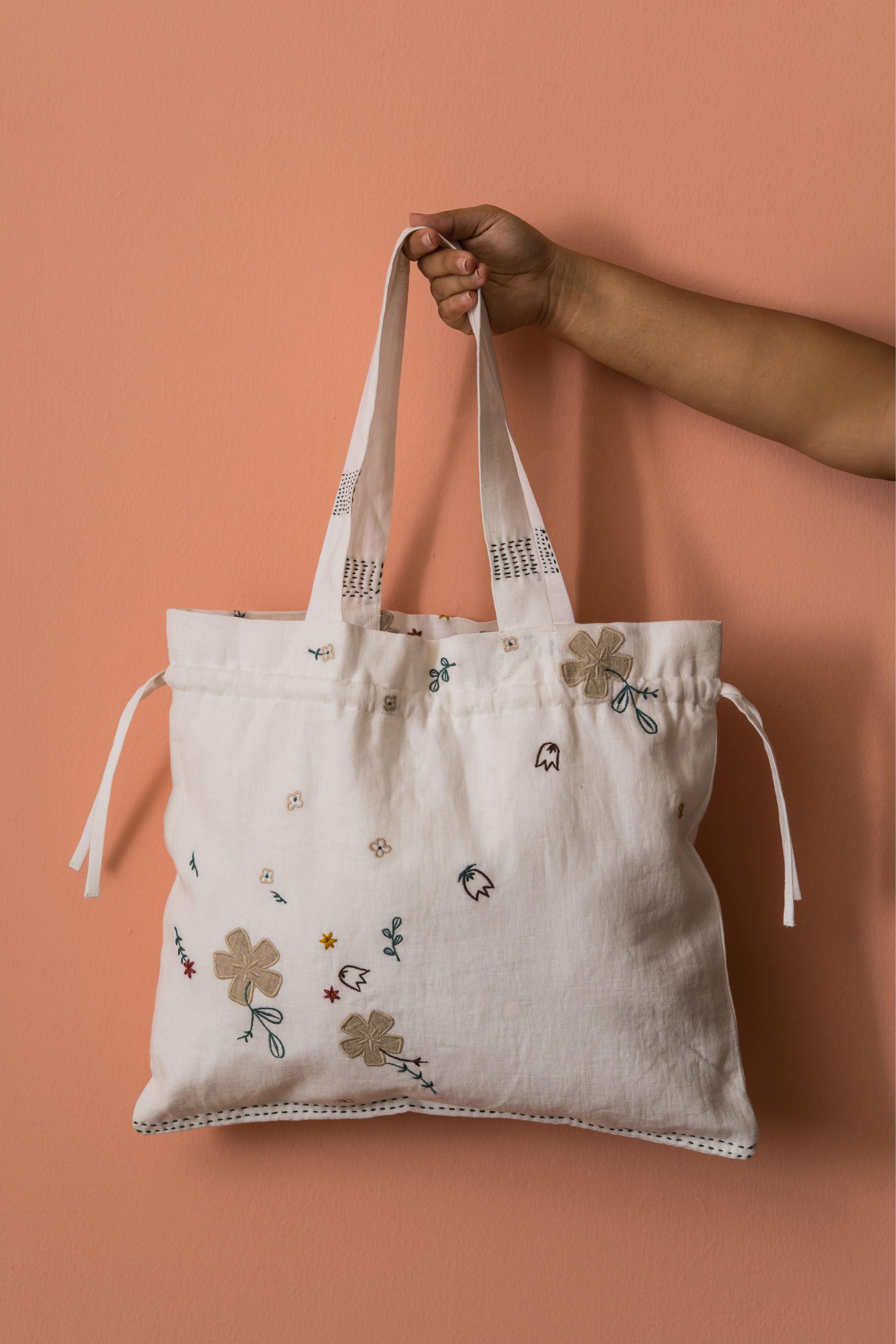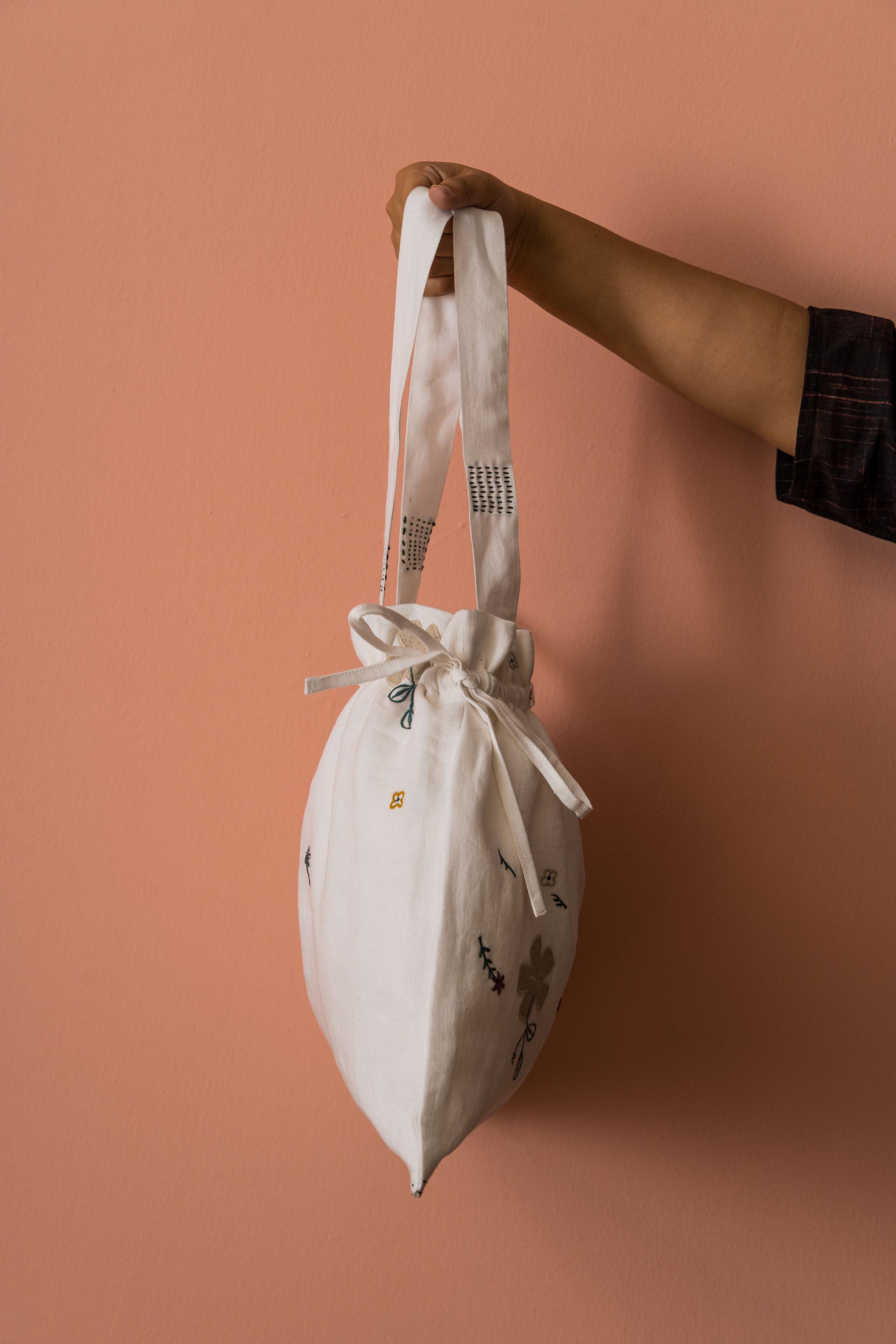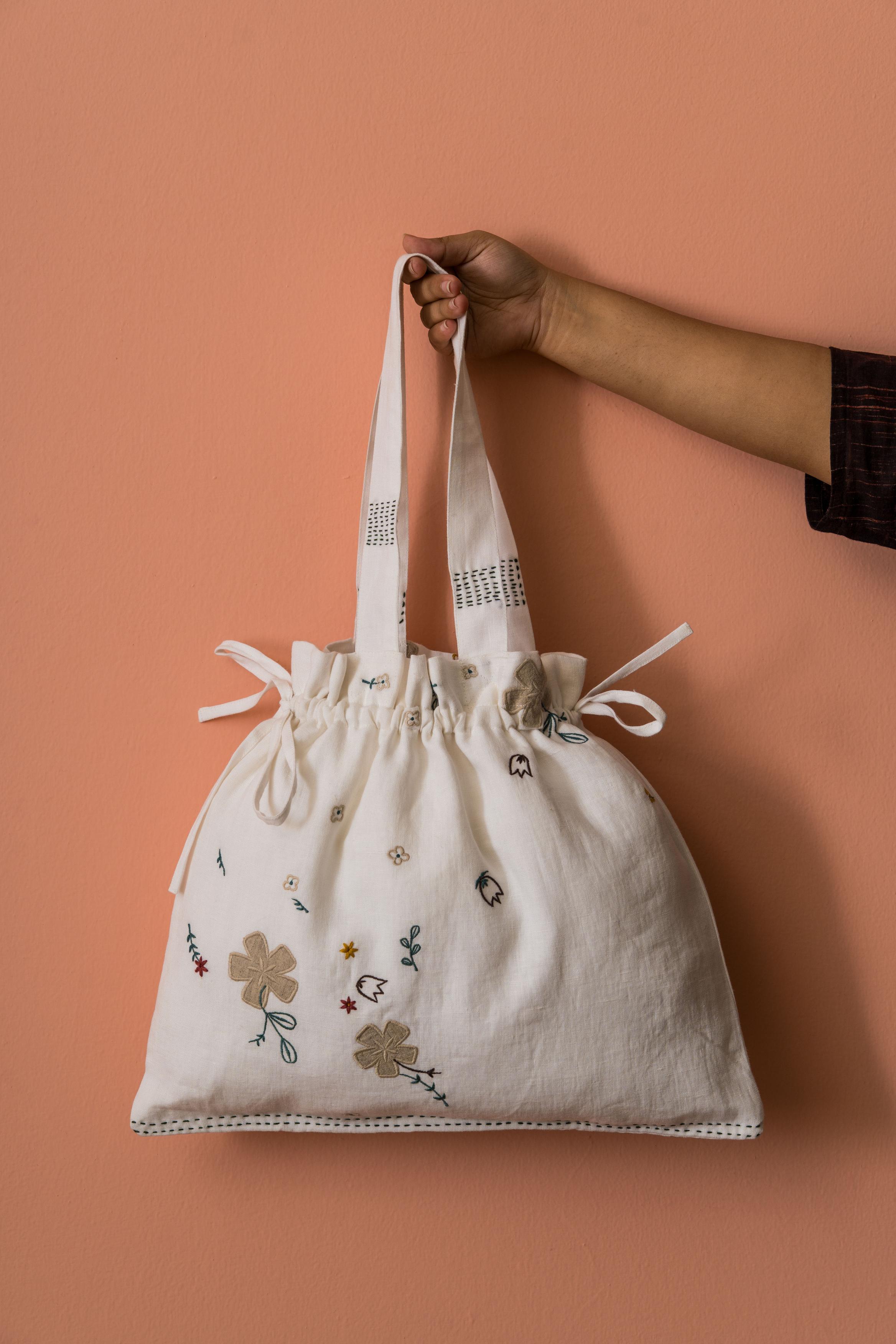 The Poetry Drawstring Bag is an immaculate accessory to own, offering plenty of space for all your essentials. It features an elasticated drawstring closure keeping it easy for you to use it frequently. This gentle European Linen accentuates your outfit with hand-embroidered tiny floral applique motifs. Bring it home today!