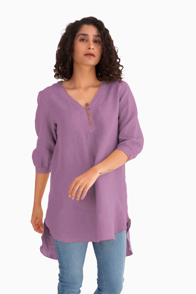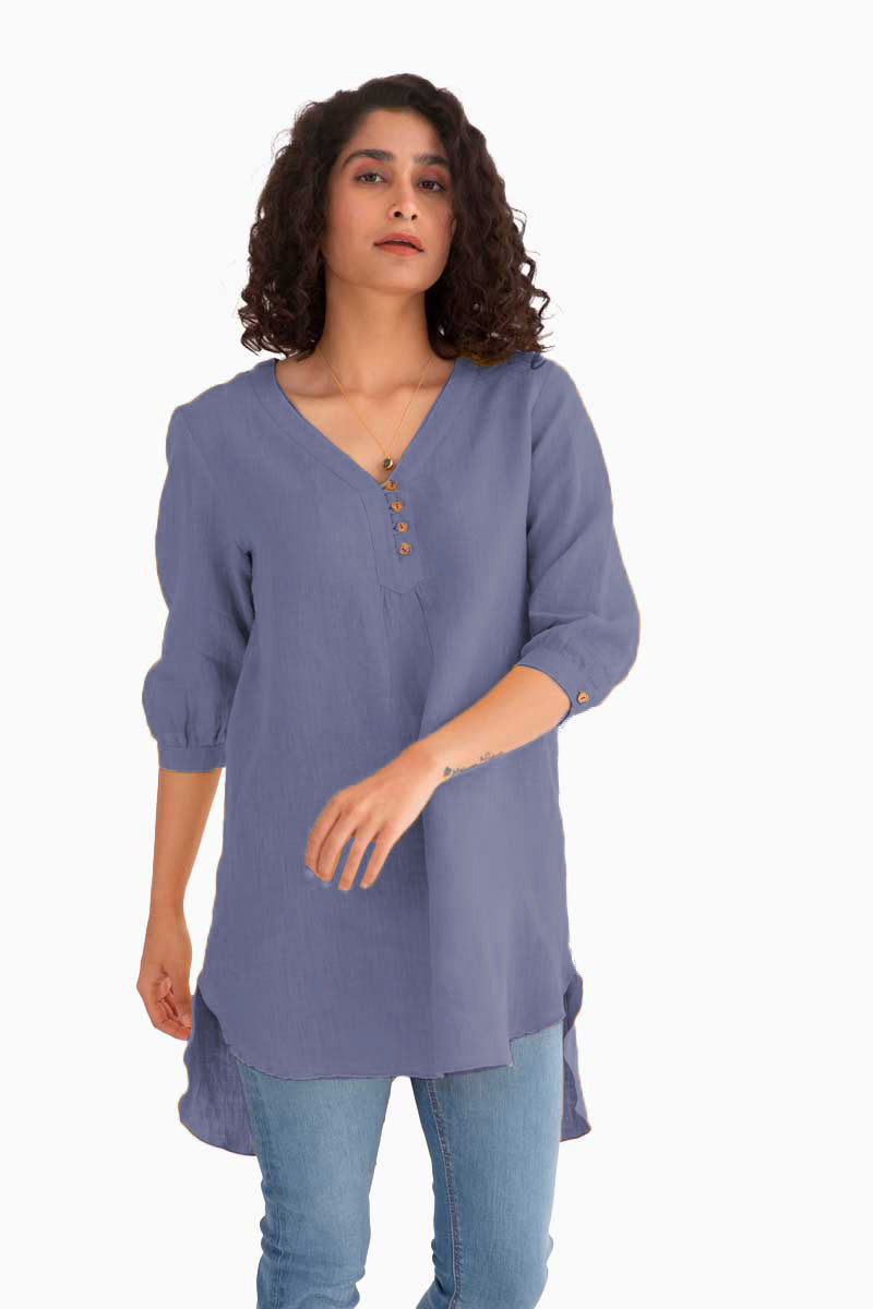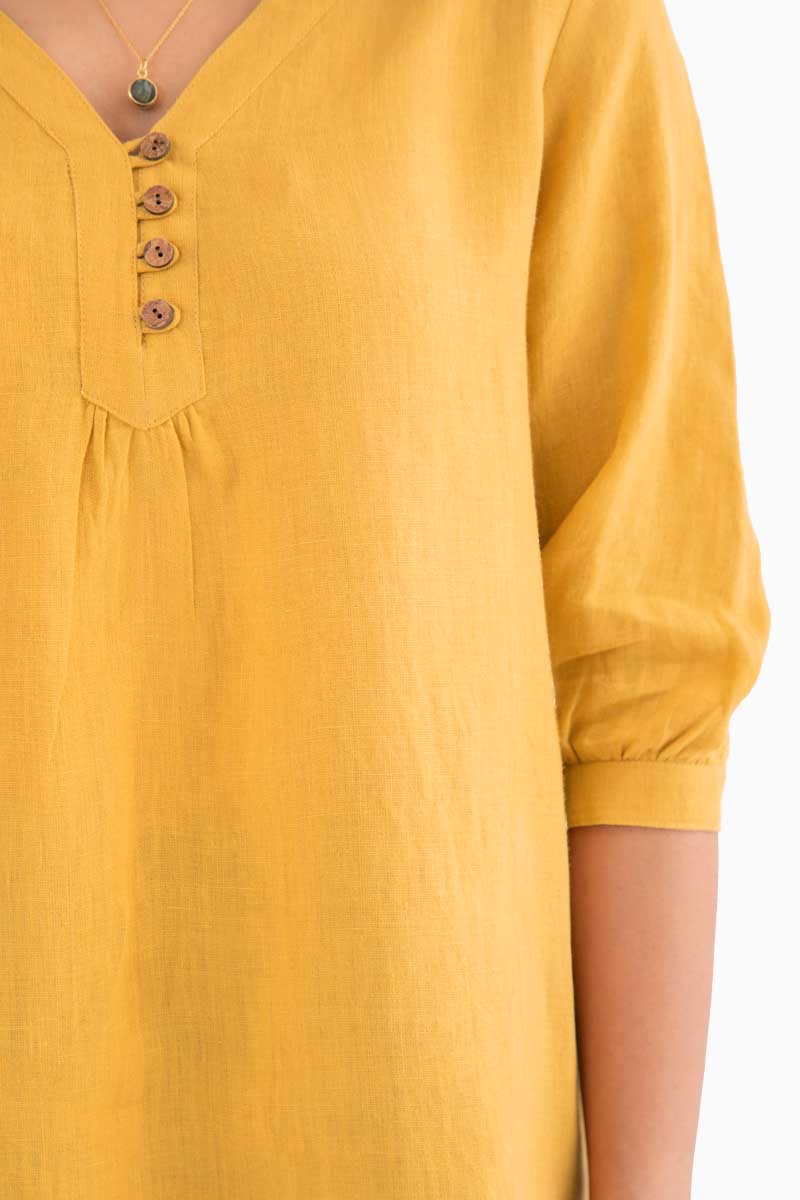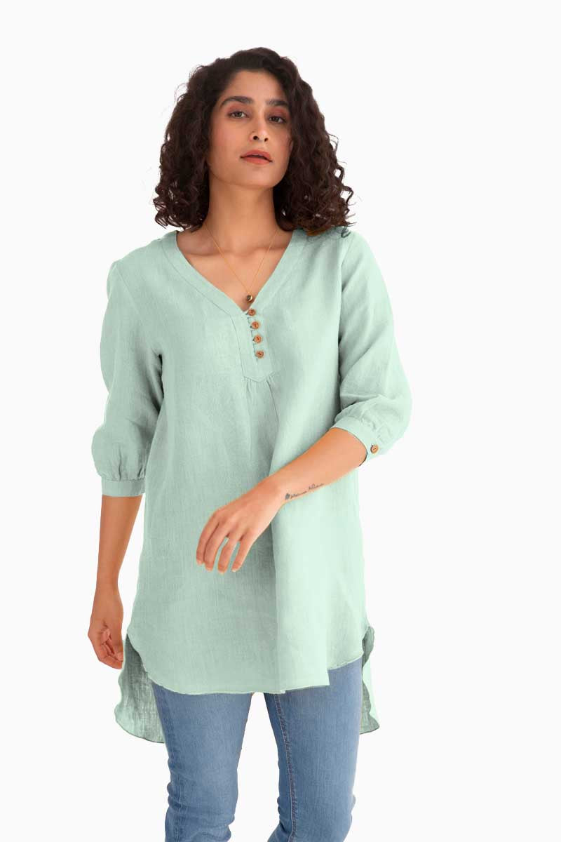 An exquisite Linen Primrose Top with a classy design and coconut husk button adorned on the front awaits! The three-fourth sleeve pattern softly wrapped around with the creases can bring you many compliments. The breathable linen top is perfect for summer or any weather because of the temperature-regulating qualities of linen.