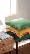 Linen Ruffle Medley Cushion Cover In Retro Green: The fashion of our vintage-style Linen Ruffle Medley Cushion Covers/Pillowcases will personalize your home with the artistic love of our craftsmen. Our European Linens are handwrought with skilled efforts and soft ruffles all around the borders. Shop the look for your living area today!