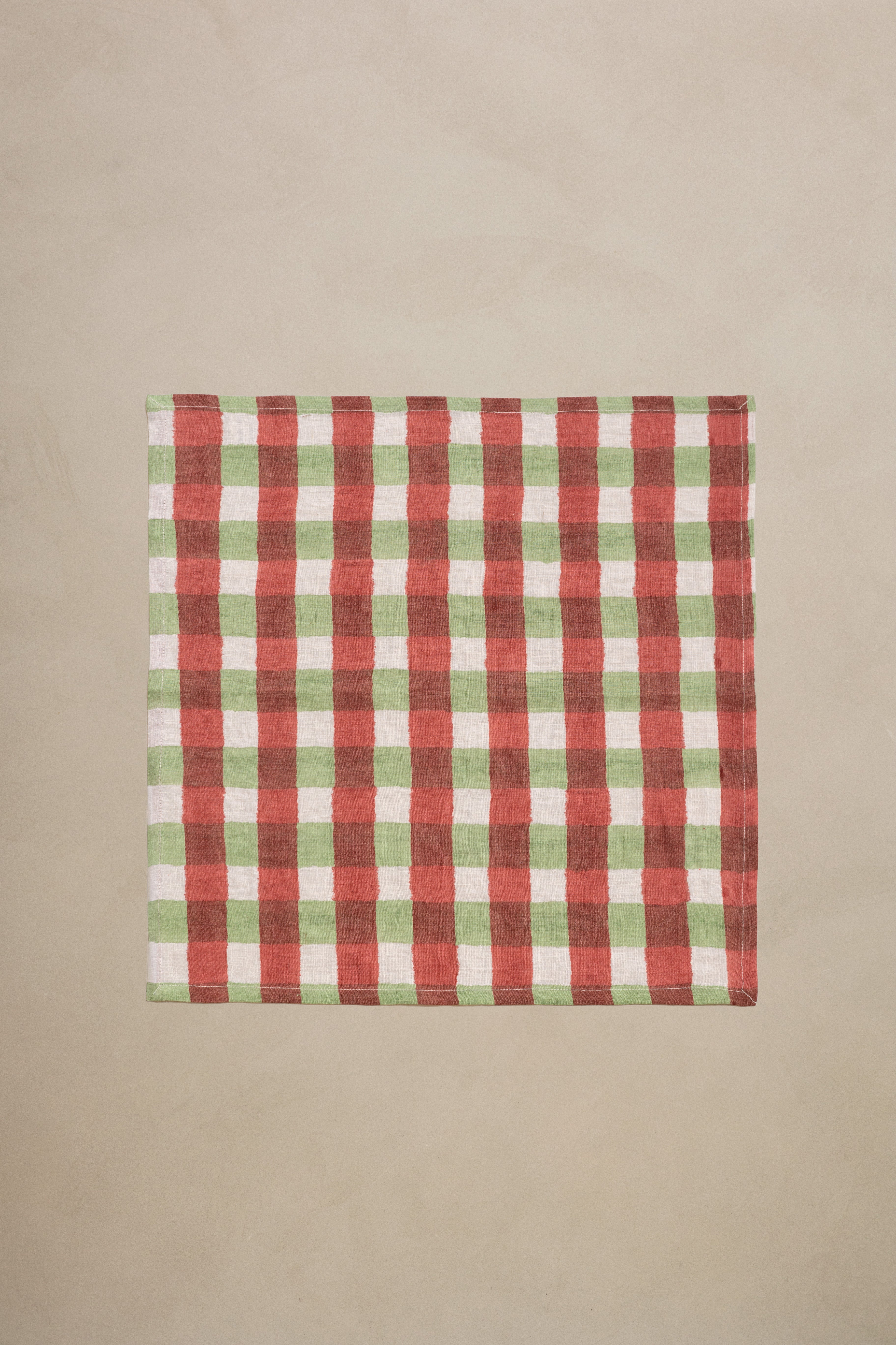 The Scarlet red green checks linen napkin adds timeless charm to every dining table and meal — from cozy family dinners to elegant hotel settings and curated events.Made from 100% pure prewashed linen and Indian traditional hand block print it’s soft, absorbent — bringing a premium, sustainable touch to every occasion.