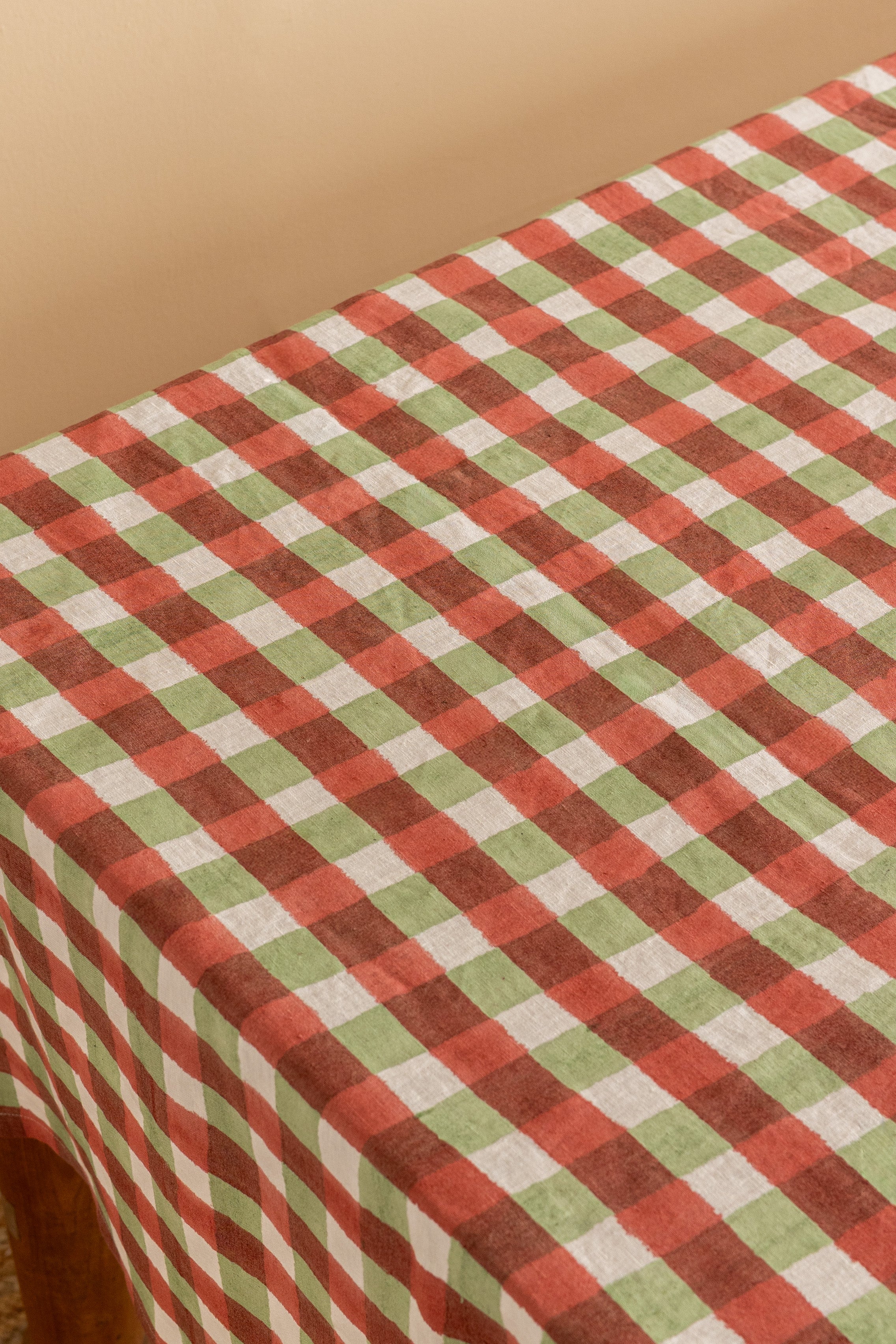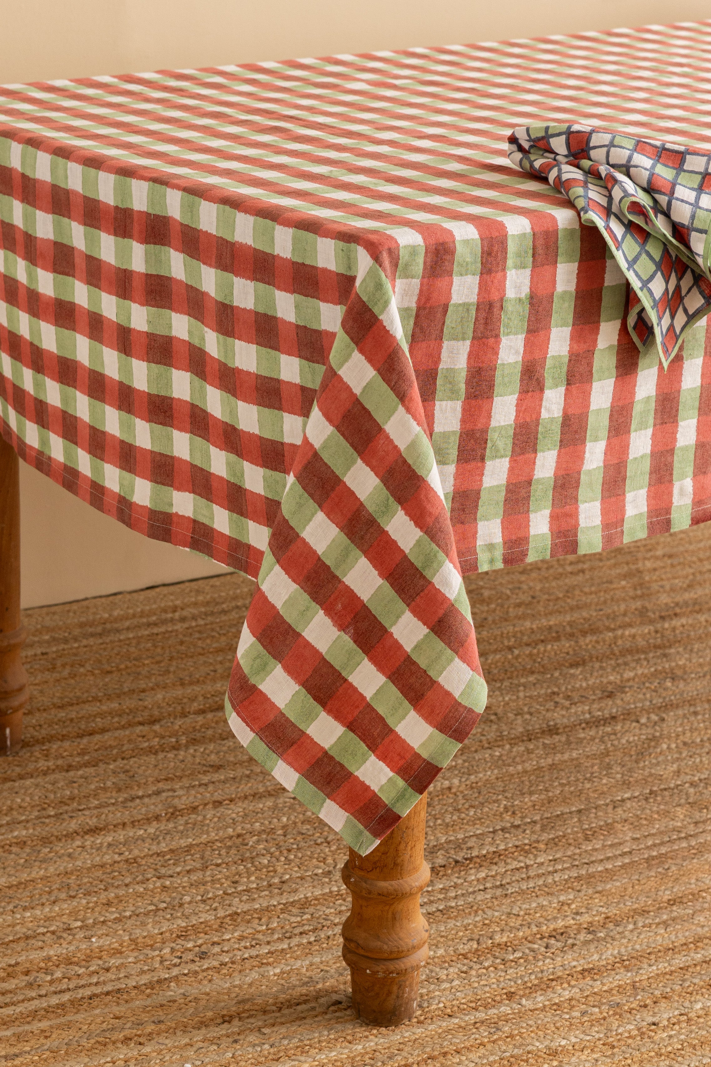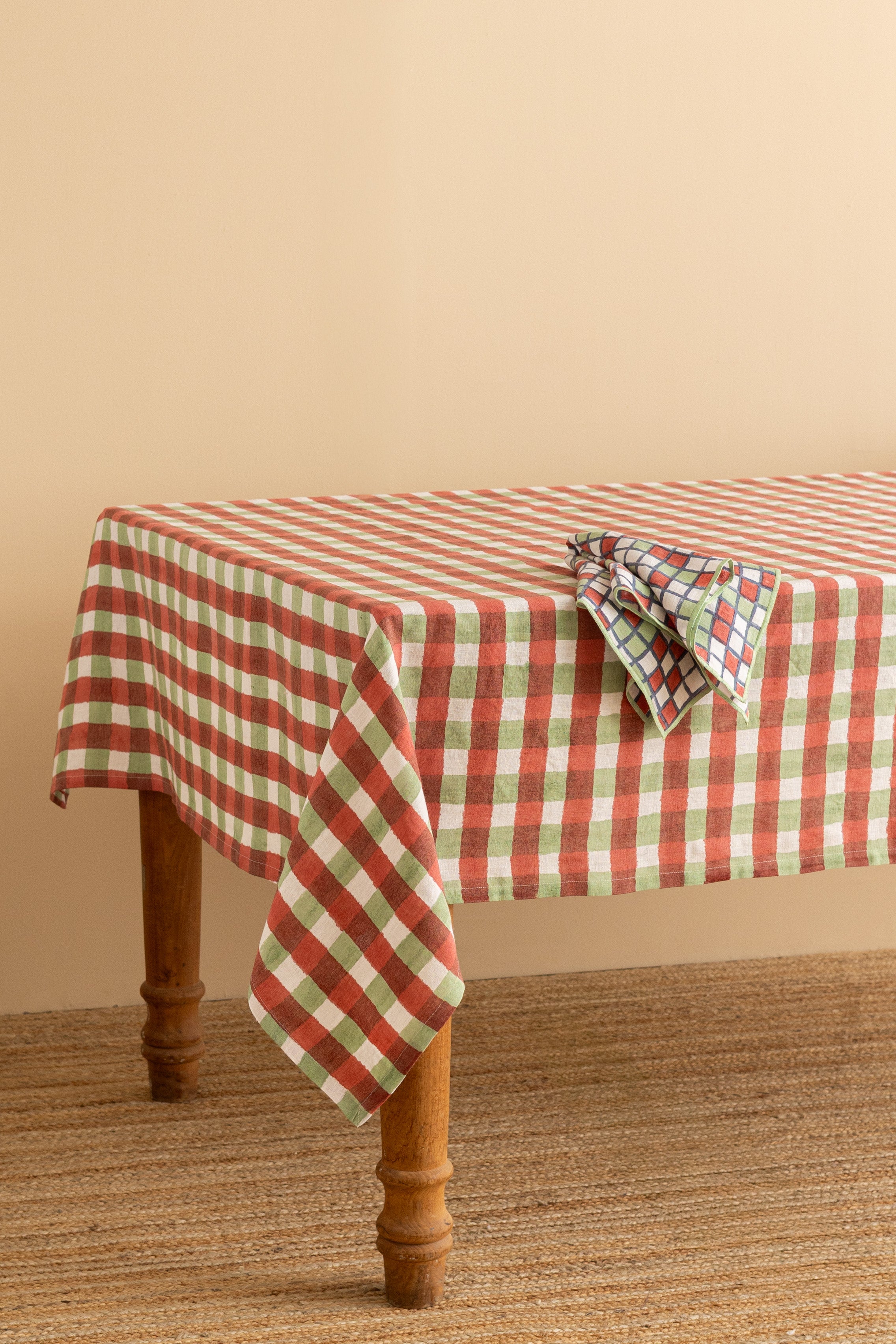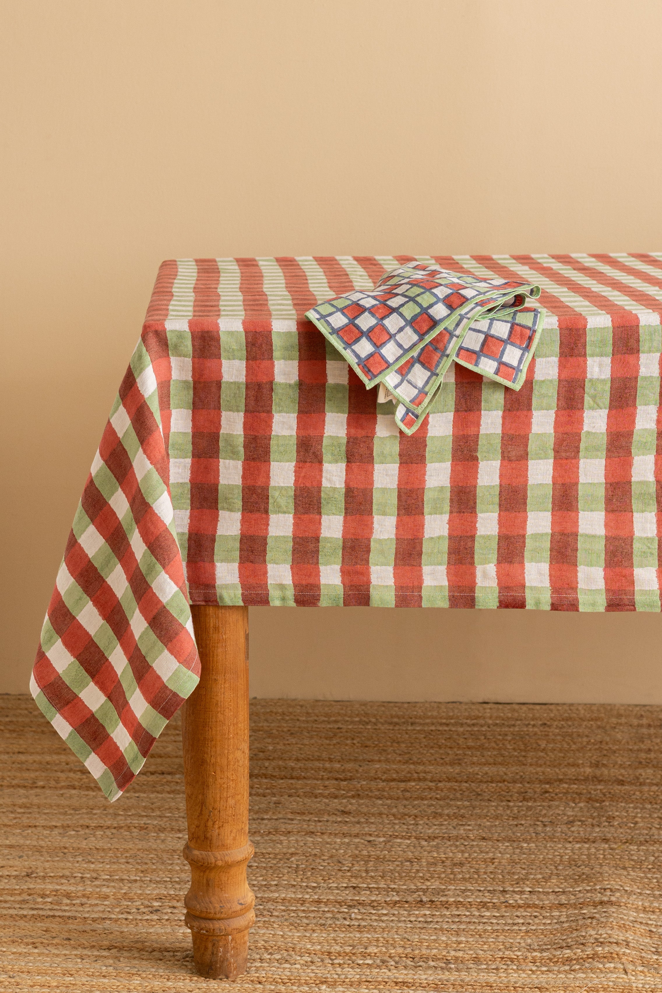 Soft and buttery LInen buffalo green and red checks tablecloth made with the finest European french flax linen. Featuring a timeless block-print check pattern, this Linen tablecloth brings effortless elegance, natural texture, and everyday durability to both casual and festive tables.They're machine washable and can be sun-dried. Also, they have anti-slip backing for secure placement.
