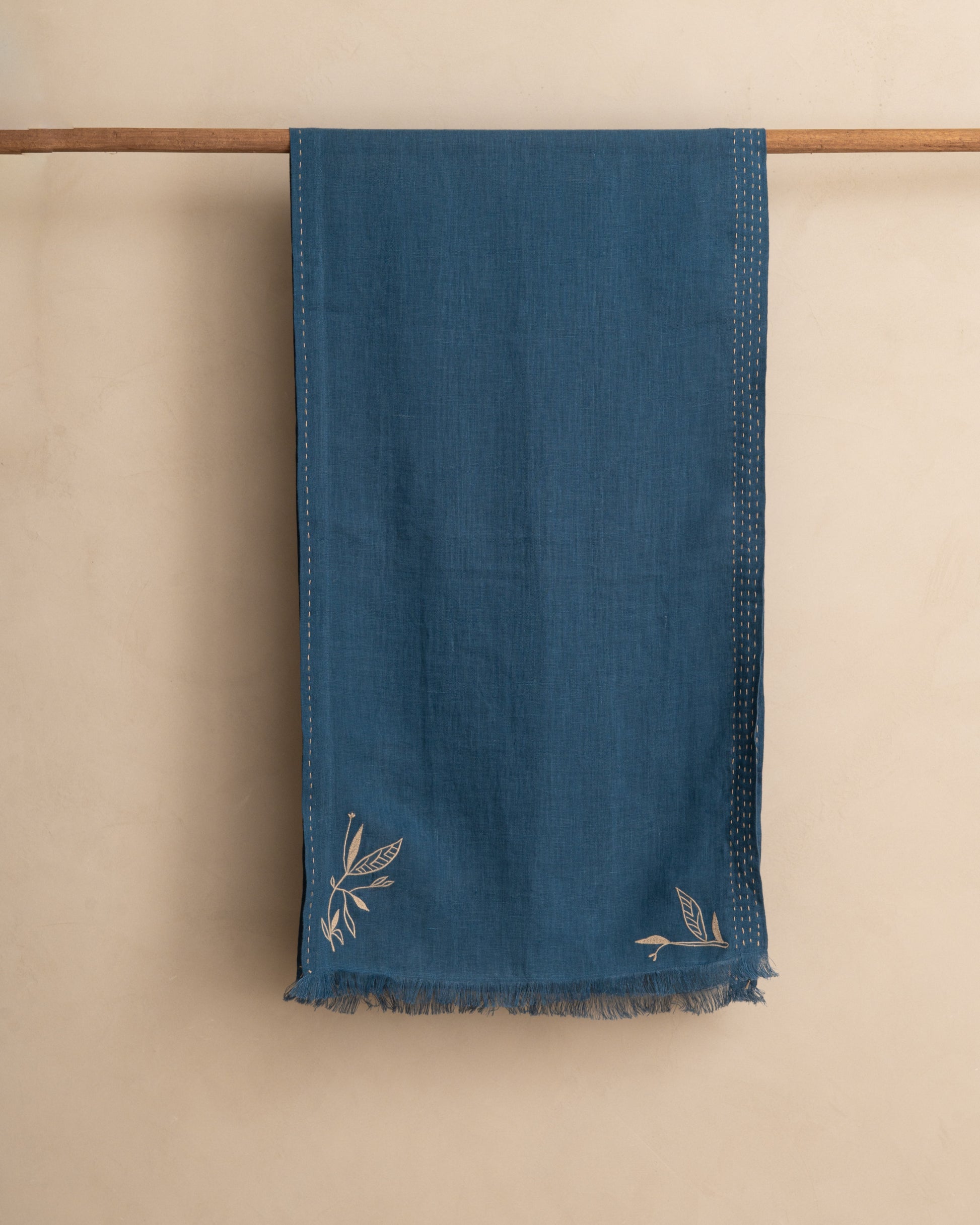 Whispers of linen, a gentle breath of harmony: the Linen Serenity Scarf. This ethereal piece, crafted from pure linen, adorns dreamy floral motifs of machine embroidery. A subtle whisper of color and style to your outfit is here for you.