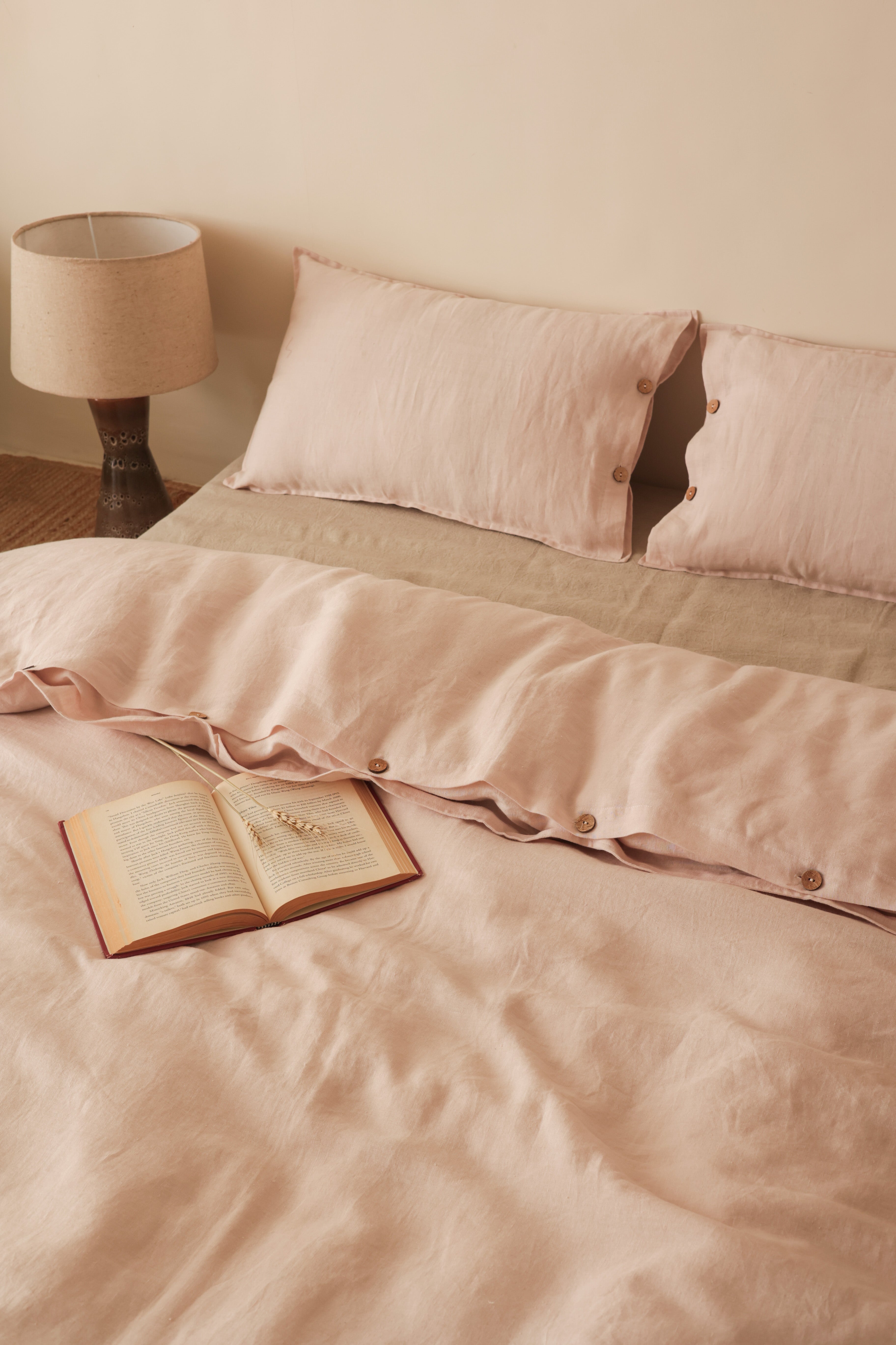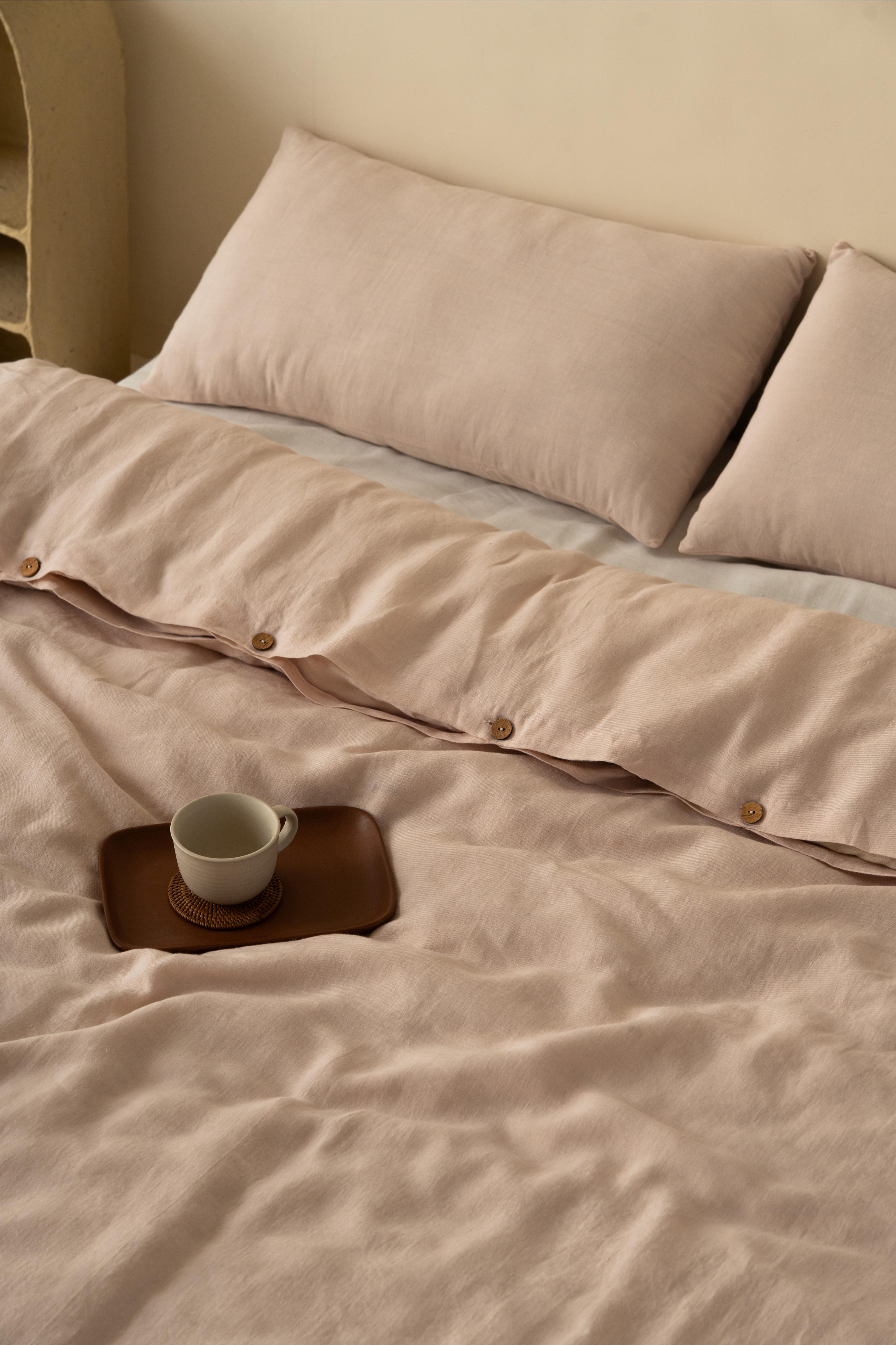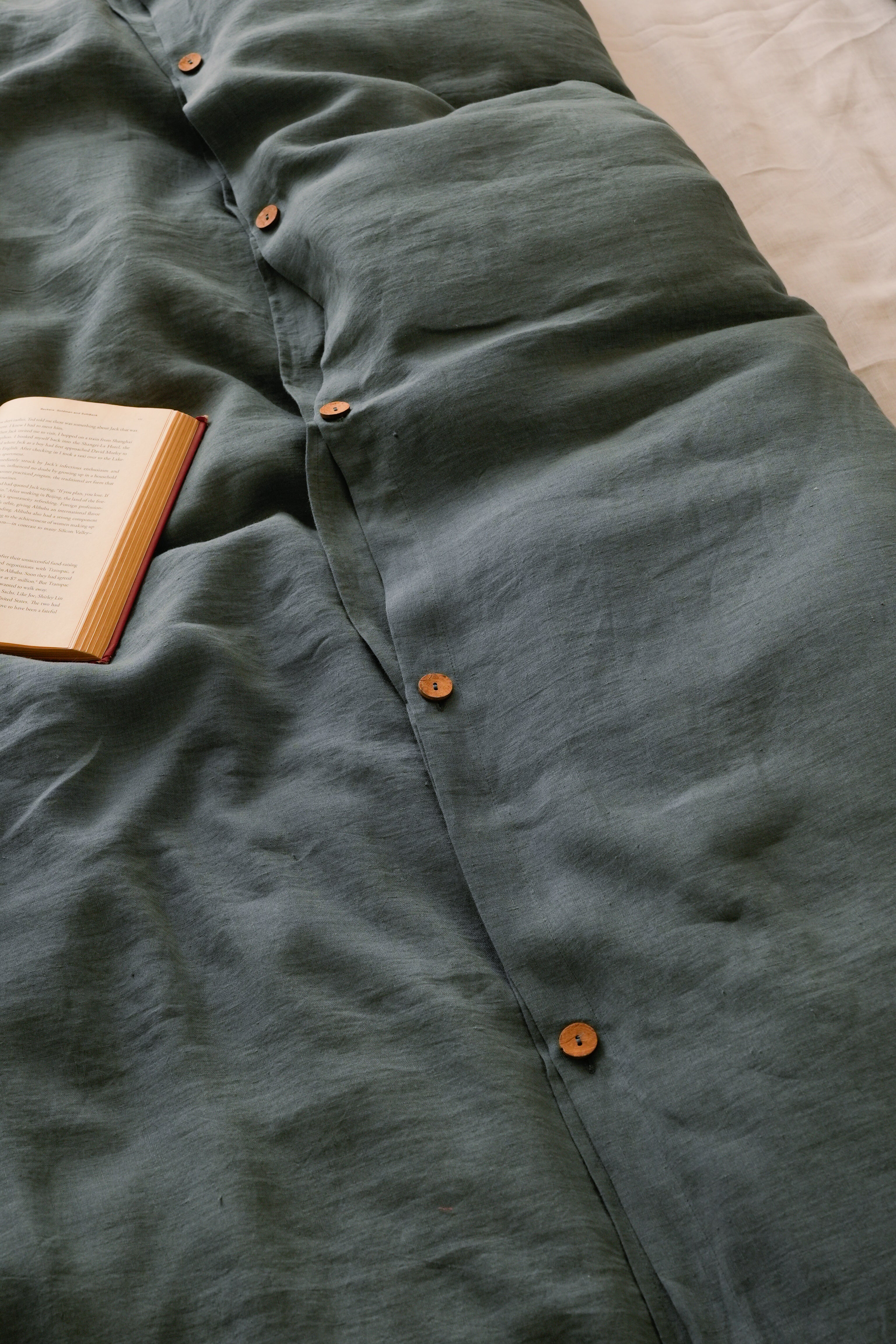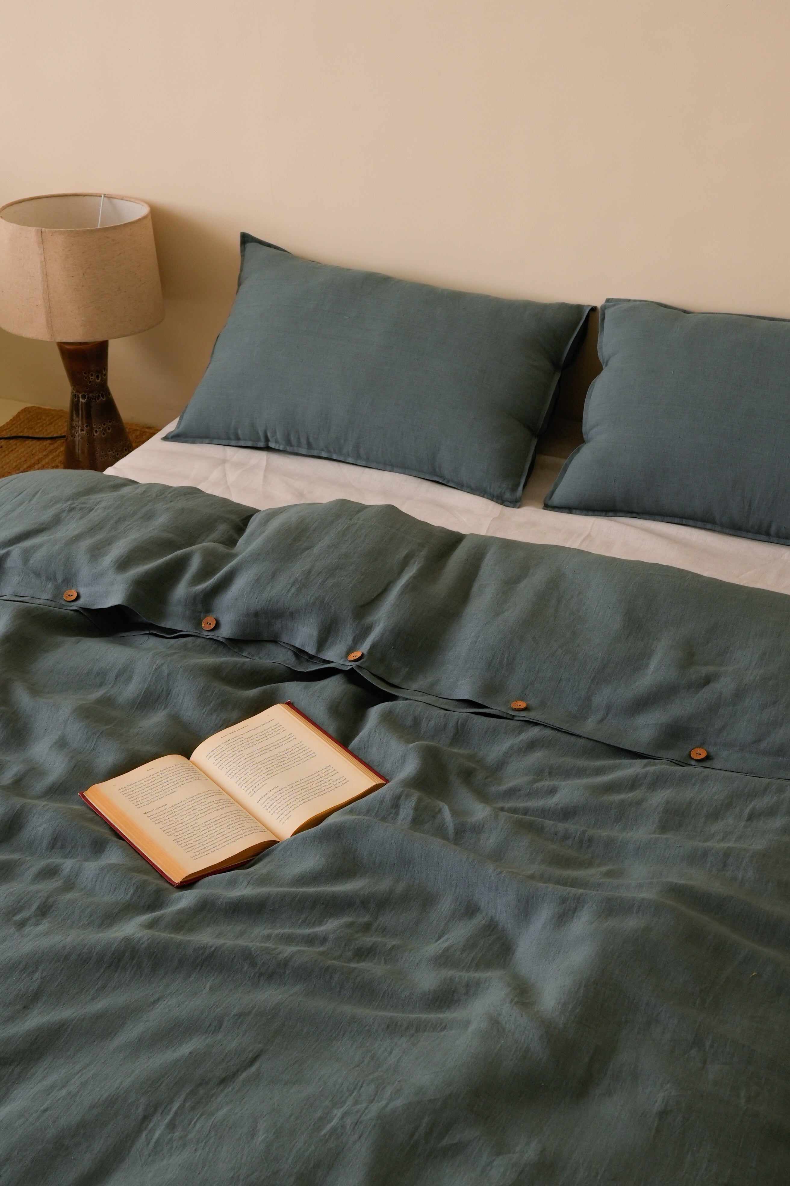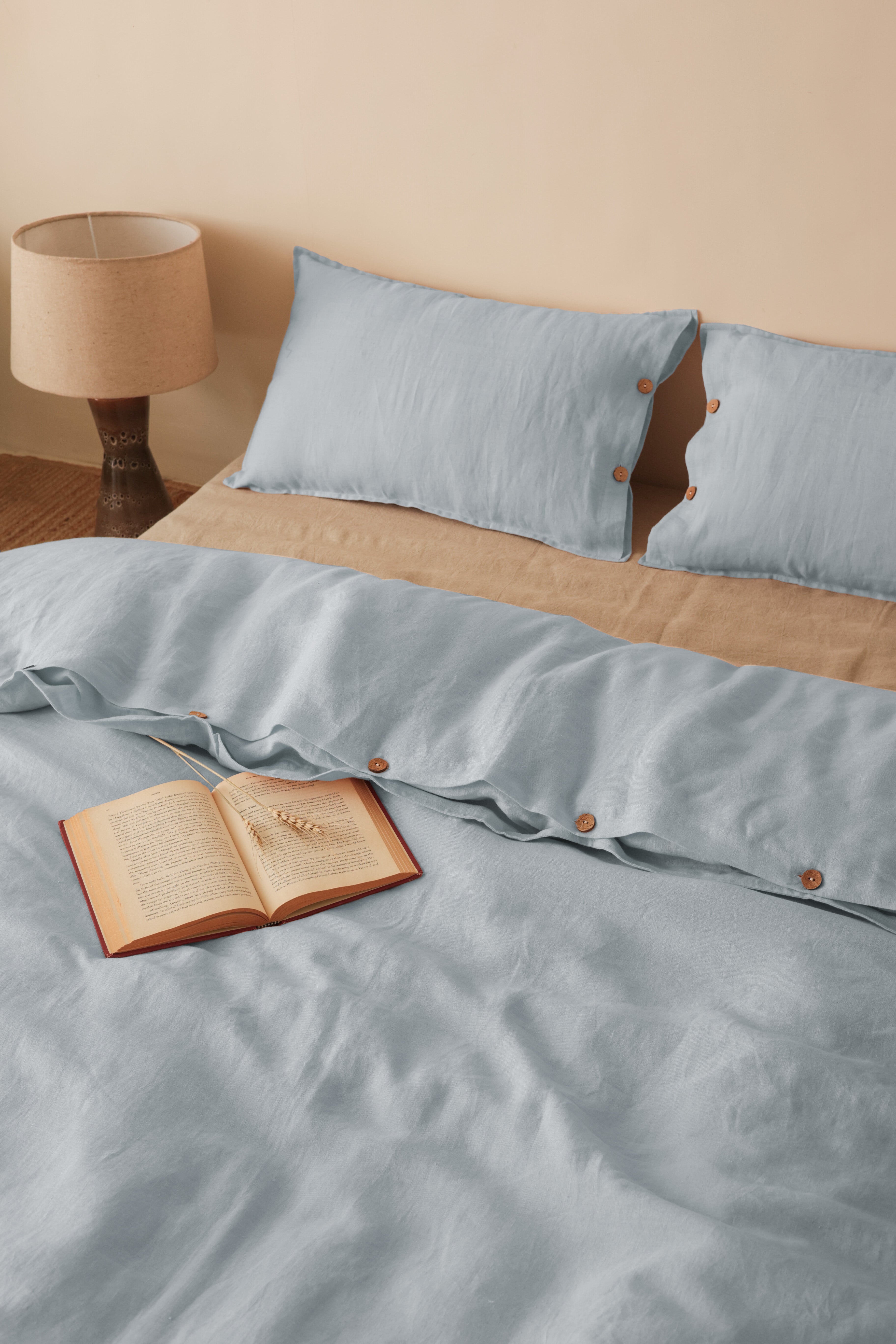 Linen Slumber Solid Duvet Cover Set Aqua Blue: Elevate the look of your bedroom with our Linen Slumber Solid Duvet Cover, available in many vivid colors, and two matching pillowcases. The sustainably curated coconut husk buttons securing the pillowcases will simply decorate each element of your bedroom. The best part of the day will be melting into these duvet sets after a long tiring day. So, explore the best ones now!