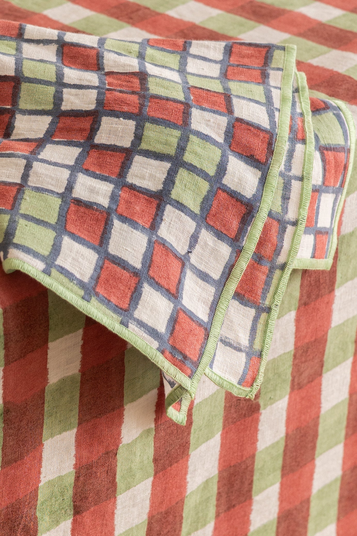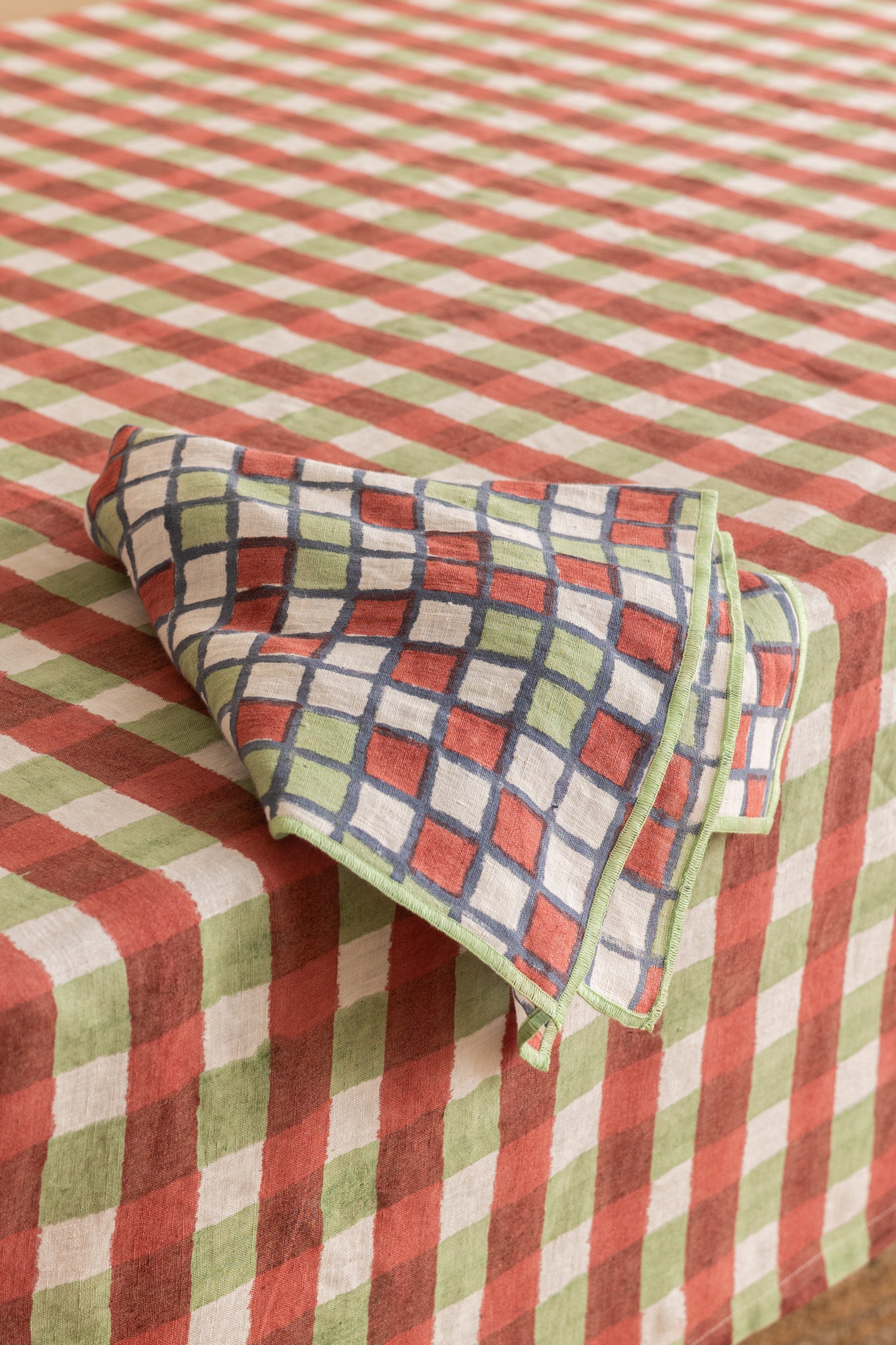 Add Premium Linen charm to every occasion with our Linen Sudoku Napkin Set, crafted from 100% linen and block-printed in green and red. Ideal for family dinners, brunches, festive feasts, outdoor picnics, and café-style dining, these napkins combine functionality with elegance. Naturally absorbent, skin-friendly, anti- bacterial and gets softens with every wash. Their vibrant and premium balanced design makes them perfect for gifting, weddings, or everyday home dining. Pair them with our Sudoku Tablecloth for a luxury, premium tablescape rooted in tradition and modern artistry.