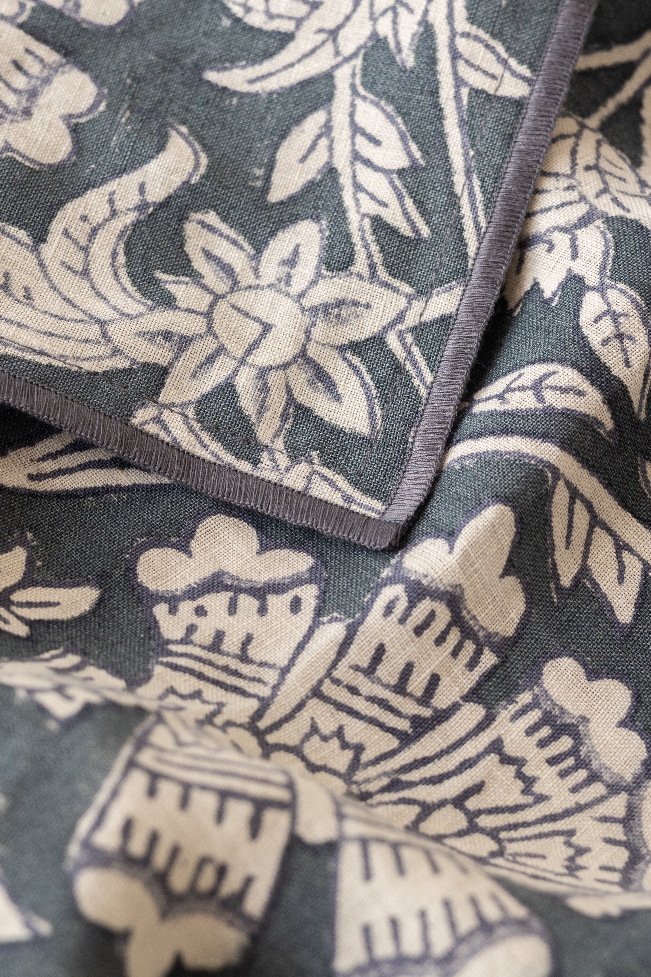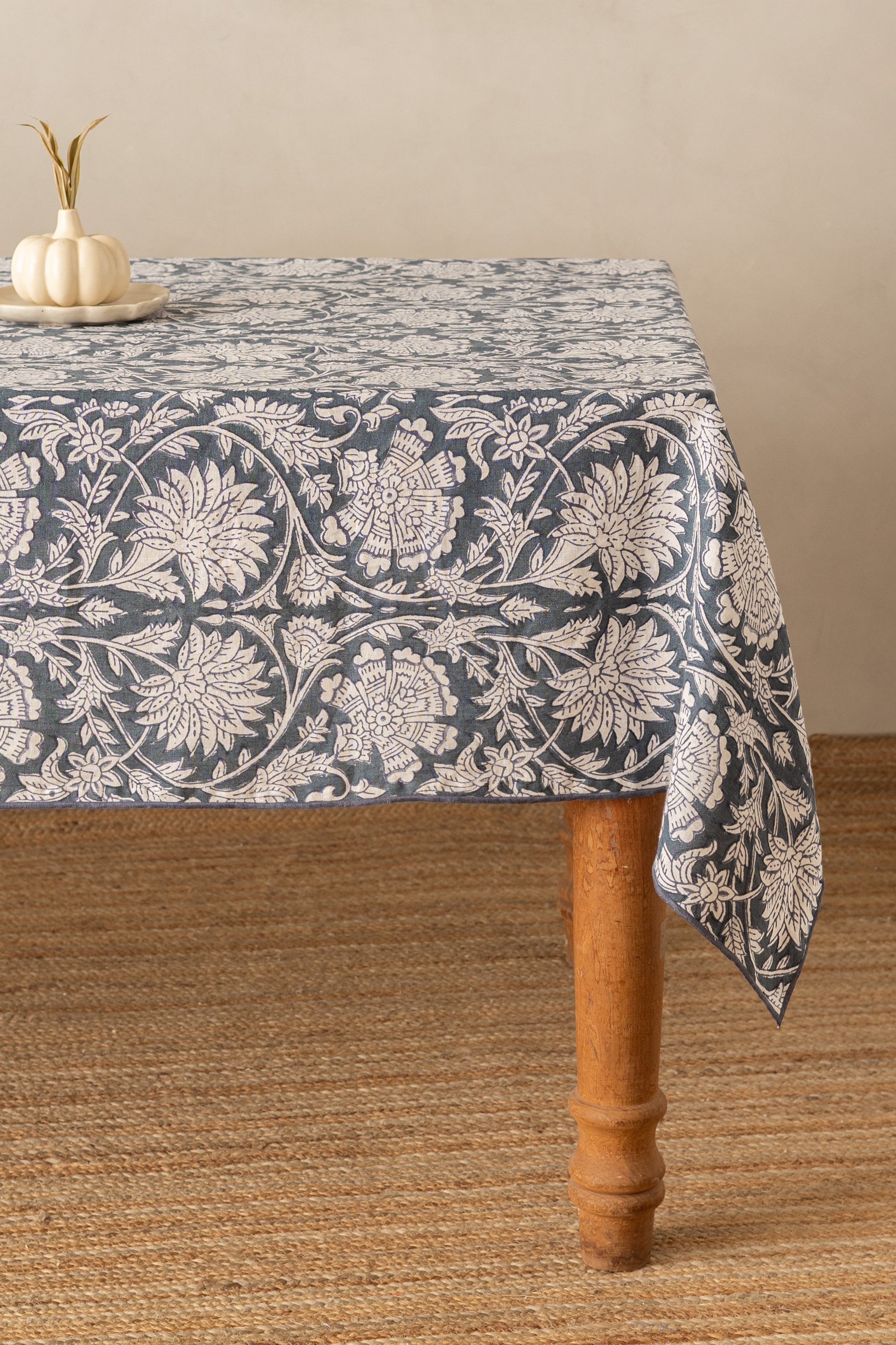 A beautiful Linen tablecloth for special lunches and dinners. This Linen Sylvan floral block print Tablecloth is made with 100% natural Europeon flex linen so that it drapes the table beautifully. Inspired by flowers, block print patterns and wall paintings in India - Pair it with brass cutlery or ceramic dinnerware for a coordinated, modern and luxury look. Protect your dining table from spills and scratches while adding style.