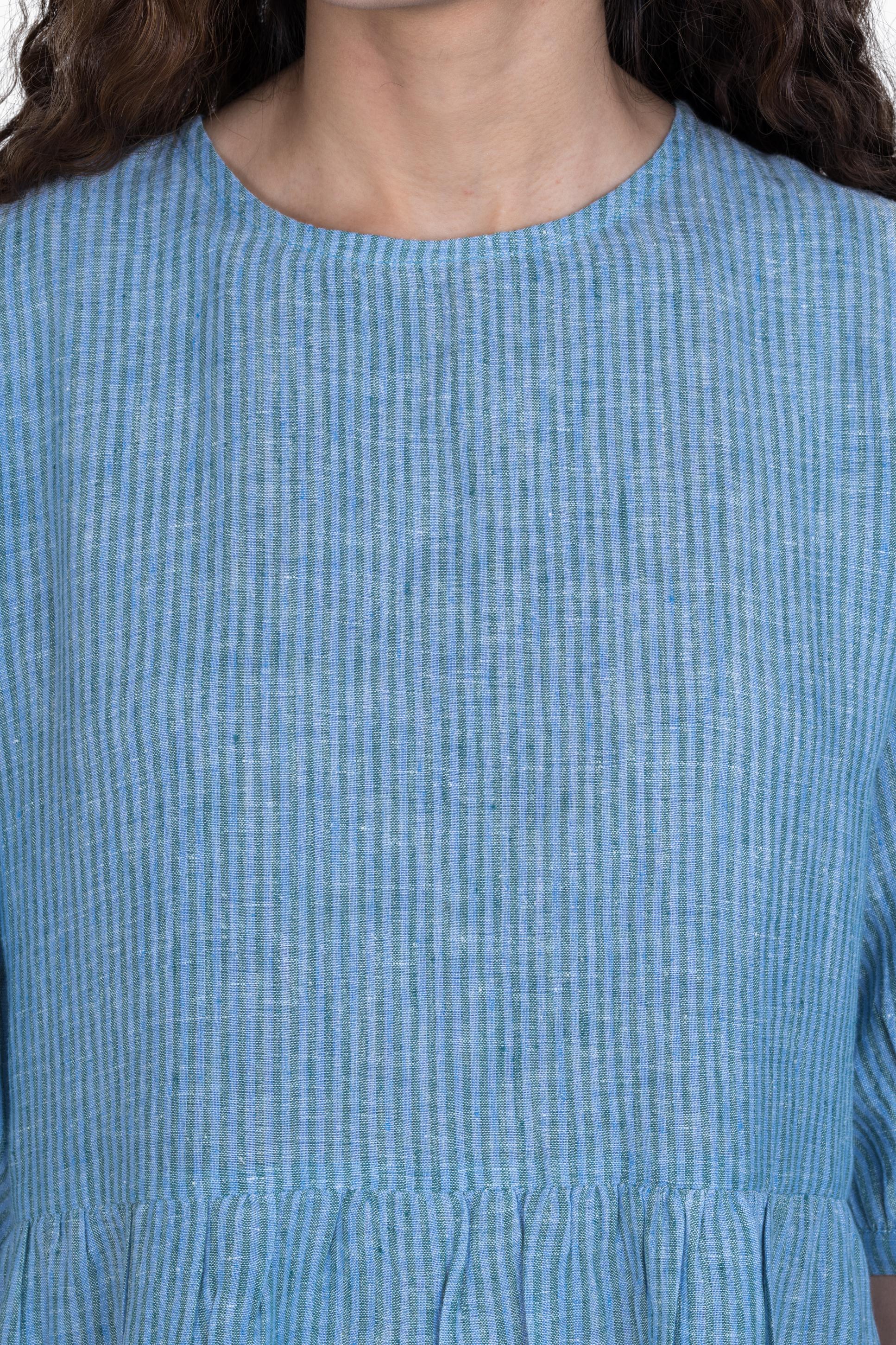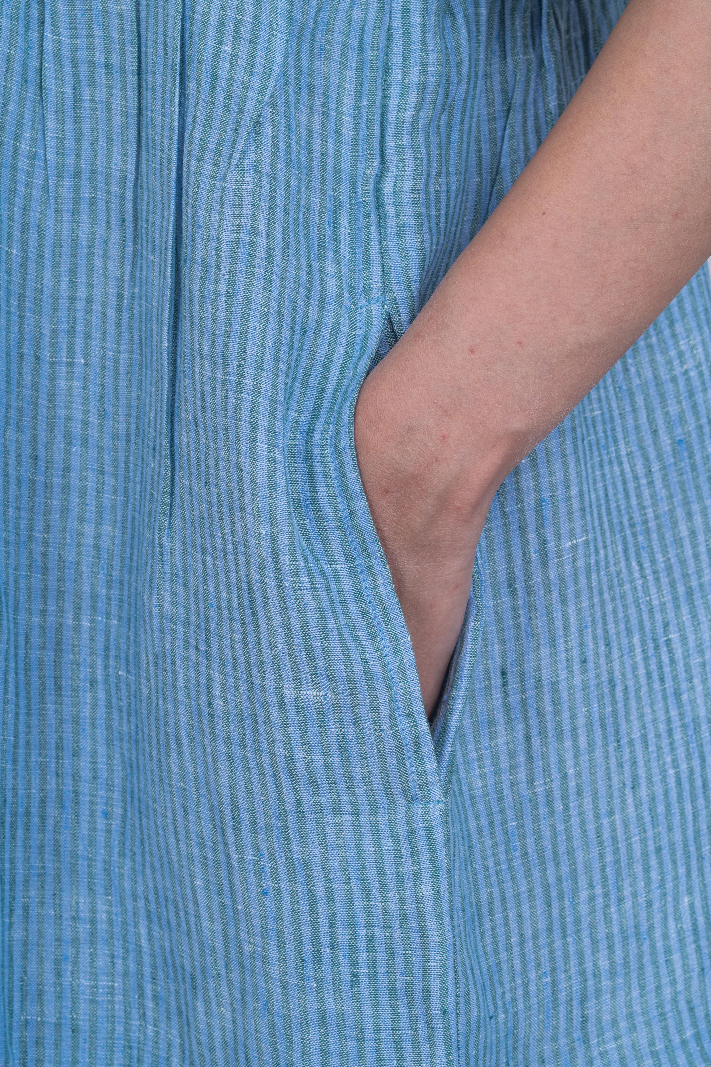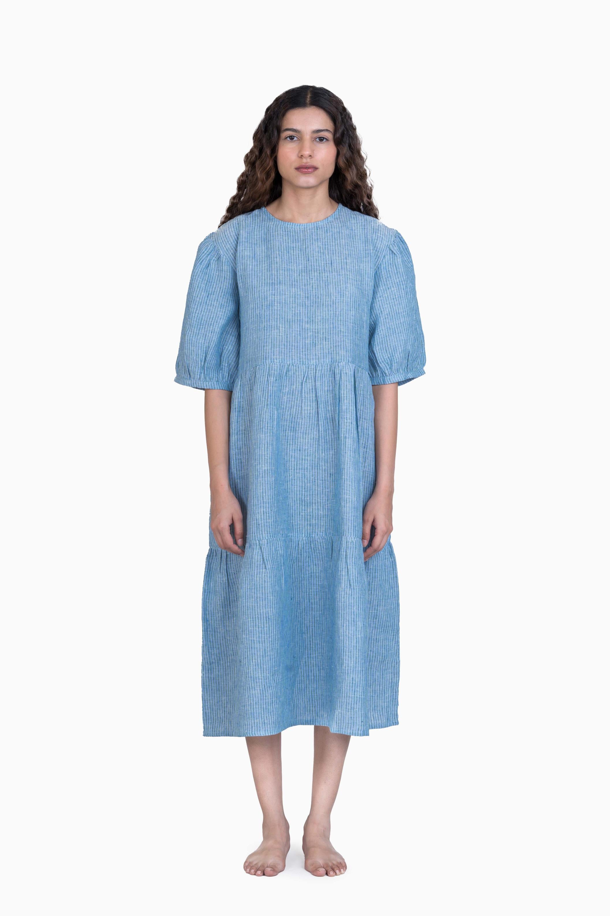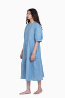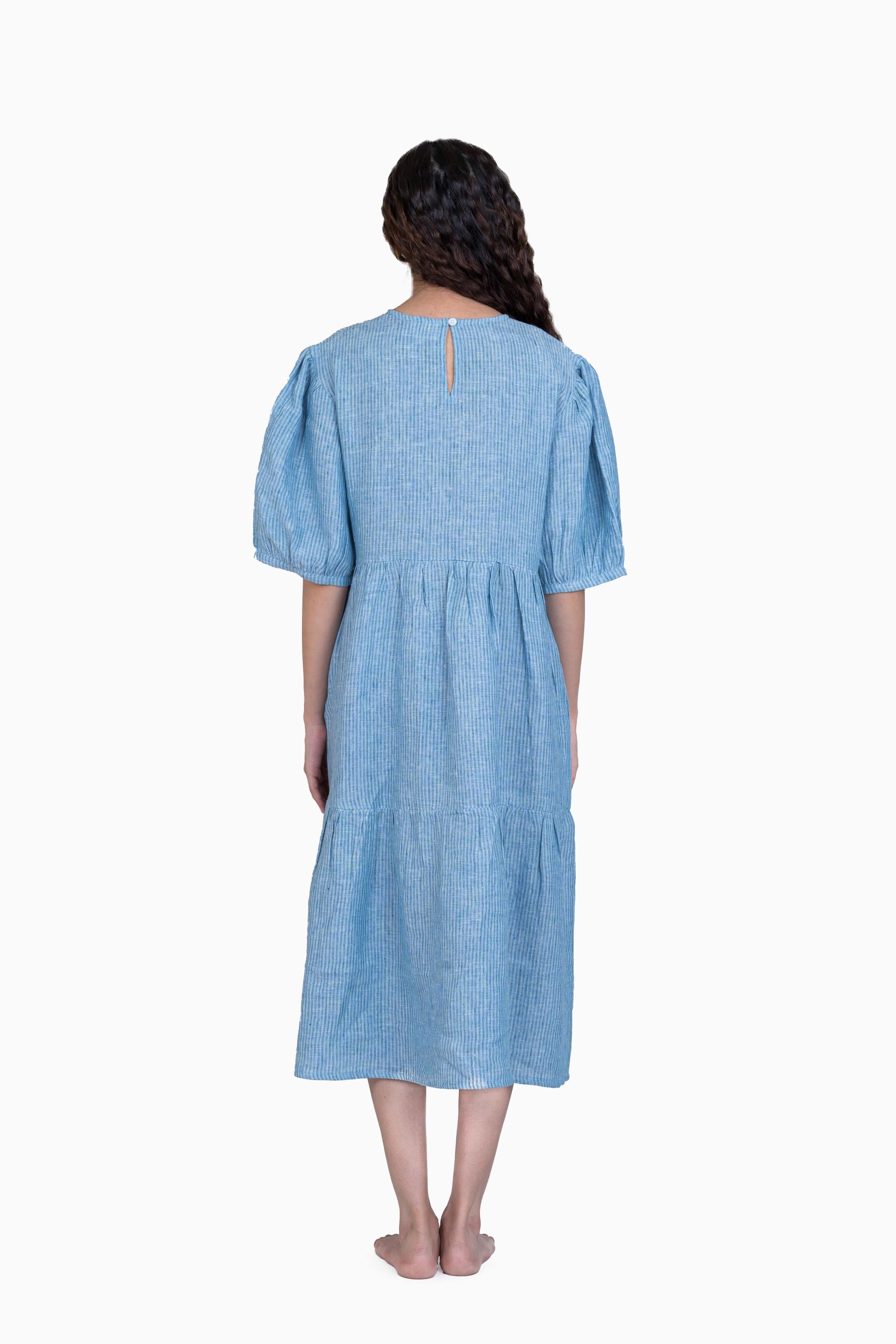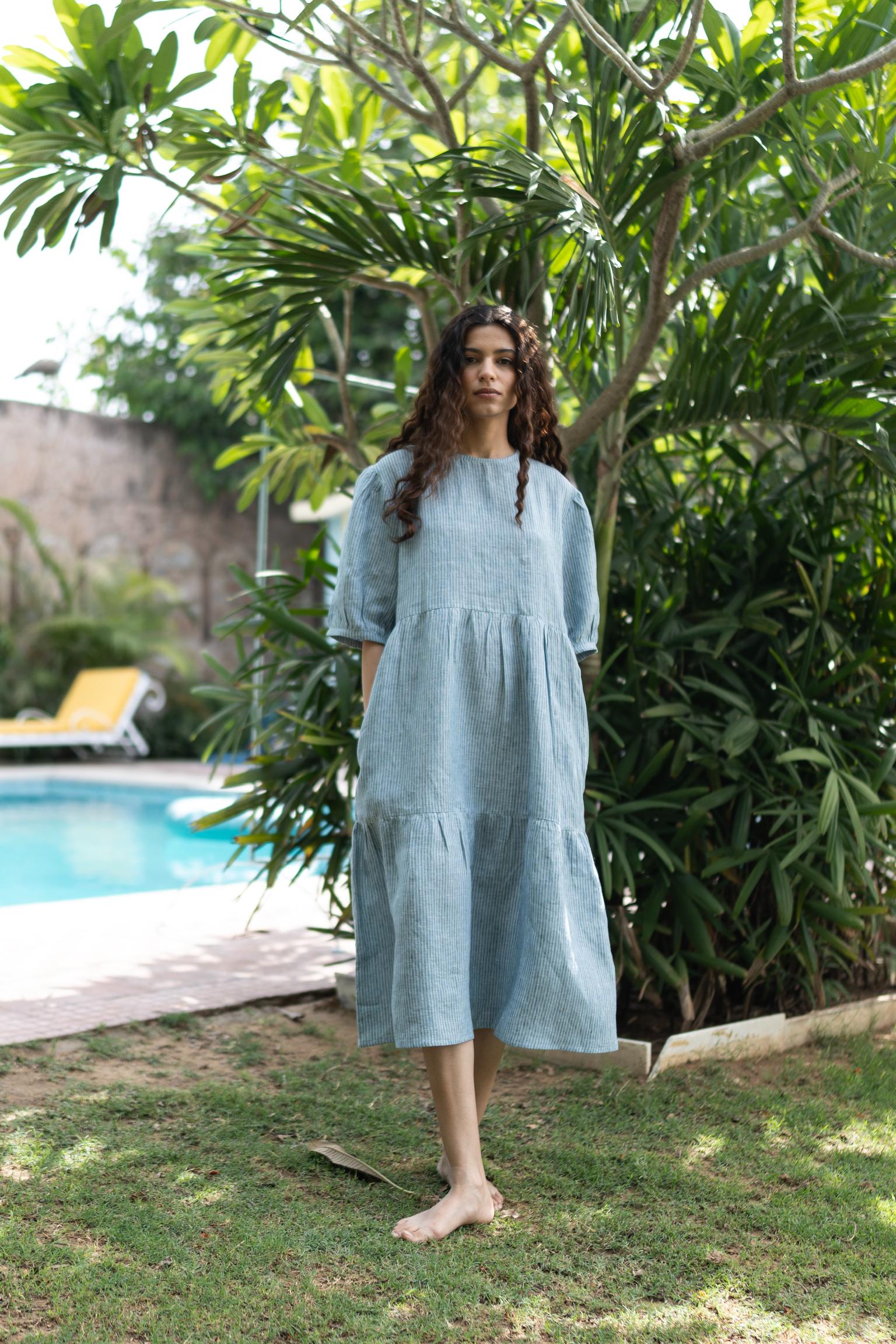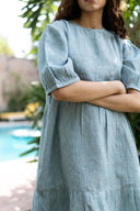 Presenting our Linen Talia Dress for you with the best summer colors. A yarn-dyed collection with linen's utmost softness and breezy touch of summery hues. This puff sleeved dress with round neckline and gentle pleating all around the dress add more volume to it. With single closure slit at the back adorned by shell button.