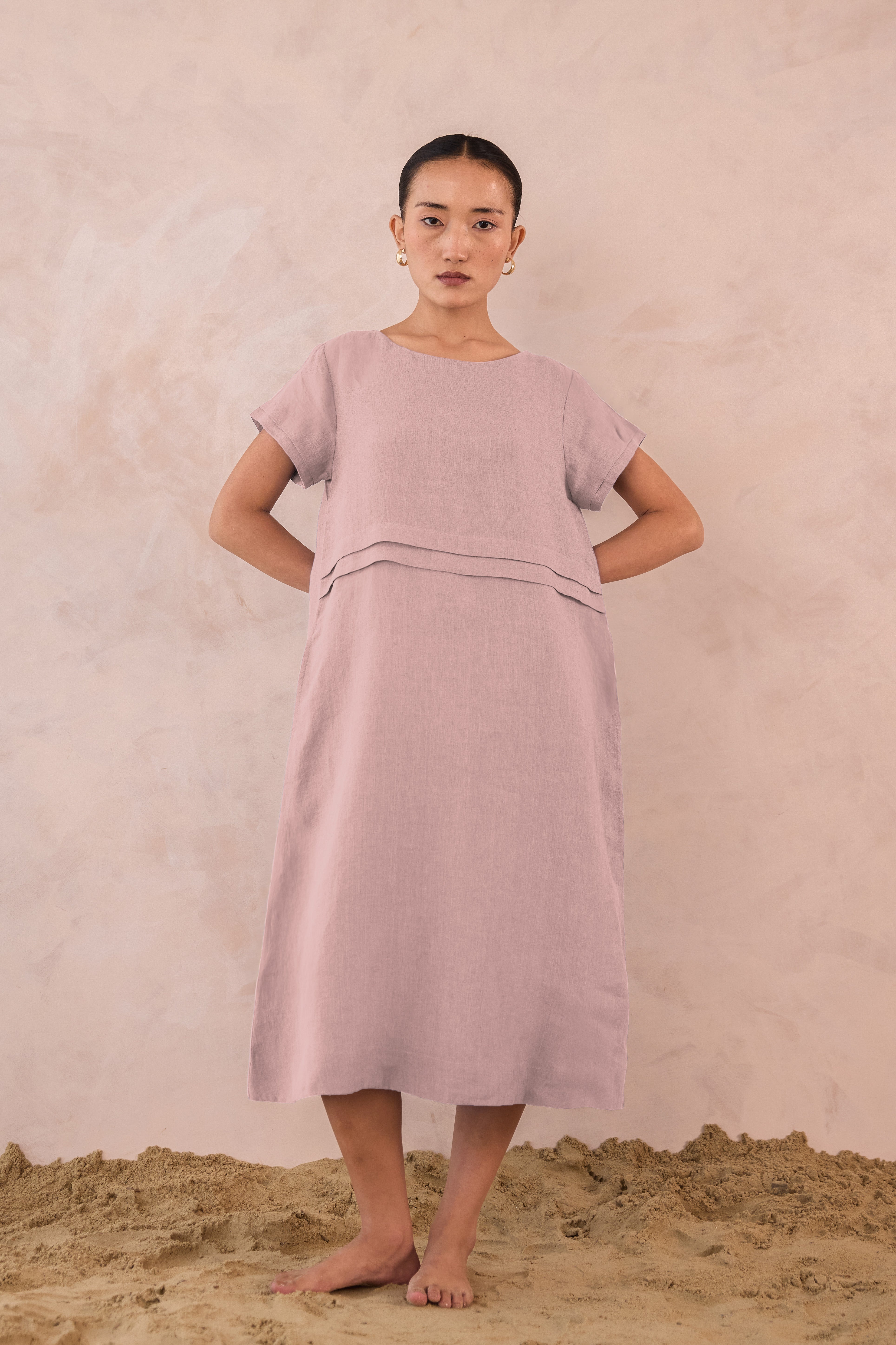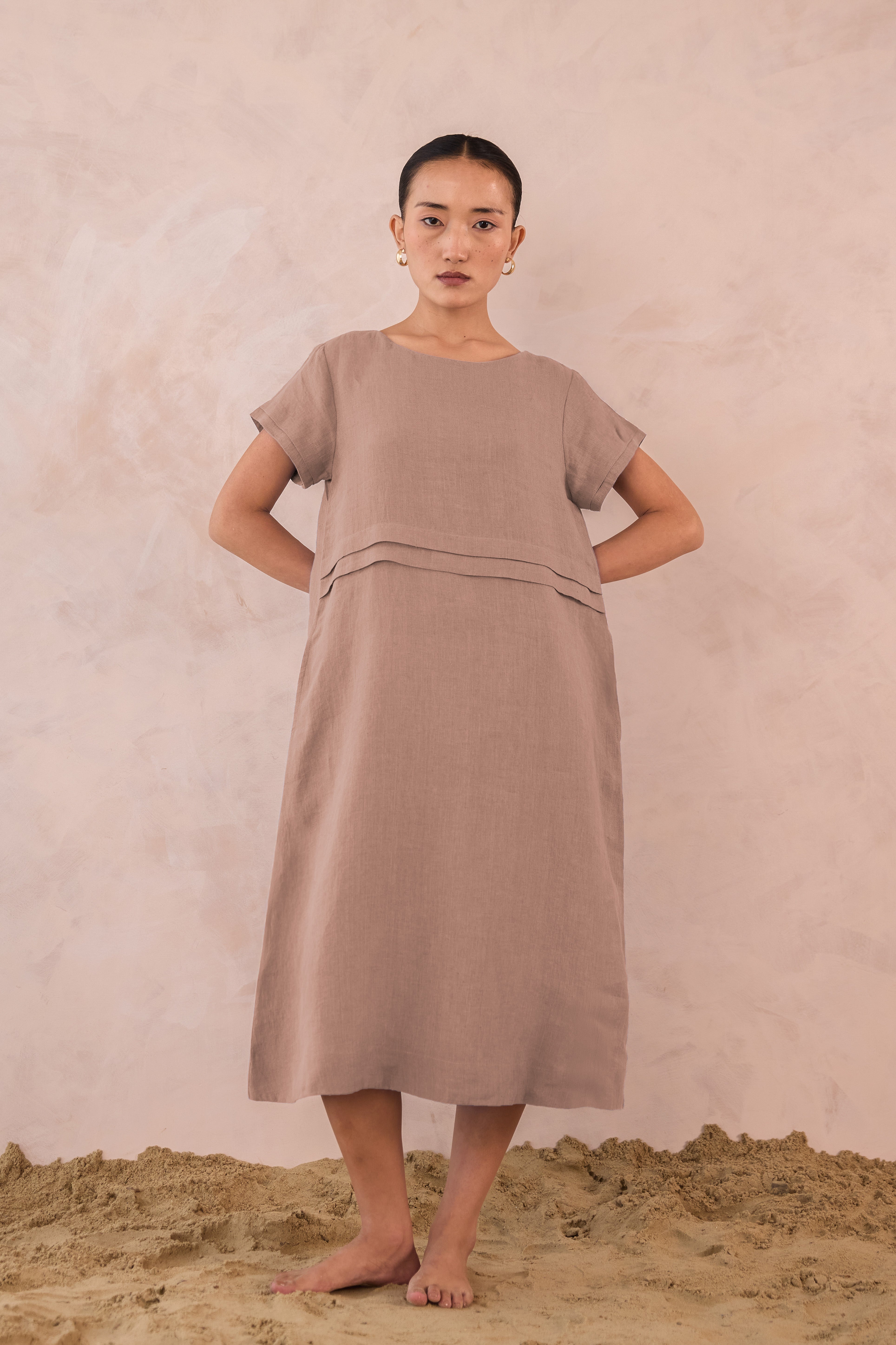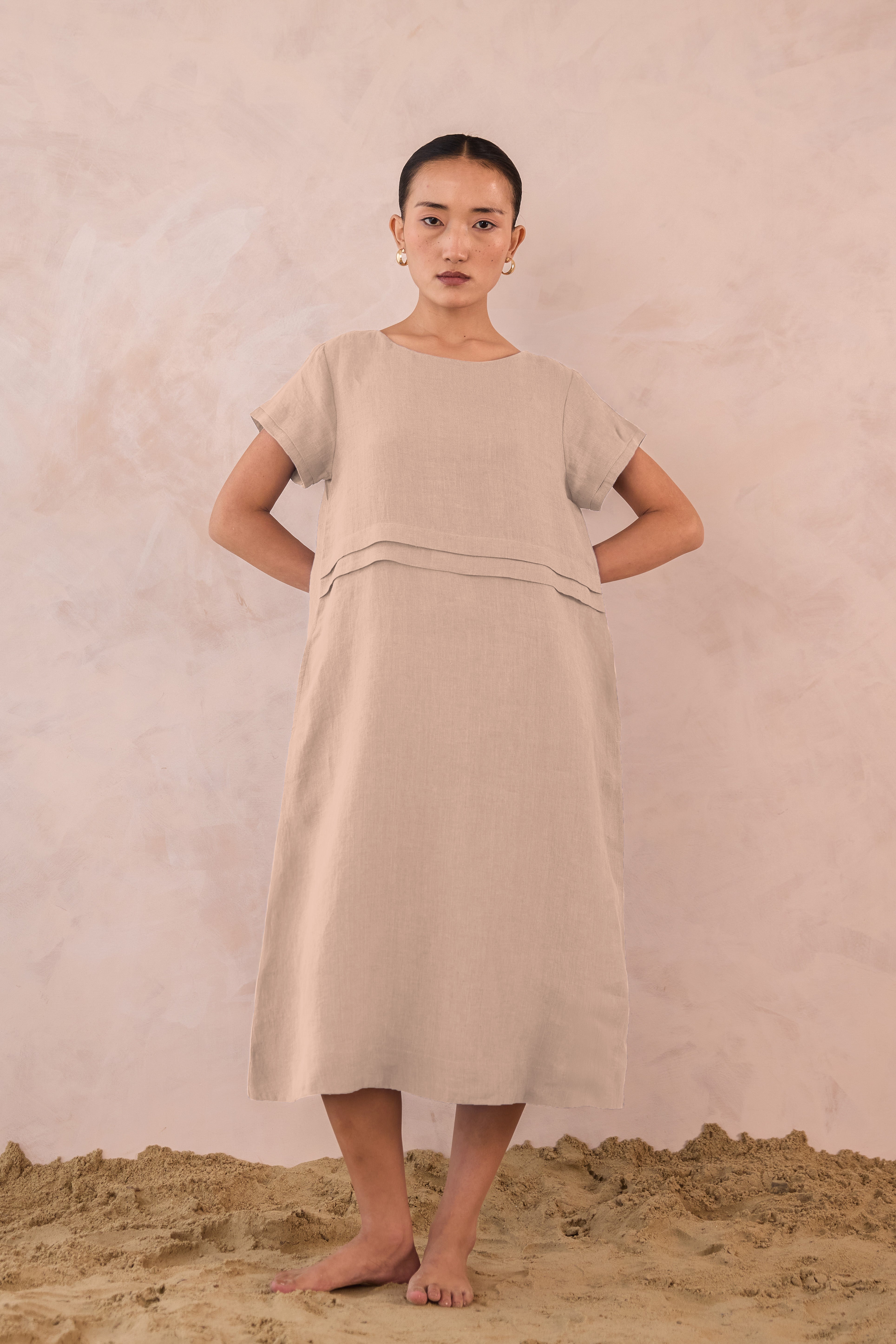 Our Linen Tavira Dress embodies relaxed elegance with understated detail. Crafted with 100% premium linen for a breezy, breathable feel, this dress features a simple A-line or gently flared silhouette. This midi dress offers a unique double pleat on the front, perfect for a sunlit outing and effortless sophistication.