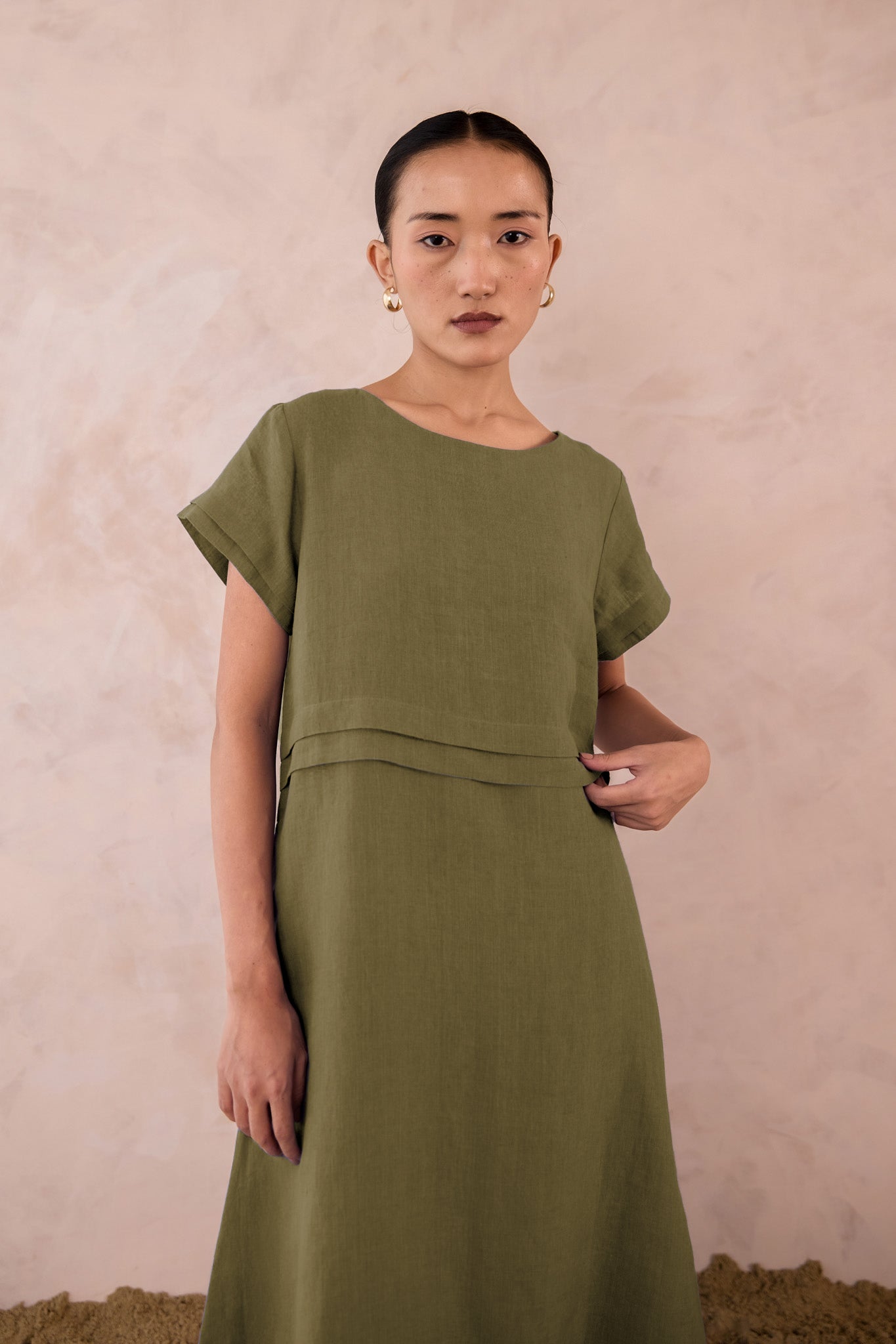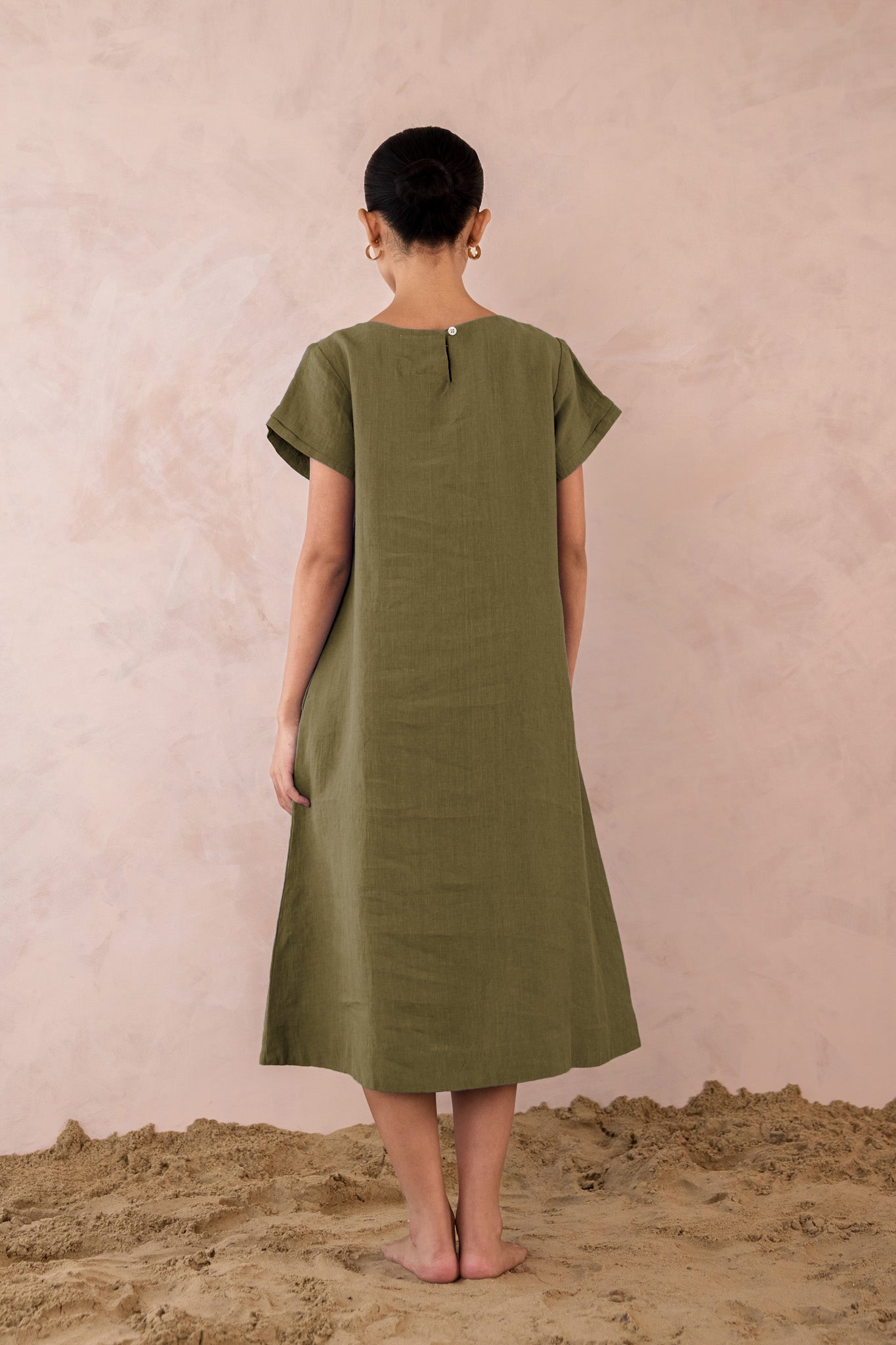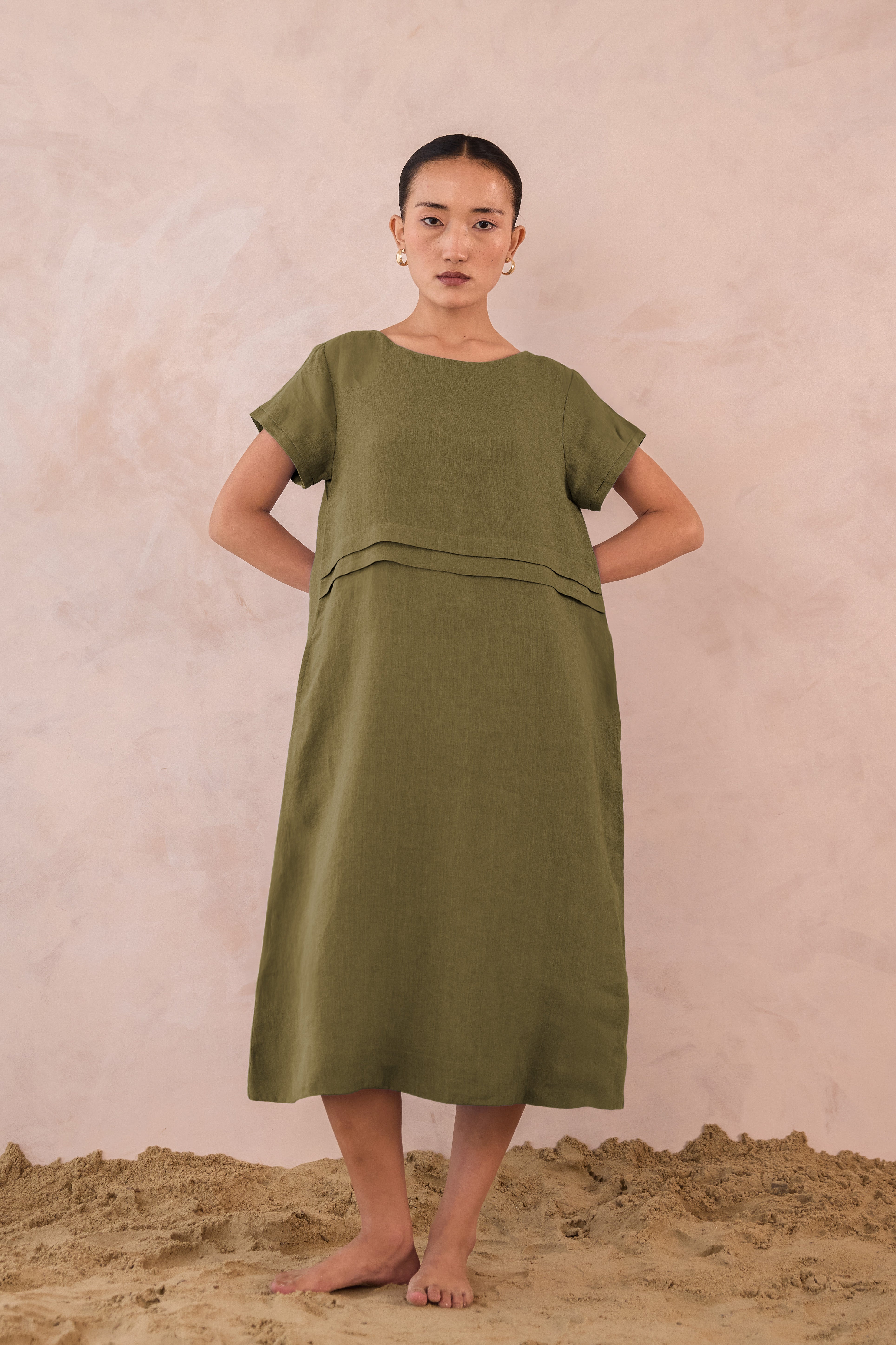 Our Linen Tavira Dress embodies relaxed elegance with understated detail. Crafted with 100% premium linen for a breezy, breathable feel, this dress features a simple A-line or gently flared silhouette. This midi dress offers a unique double pleat on the front, perfect for a sunlit outing and effortless sophistication.