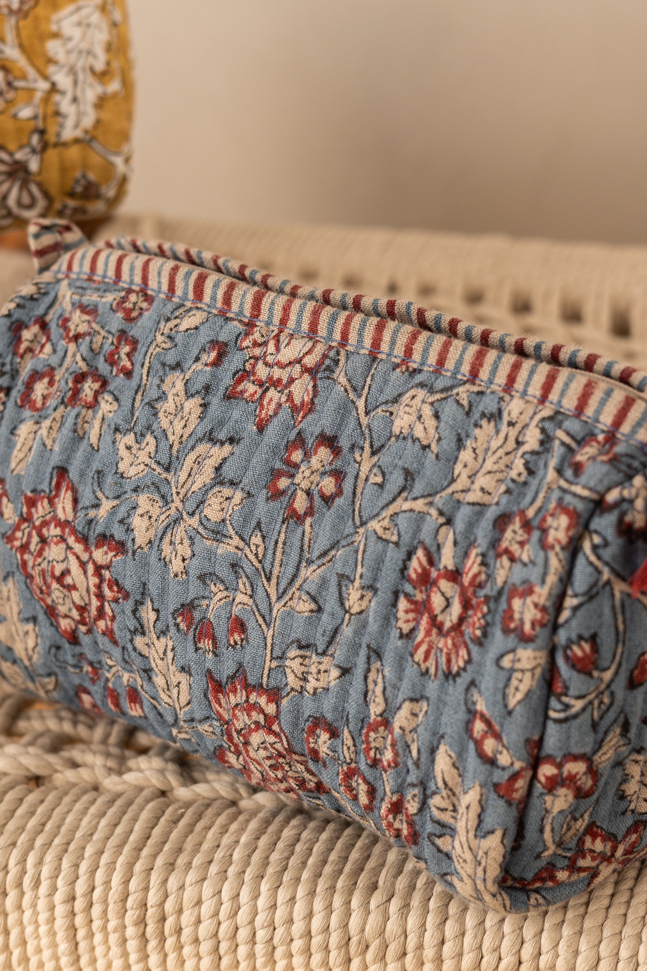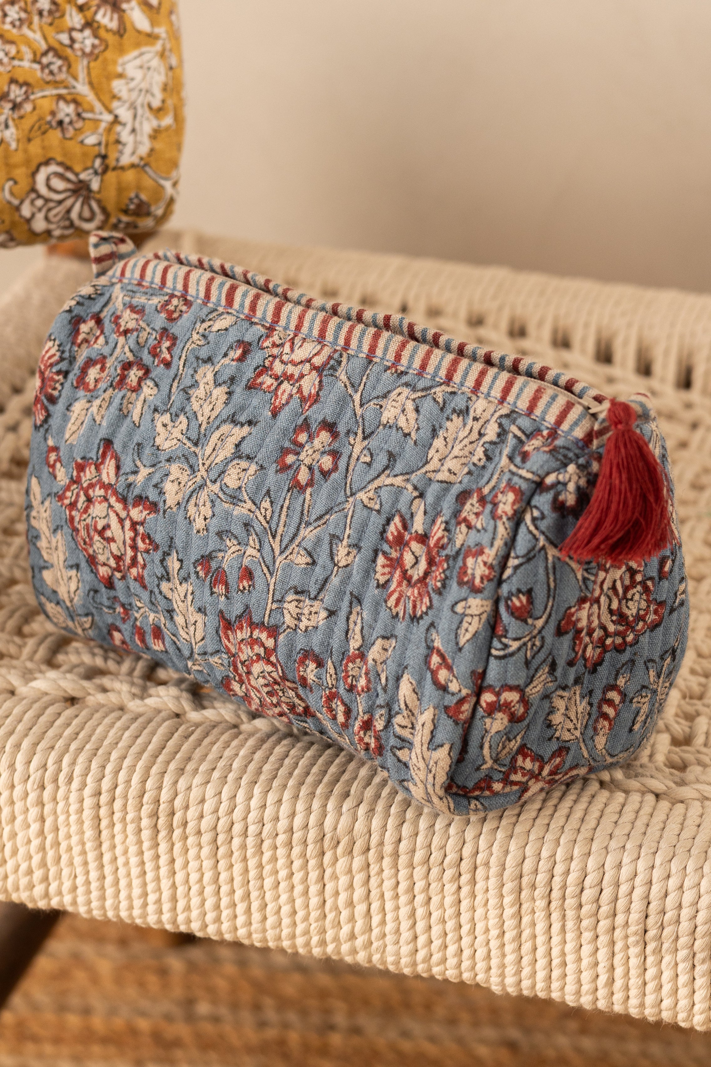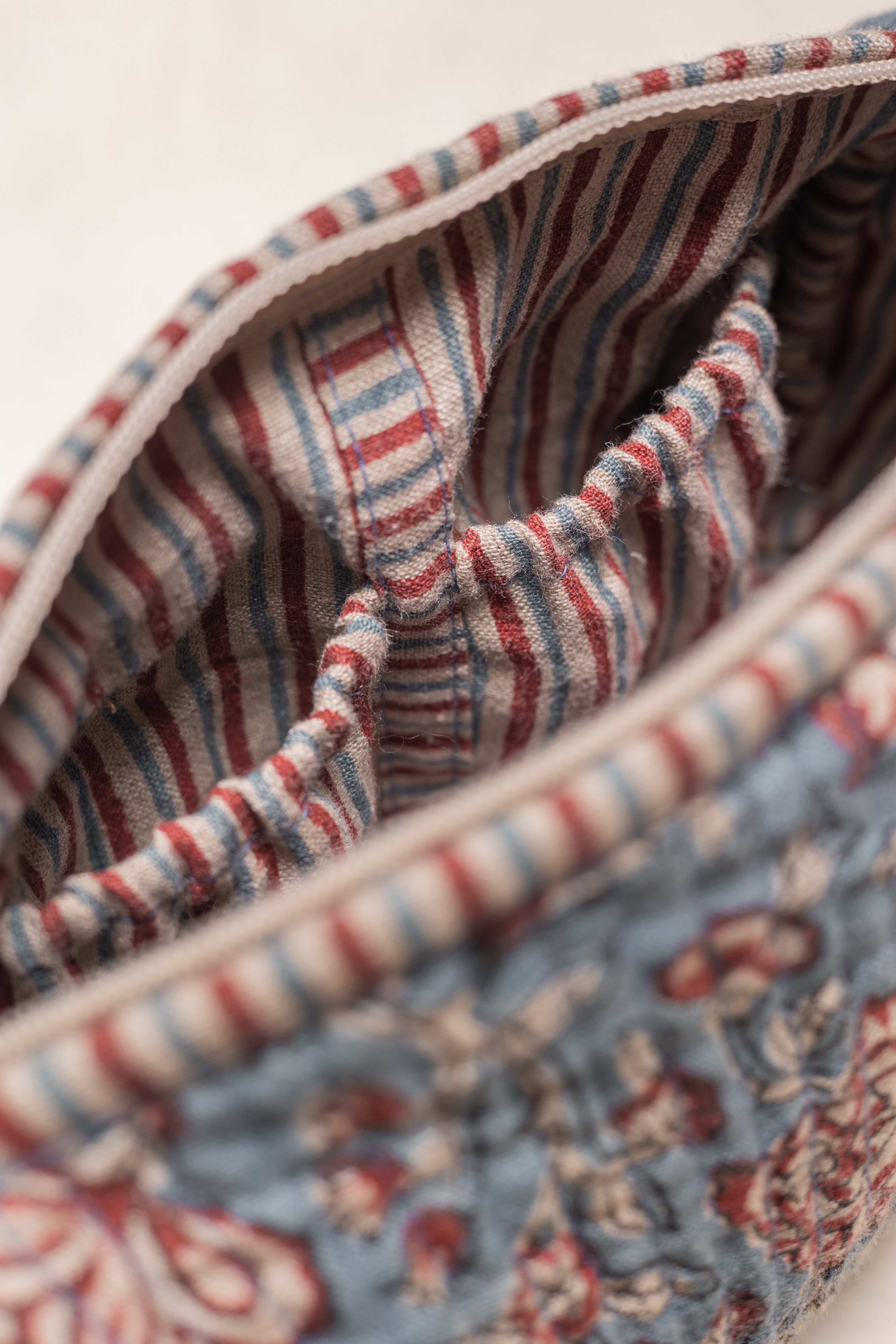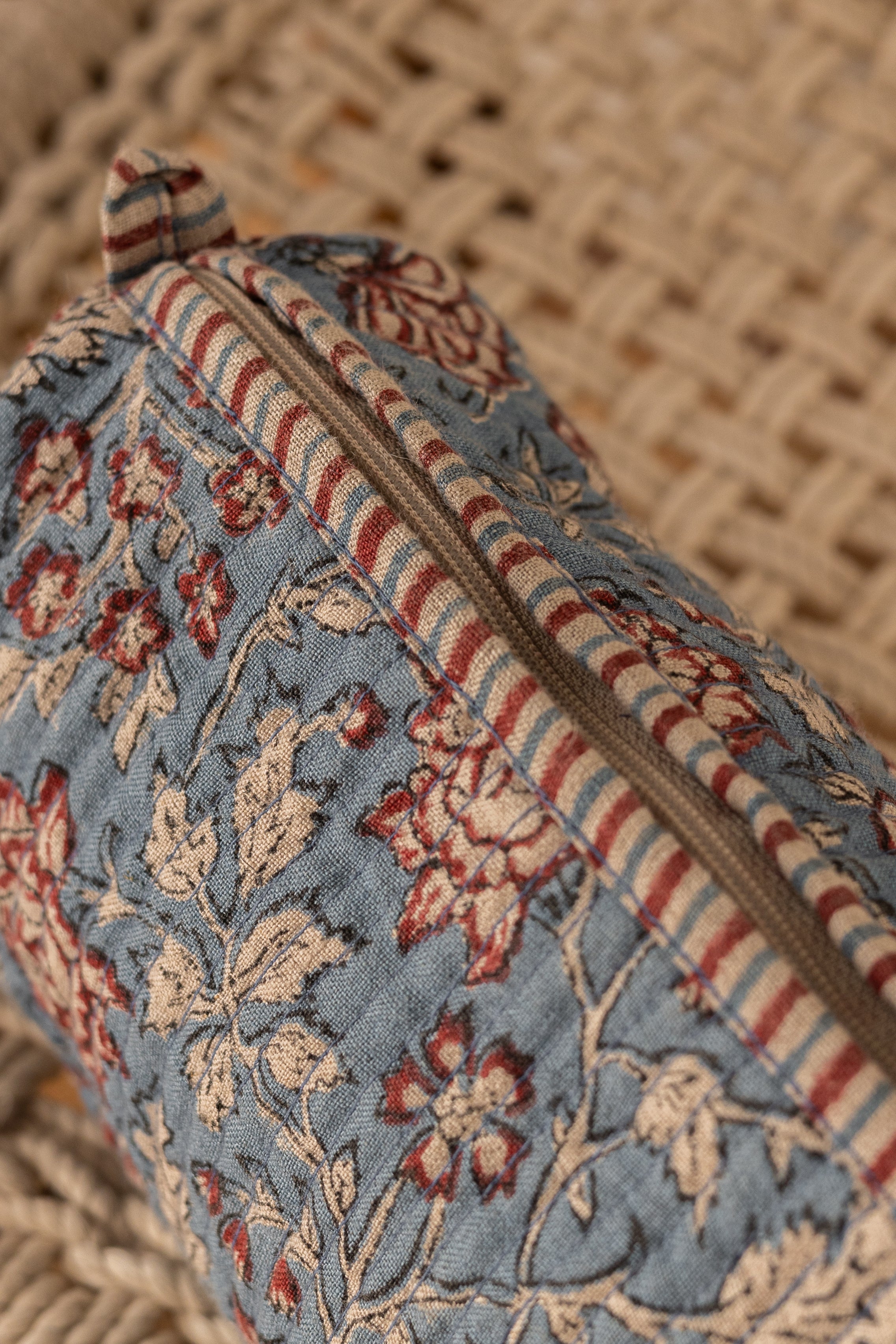 Carefully designed floral Block print lightweight Blue and red Linen quilted pouch with durable quilted exterior which protects your essentials and make it easy to carry. A smooth, high-quality zip finished with a handcrafted fabric tassel pull. Inside, four mini pockets keep your belongings neatly organized—perfect for makeup, travel necessities, or everyday must-haves. Compact, spacious, Made to move with you.