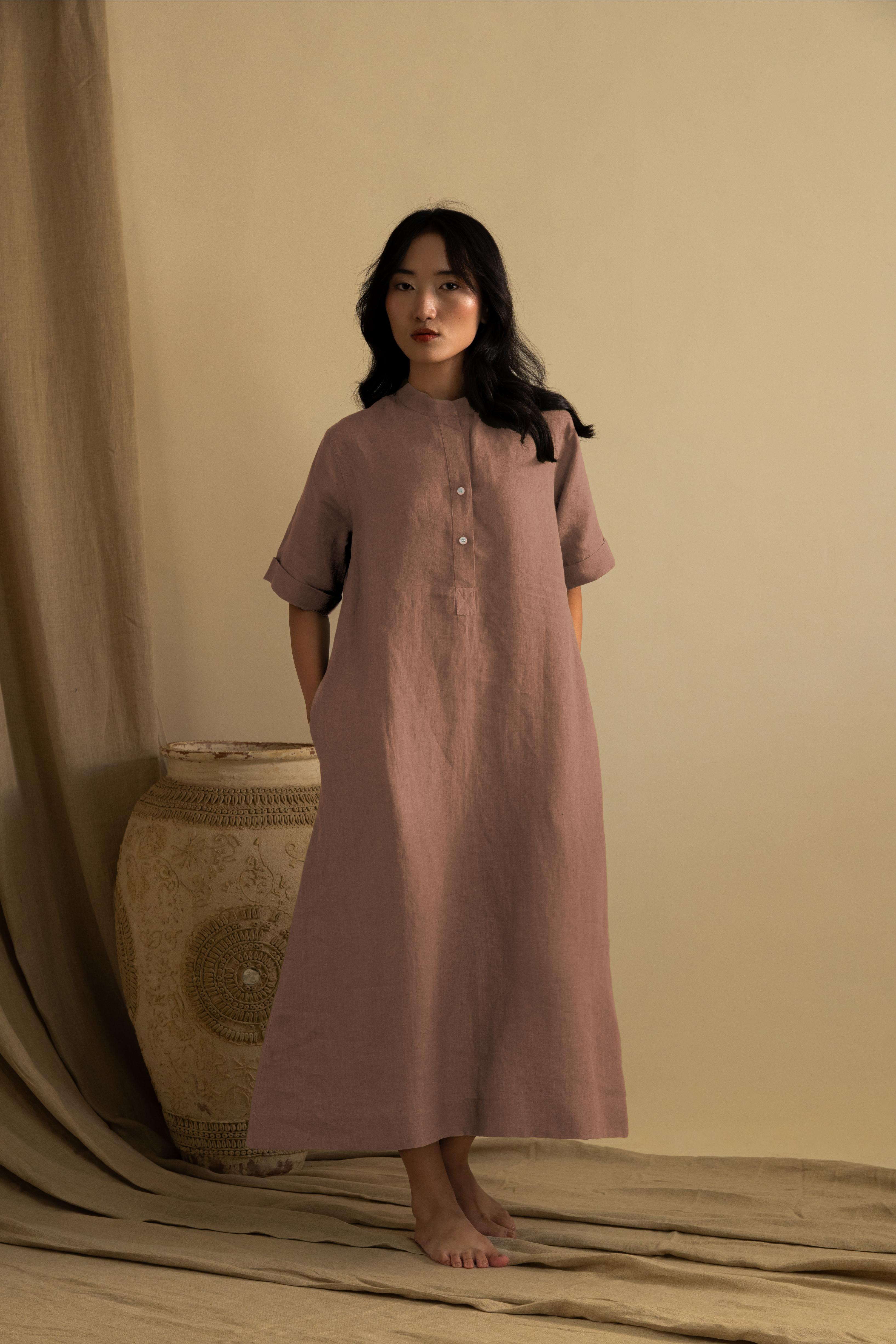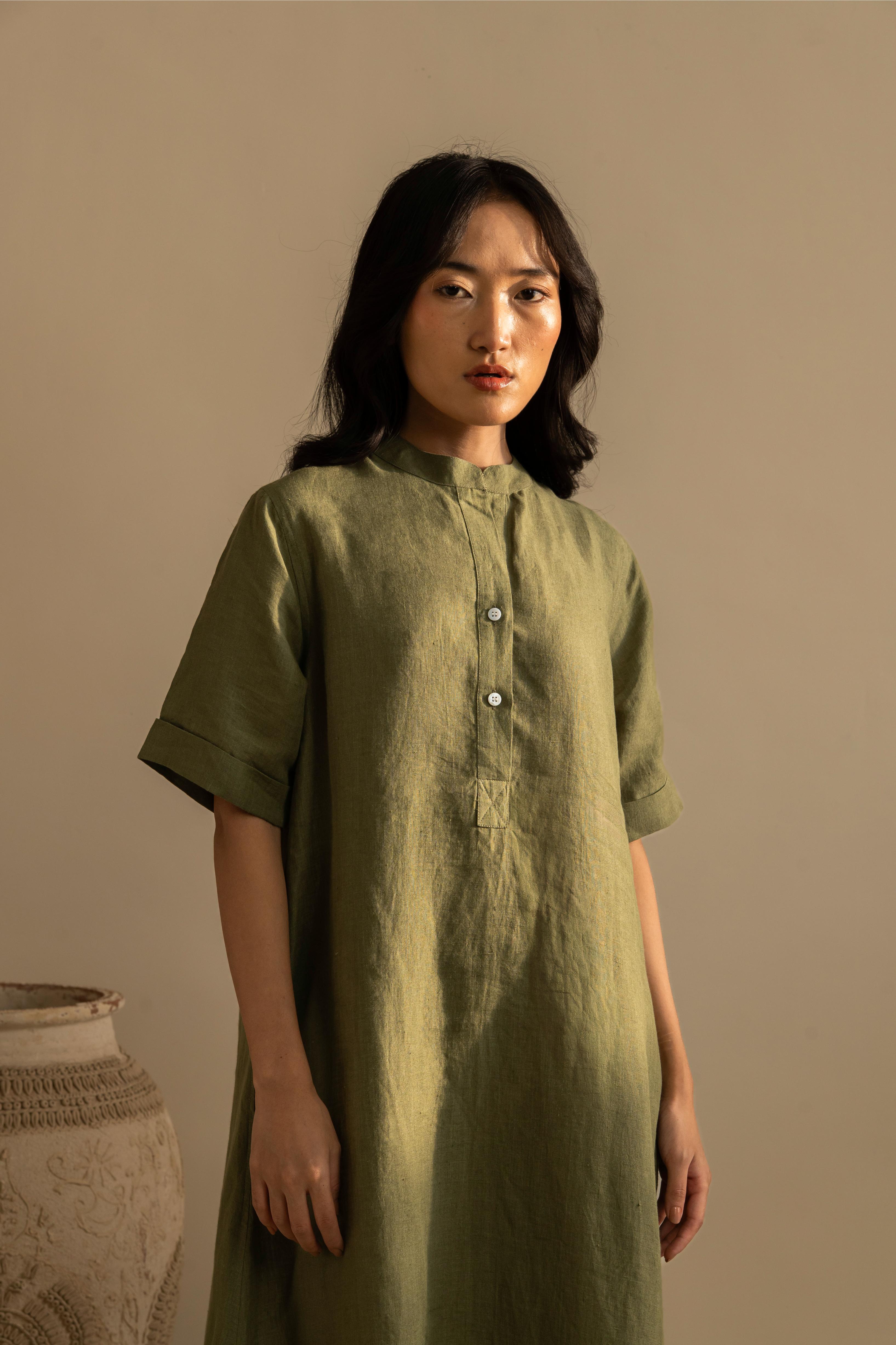 Enchant your wardrobe with the irresistible charm of our Linen Yuri Dress in Midnight Green. This short-sleeve linen dress is a symphony of elegance and grace, featuring a sophisticated mandarin collar and a straight fit that brings a sense of harmony to your look. The delicate shell buttons on the small placket add a sprinkle of enchantment, making this yarn-dyed masterpiece a true delight to wear.